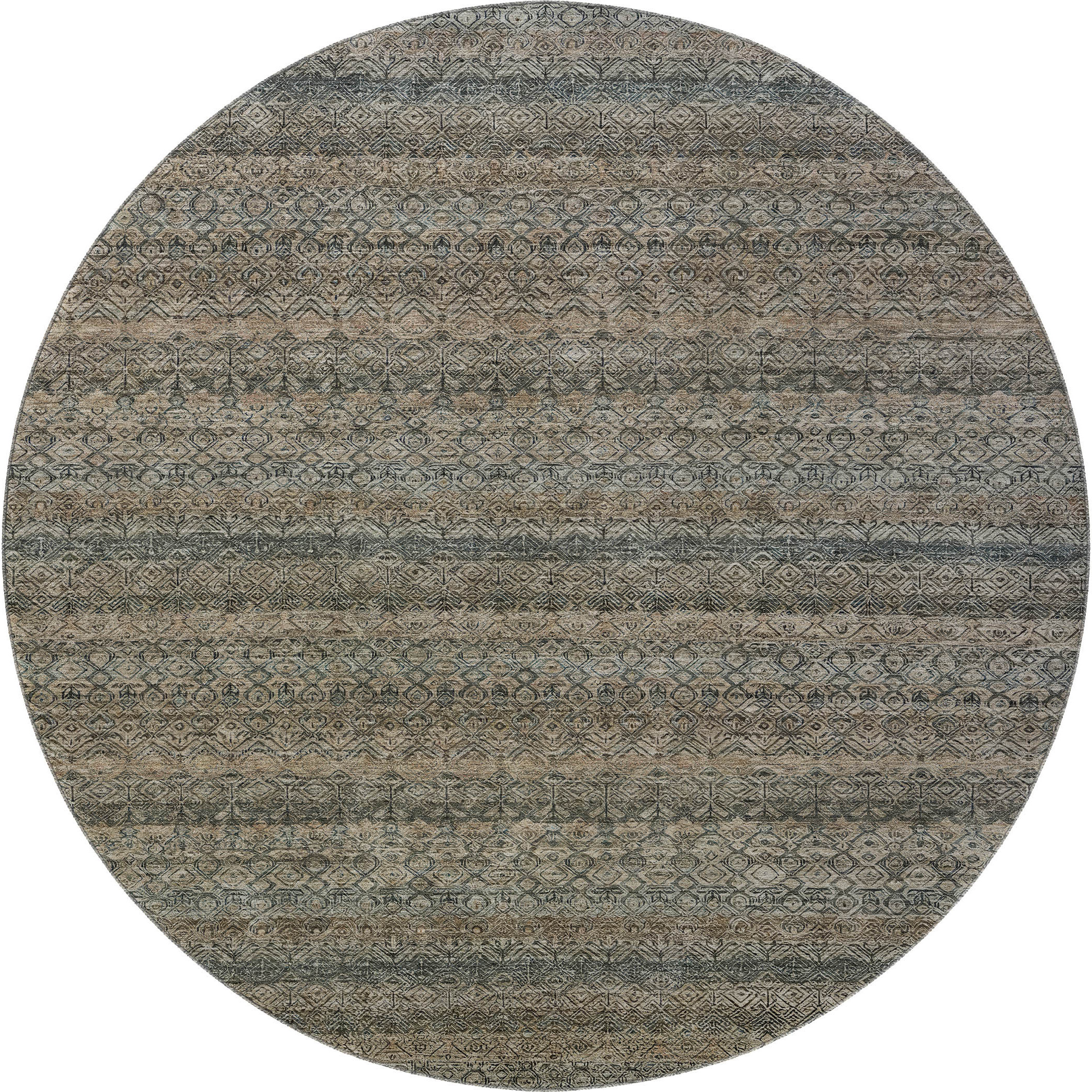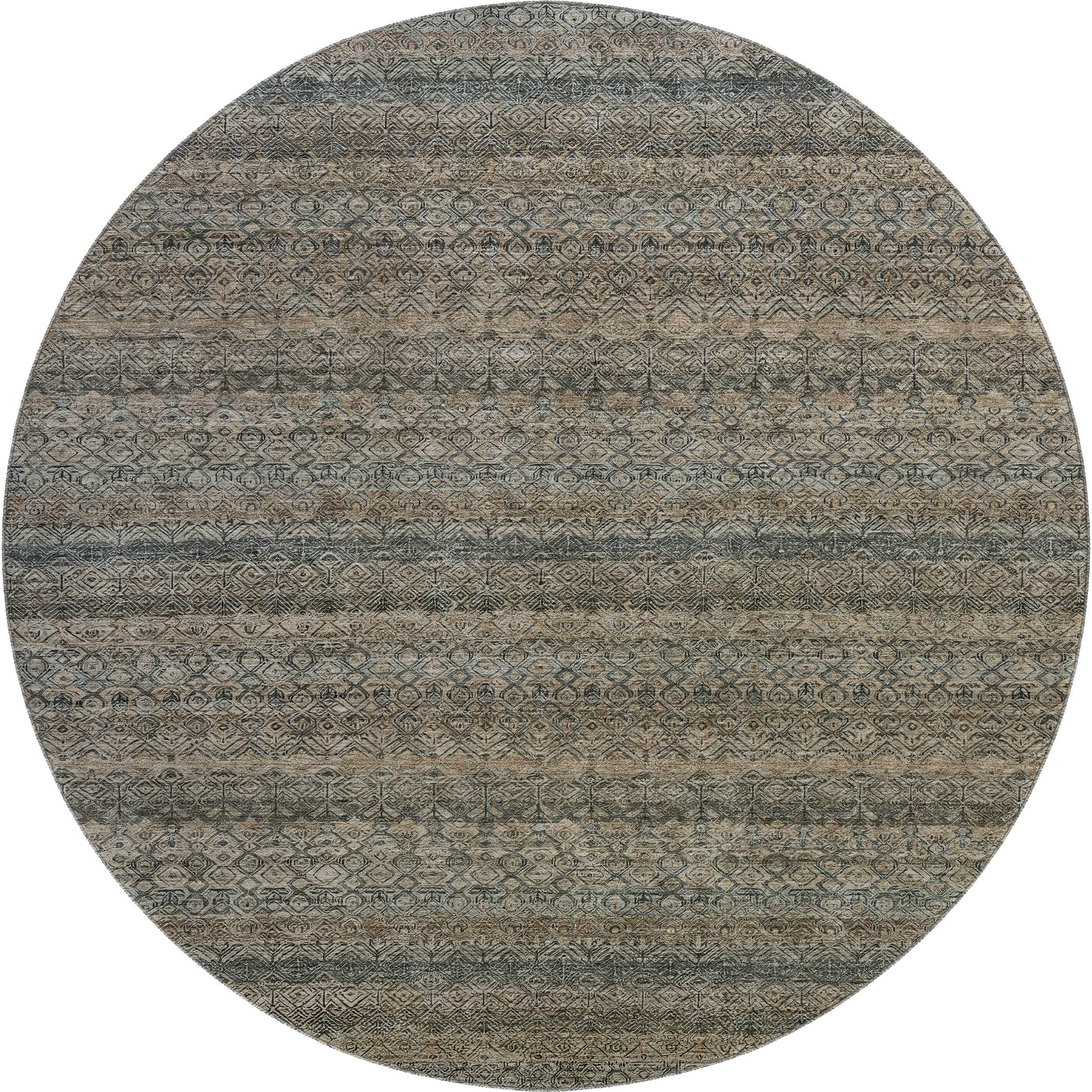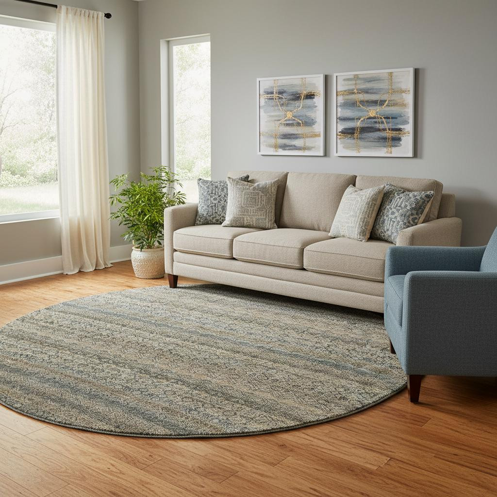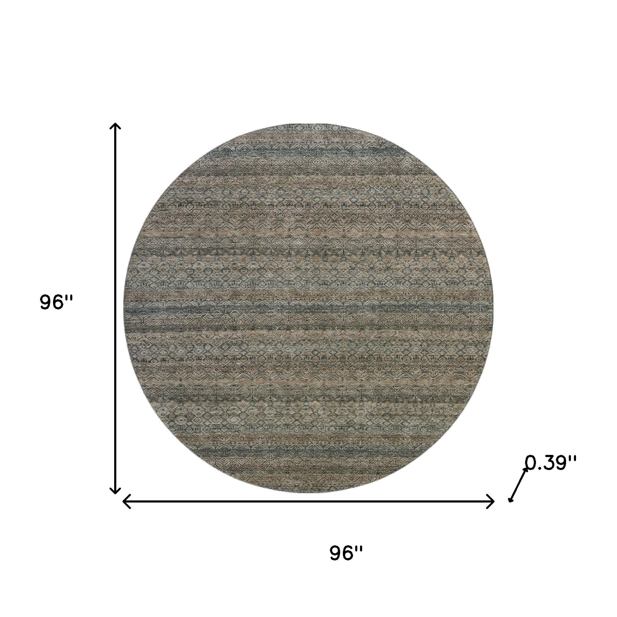 Set an inviting tone in your space with this 8-foot chocolate and gray striped washable round rug with uv protection. Ideal for spaces with kids and pets, this rug is stain resistant to help repel dirt and spilled liquids. Built to last, this rug crafted from polyester fibers is known for its durability and long lasting appeal. Rugs are a great way to showcase your style, hide imperfections, warm your home and reduce noise. This larger sized, transitional styled rug is ready to create a focal point or statement piece in your room. 96.00-inch h x 96.00-inch w x 0.39-inch d.
