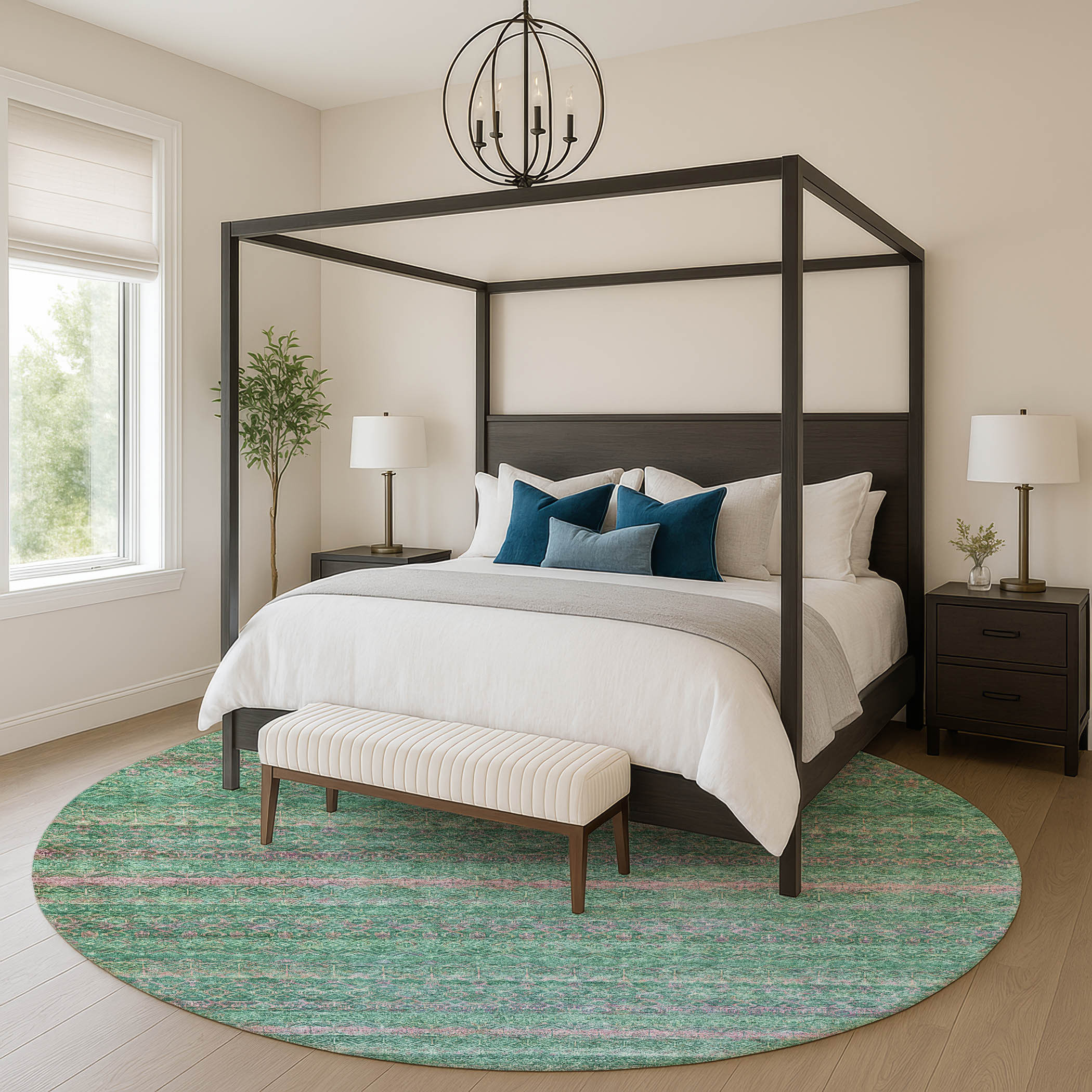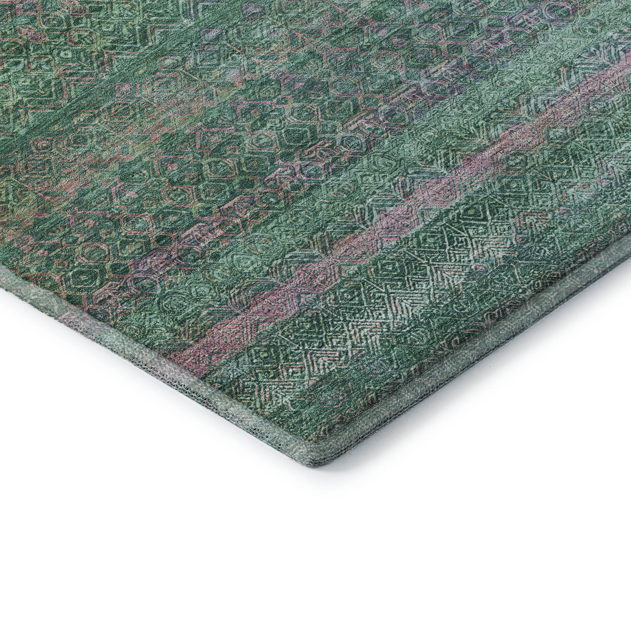 Add great coloration and comfortable texture to your space with this 8-foot green and blush striped washable round rug with uv protection. Ideal for spaces with kids and pets, this rug is stain resistant to help repel dirt and spilled liquids. Built to last, this rug crafted from polyester fibers is known for its durability and long lasting appeal. Rugs are a great way to showcase your style, hide imperfections, warm your home and reduce noise. This larger sized, transitional styled rug is ready to create a focal point or statement piece in your room. 96.00-inch h x 96.00-inch w x 0.39-inch d.