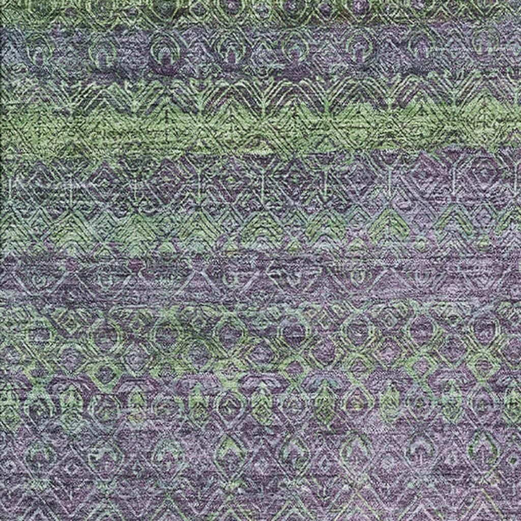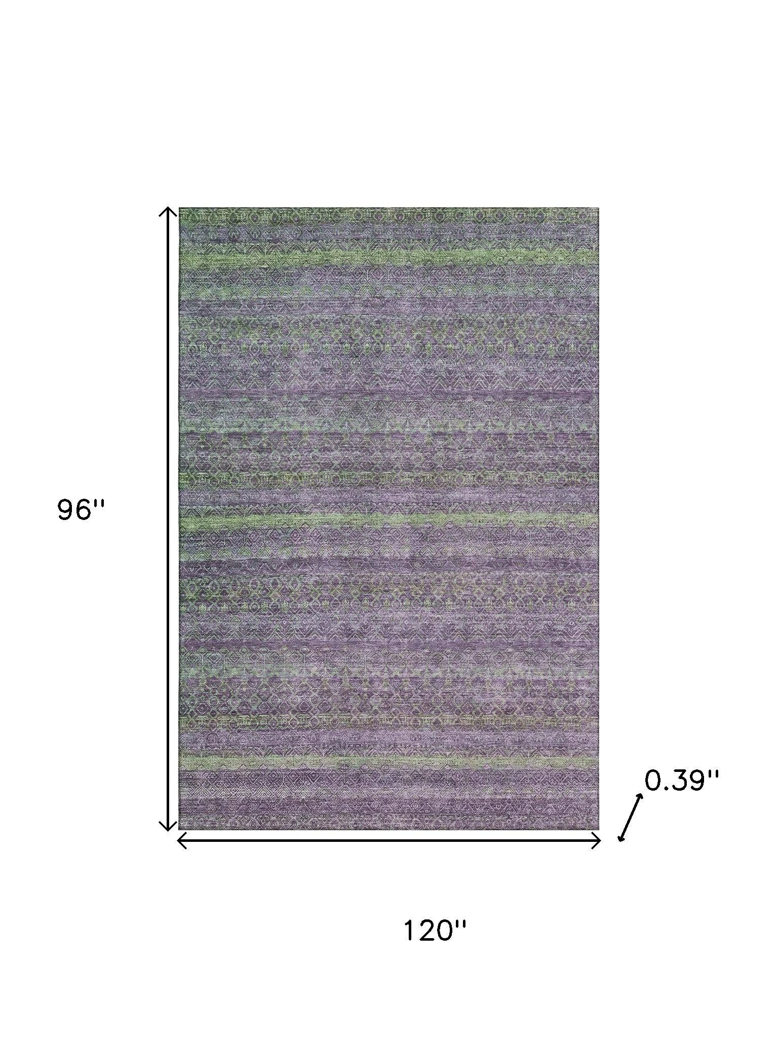 Add some artistry to your room with this 8-foot x 10-foot purple and green striped washable area rug with uv protection. Ideal for spaces with kids and pets, this rug is stain resistant to help repel dirt and spilled liquids. Built to last, this rug crafted from polyester fibers is known for its durability and long lasting appeal. Rugs are a great way to showcase your style, hide imperfections, warm your home and reduce noise. This larger sized, transitional styled rug is ready to create a focal point or statement piece in your room. 96.00-inch h x 120.00-inch w x 0.39-inch d.