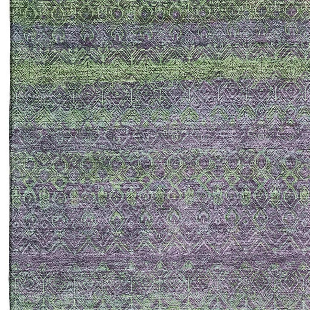 This 9-foot x 12-foot purple and green striped washable area rug with uv protection, is a great way to add warmth to a room. Ideal for spaces with kids and pets, this rug is stain resistant to help repel dirt and spilled liquids. Built to last, this rug crafted from polyester fibers is known for its durability and long lasting appeal. Rugs are a great way to showcase your style, hide imperfections, warm your home and reduce noise. This larger sized, transitional styled rug is ready to create a focal point or statement piece in your room. 108.00-inch h x 144.00-inch w x 0.39-inch d.
