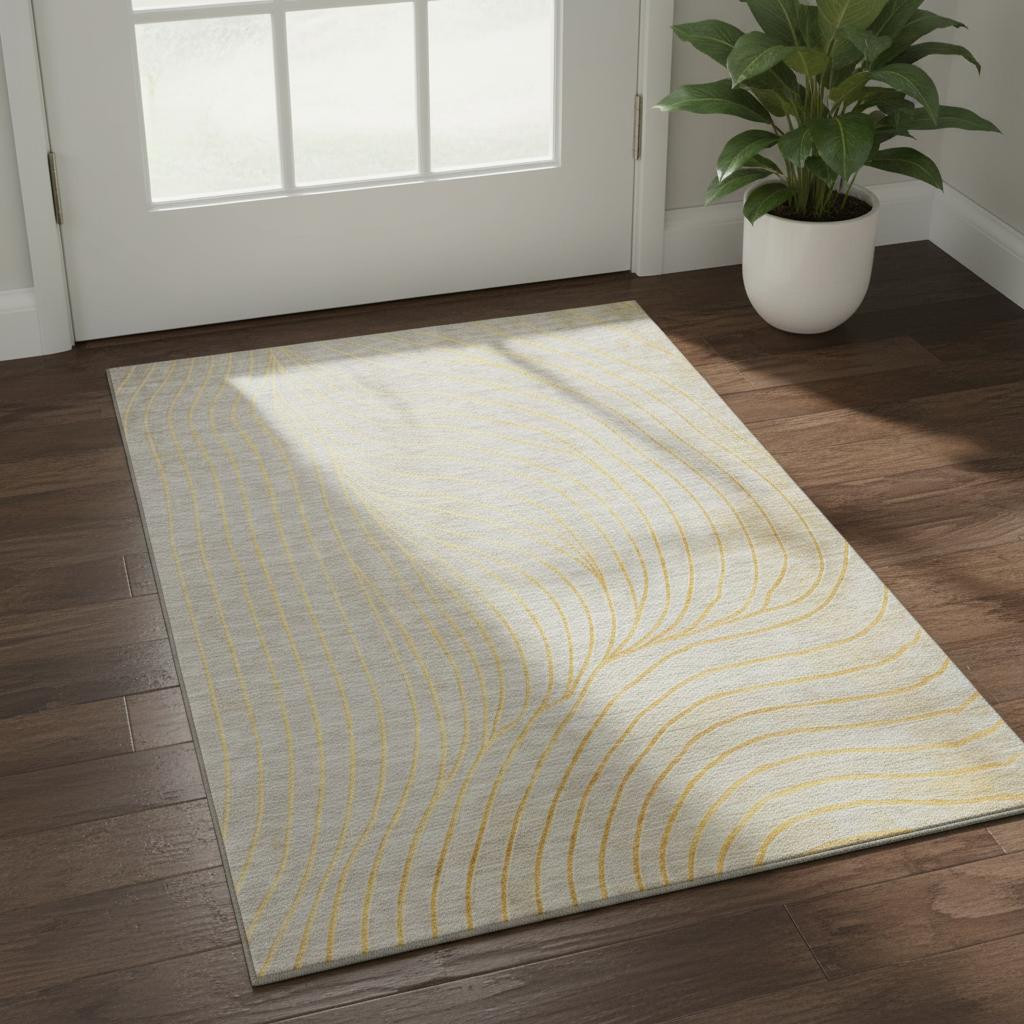 Add great coloration and comfortable texture to your space with this 3-foot x 5-foot gold and silver abstract washable area rug with uv protection. Ideal for spaces with kids and pets, this rug is stain resistant to help repel dirt and spilled liquids. Built to last, this rug crafted from polyester fibers is known for its durability and long lasting appeal. Rugs are a great way to showcase your style, hide imperfections, warm your home and reduce noise. This smaller sized, transitional styled rug is just what you need for your walkway, bedside, in front of door, cabinet, refrigerator, or chair. 36.00-inch h x 60.00-inch w x 0.39-inch d.