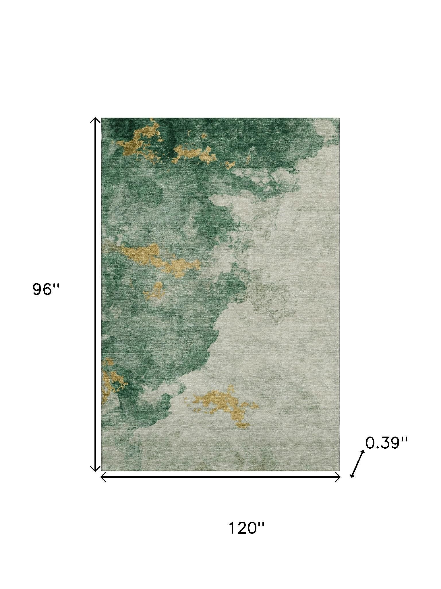 Add some artistry to your room with this 8-foot x 10-foot emerald and gold abstract washable area rug with uv protection. Ideal for spaces with kids and pets, this rug is stain resistant to help repel dirt and spilled liquids. Built to last, this rug crafted from polyester fibers is known for its durability and long lasting appeal. Rugs are a great way to showcase your style, hide imperfections, warm your home and reduce noise. This larger sized, transitional styled rug is ready to create a focal point or statement piece in your room. 96.00-inch h x 120.00-inch w x 0.39-inch d.
