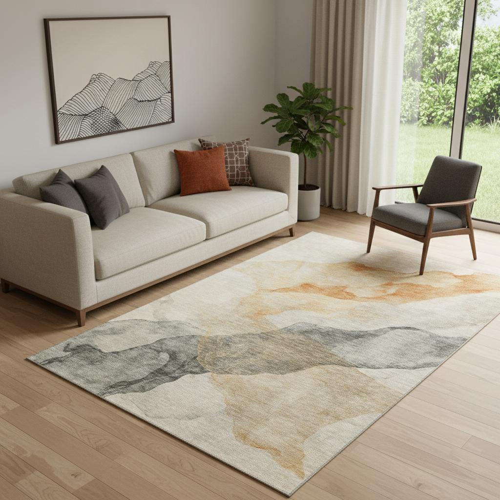 Add some artistry to your room with this 5-foot x 8-foot orange and gray abstract washable area rug with uv protection. Ideal for spaces with kids and pets, this rug is stain resistant to help repel dirt and spilled liquids. Built to last, this rug crafted from polyester fibers is known for its durability and long lasting appeal. Rugs are a great way to showcase your style, hide imperfections, warm your home and reduce noise. This larger sized, transitional styled rug is ready to create a focal point or statement piece in your room. 60.00-inch h x 90.00-inch w x 0.39-inch d.