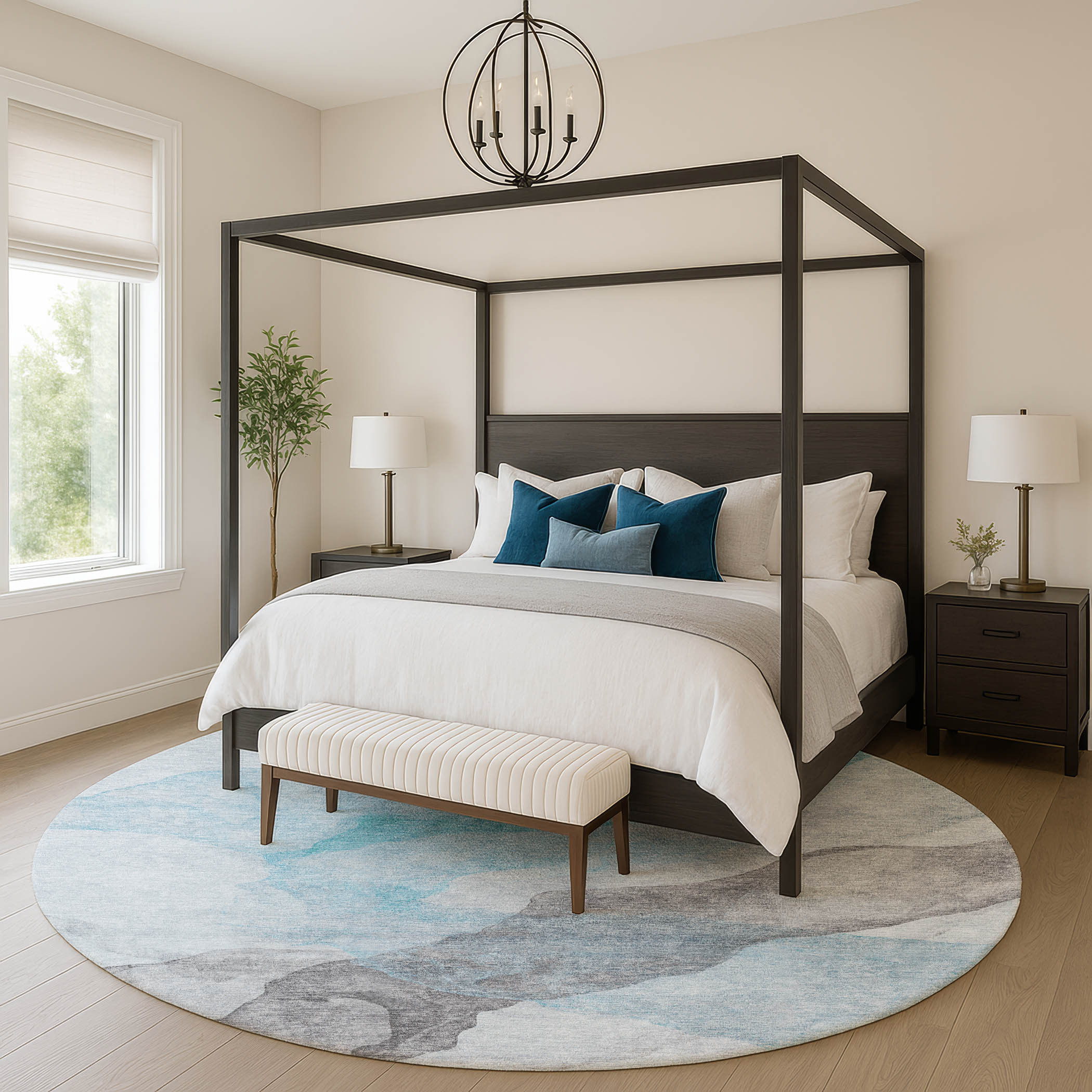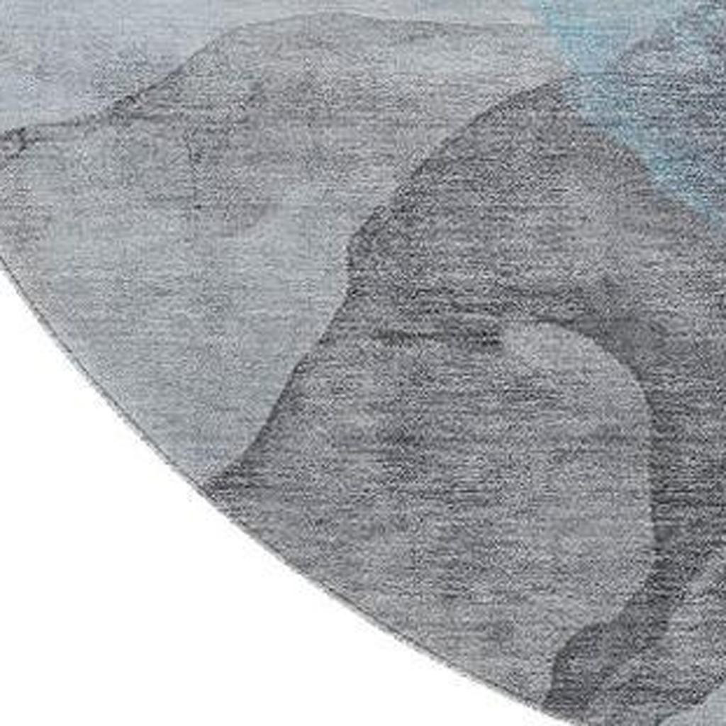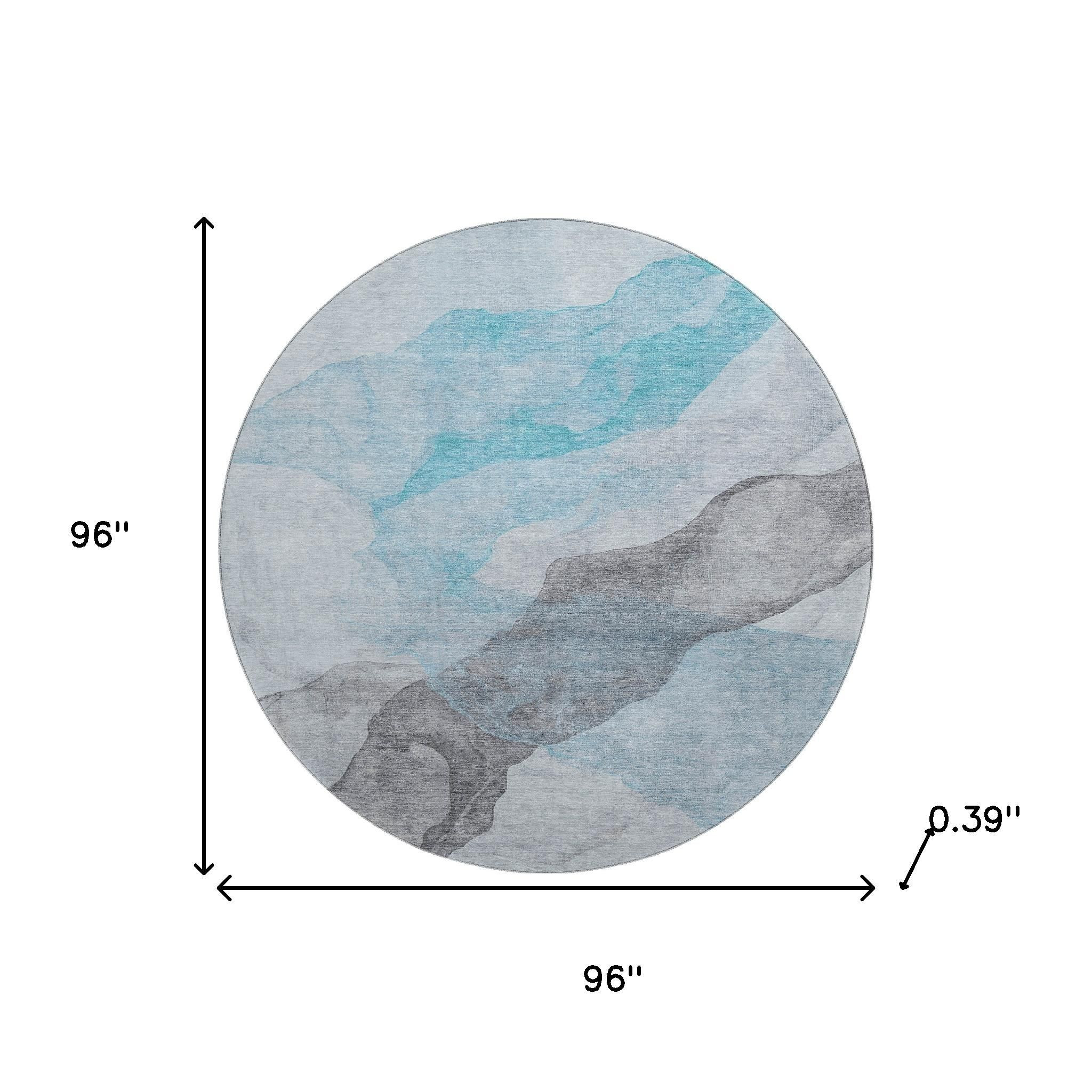 Set an inviting tone in your space with this 8-foot teal and gray abstract washable round rug with uv protection. Ideal for spaces with kids and pets, this rug is stain resistant to help repel dirt and spilled liquids. Built to last, this rug crafted from polyester fibers is known for its durability and long lasting appeal. Rugs are a great way to showcase your style, hide imperfections, warm your home and reduce noise. This larger sized, transitional styled rug is ready to create a focal point or statement piece in your room. 96.00-inch h x 96.00-inch w x 0.39-inch d.