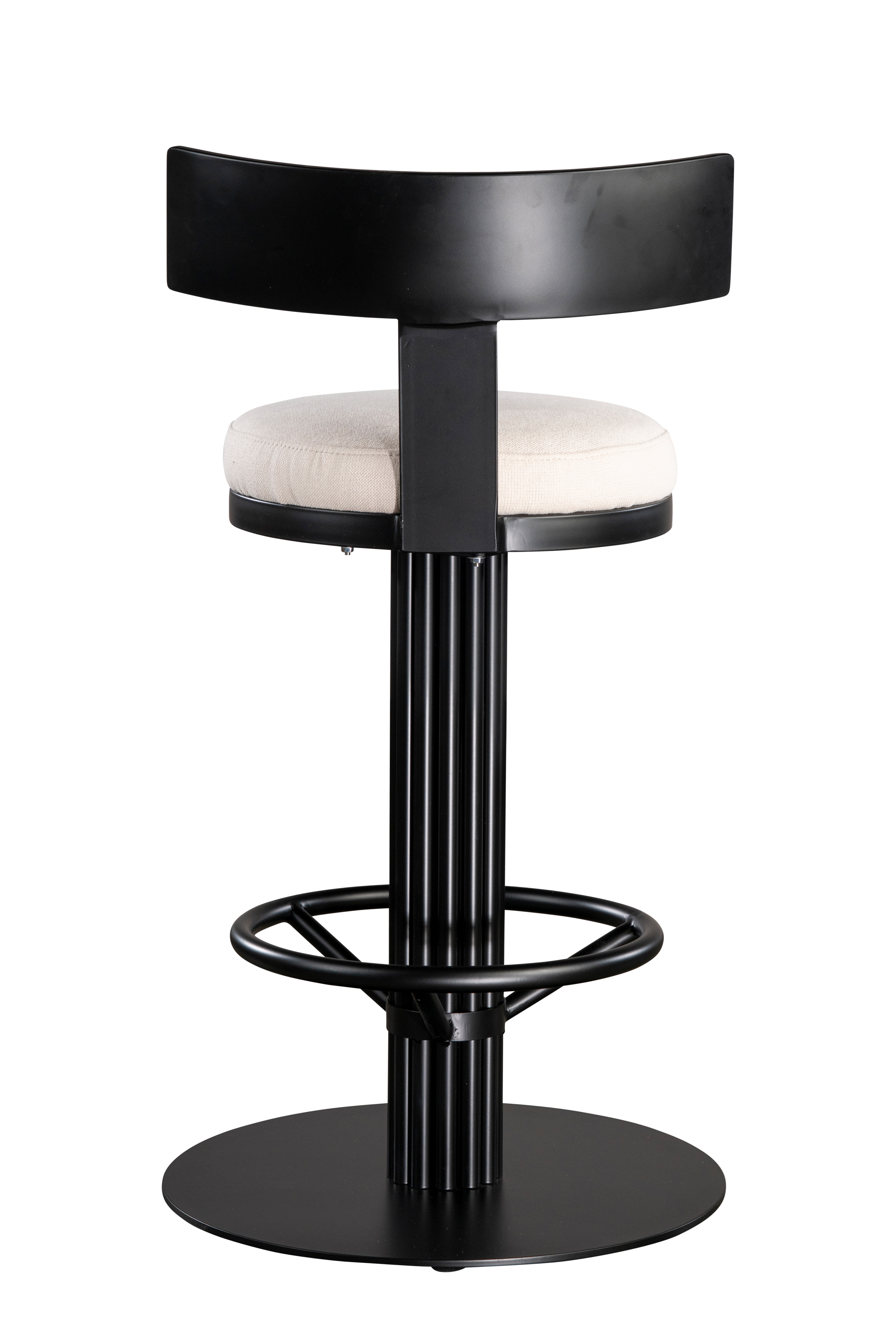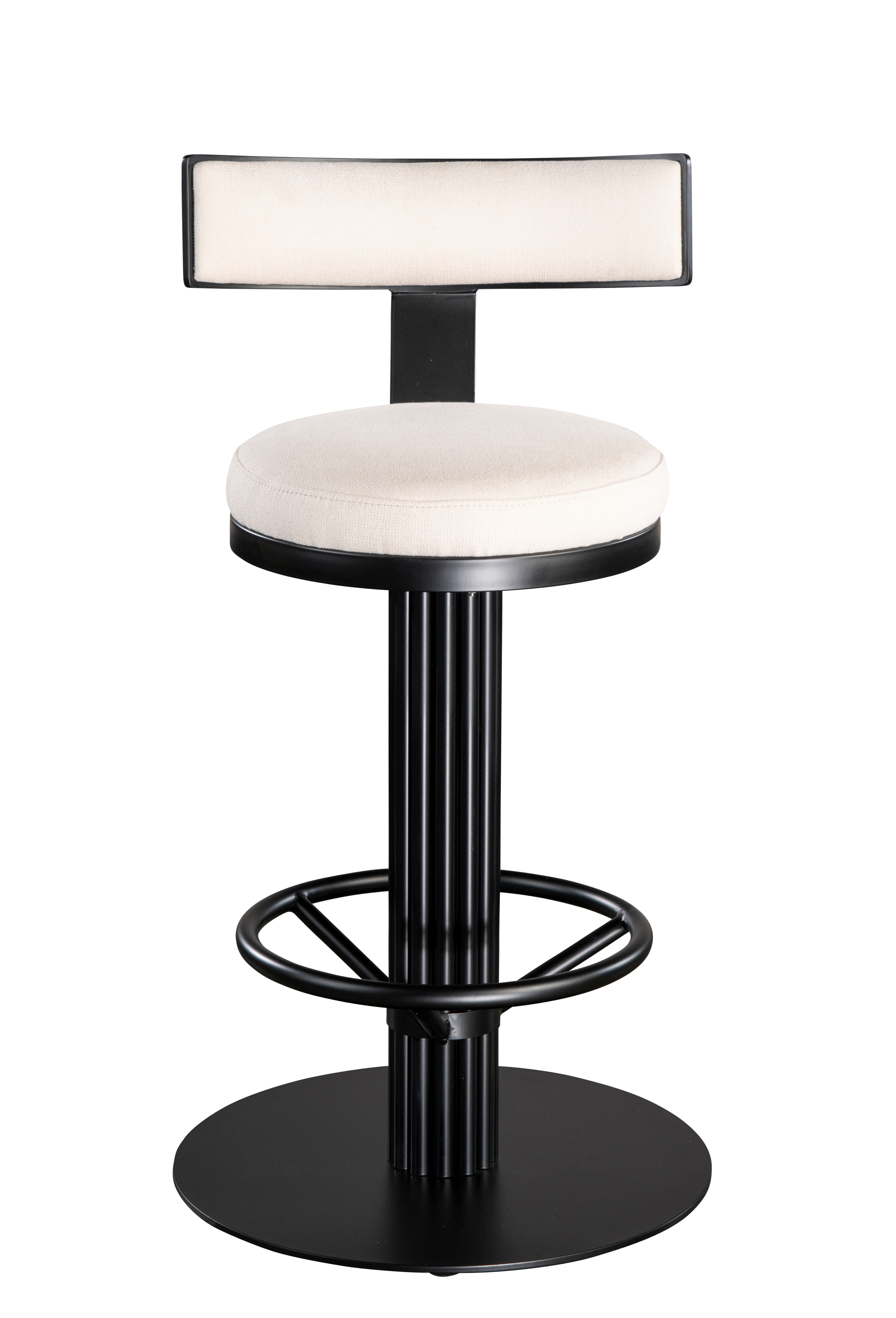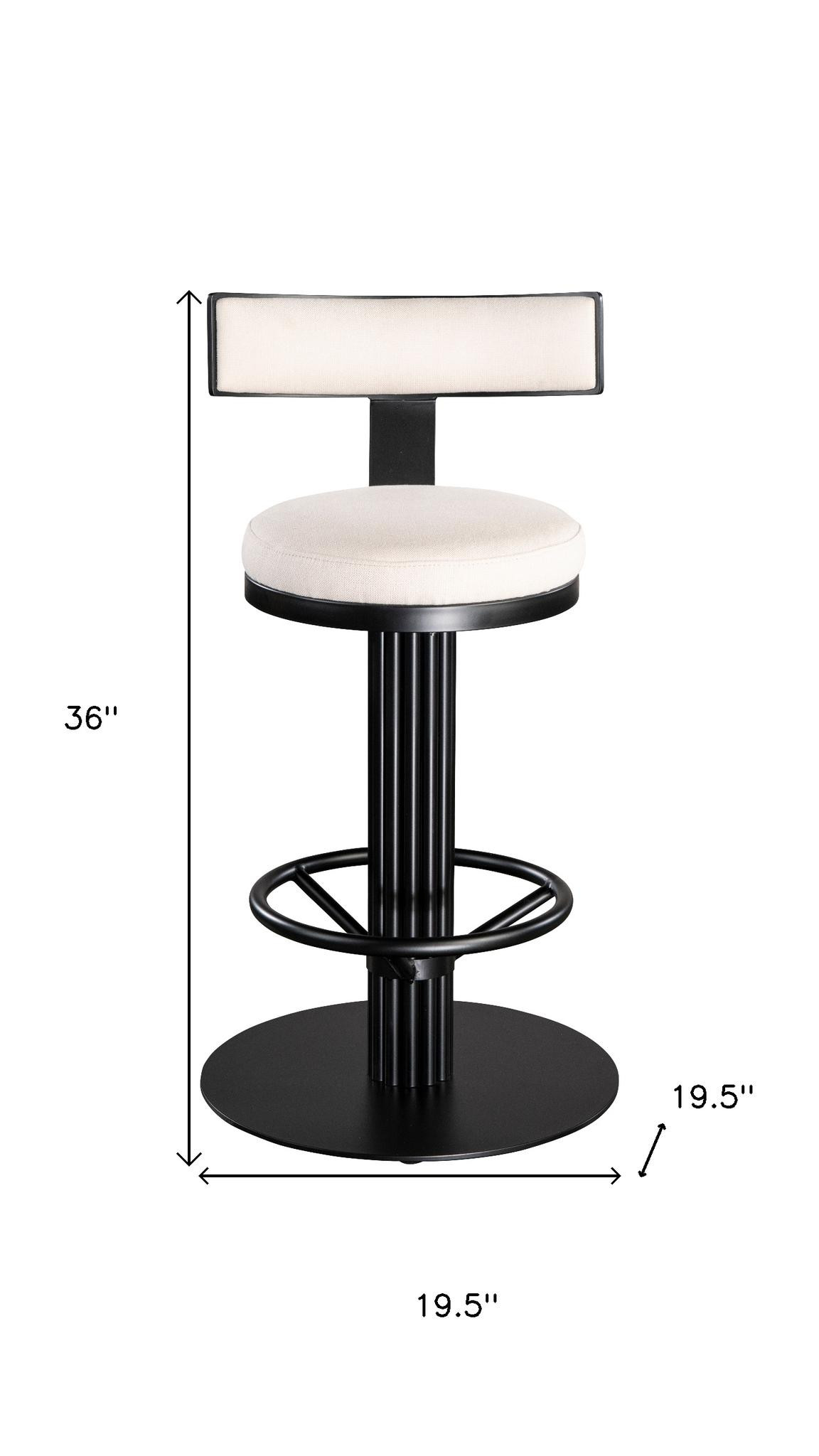 Comfortable enough to sit in for awhile, this 26-inch white and black linen and steel counter height swivel bar chair will transcend the look of your room. The base of this stool is made from stainless steel in a black color that is a nice contrast to the white linen seat. A partial rectangular back mixed with a round shaped seat design makes this chair both comfortable and fashionable. 36.00-inch h x 19.50-inch w x 19.50-inch d.