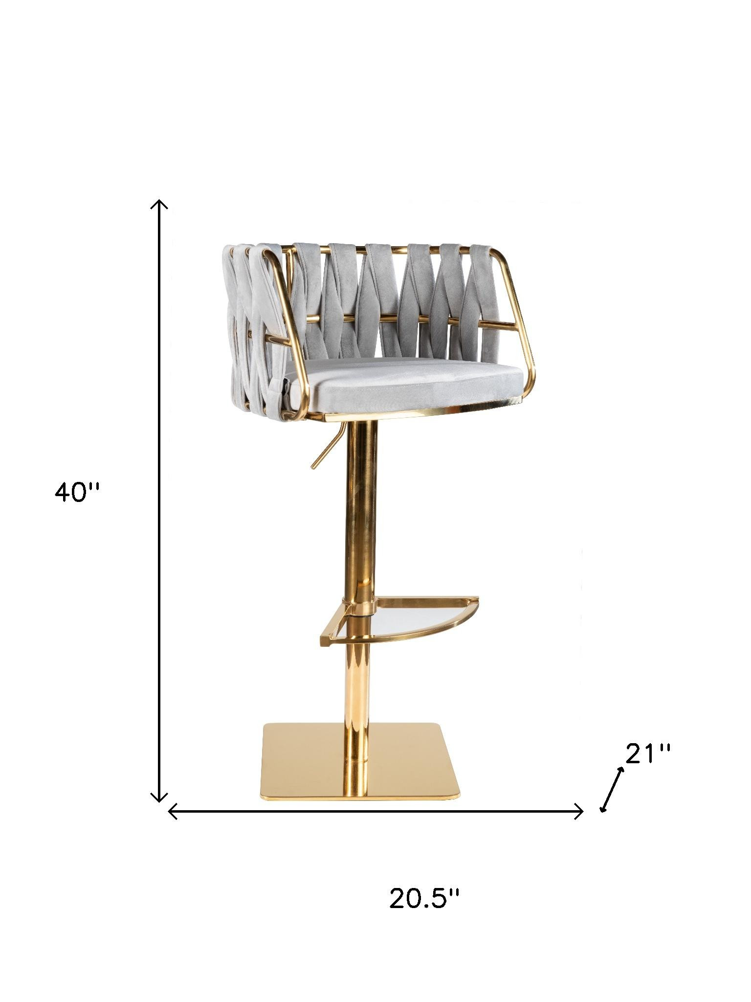 Comfortable enough to sit in for awhile, this gray and gold velvet and steel low back adjustable height swivel bar chair will transcend the look of your room. A gold stainless steel frame is finished off with a gray velvet seat that is the epitome of quality construction and design. A low back mixed with a curved bucket shaped seat design makes this chair both comfortable and fashionable. 40.00-inch h x 20.50-inch w x 21.00-inch d.