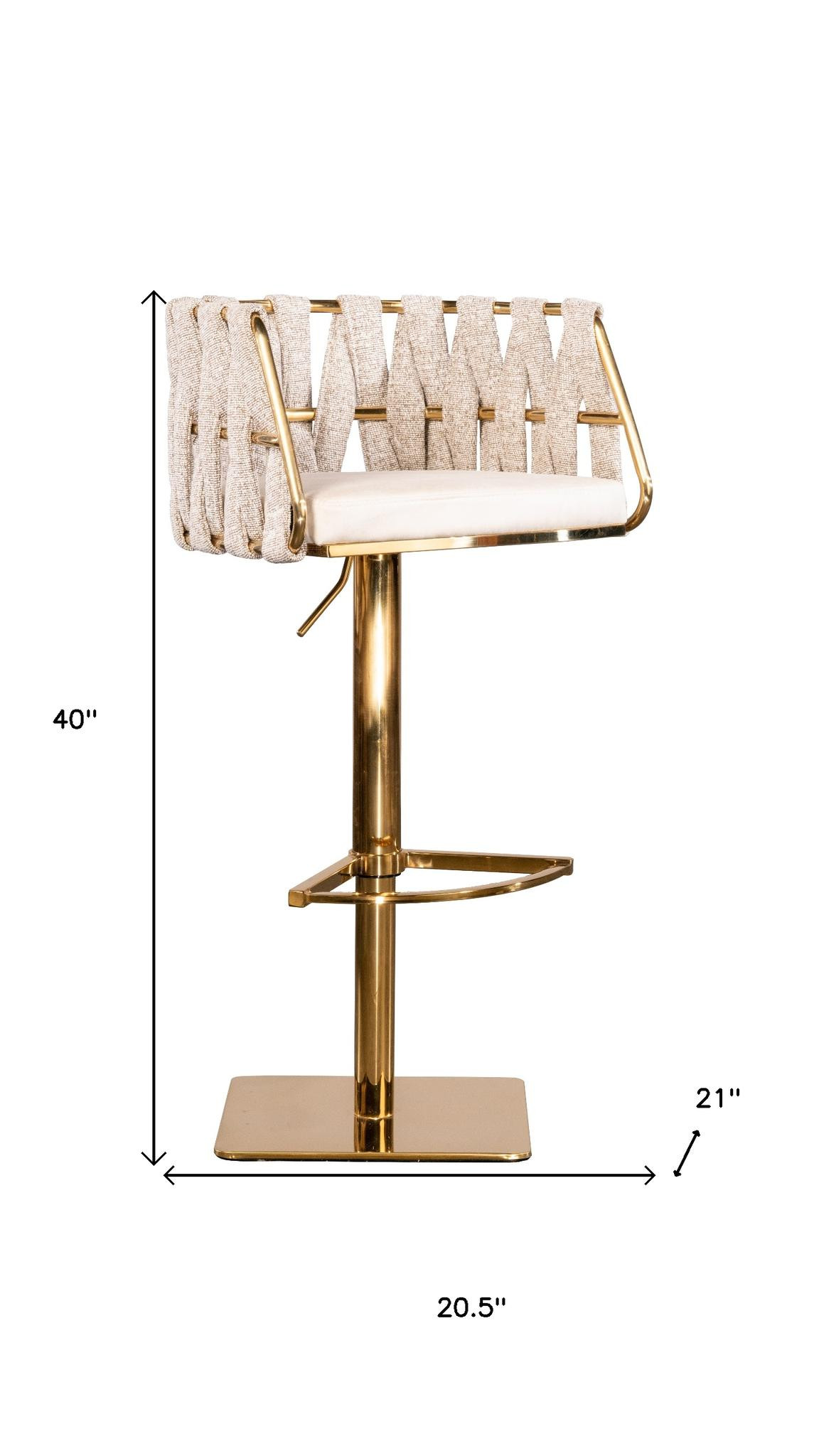 The perfect way to add some extra seating in your home, this off white and gold faux leather linen and steel low back adjustable height swivel bar chair will elevate the look and vibe of your room. A gold stainless steel frame is finished off with a off white faux leather seat that is the epitome of quality construction and design. A low back mixed with a curved bucket shaped seat design makes this chair both comfortable and fashionable. 40.00-inch h x 20.50-inch w x 21.00-inch d.