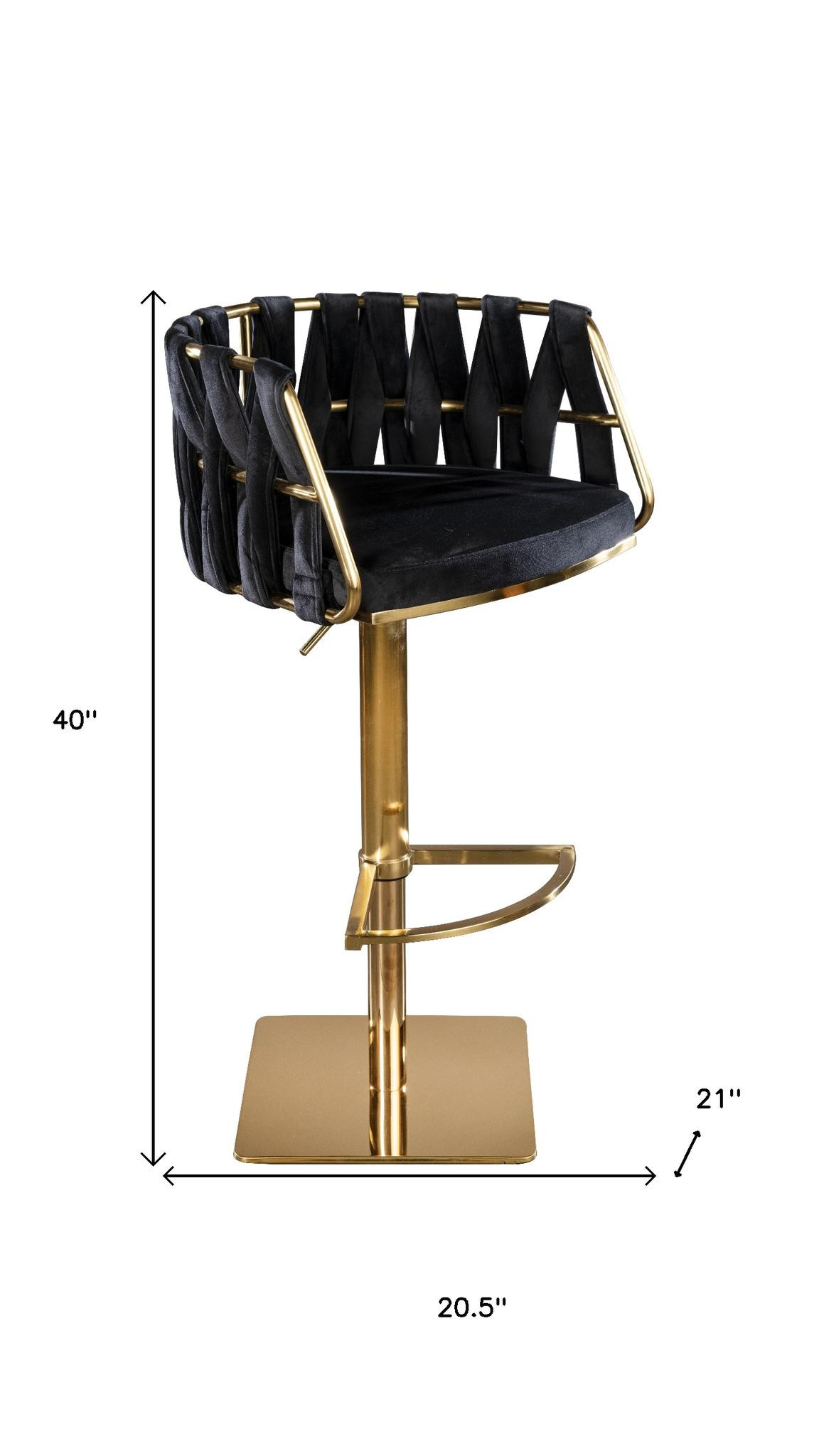 Comfortable enough to sit in for awhile, this black and gold velvet and steel low back adjustable height swivel bar chair will transcend the look of your room. The base of this stool is made from stainless steel in a gold color that is a nice contrast to the black velvet seat. Not only good looking and stylish, this chair features a bucket shaped seat and a low back for the ultimate in comfort and enjoyment. 40.00-inch h x 20.50-inch w x 21.00-inch d.