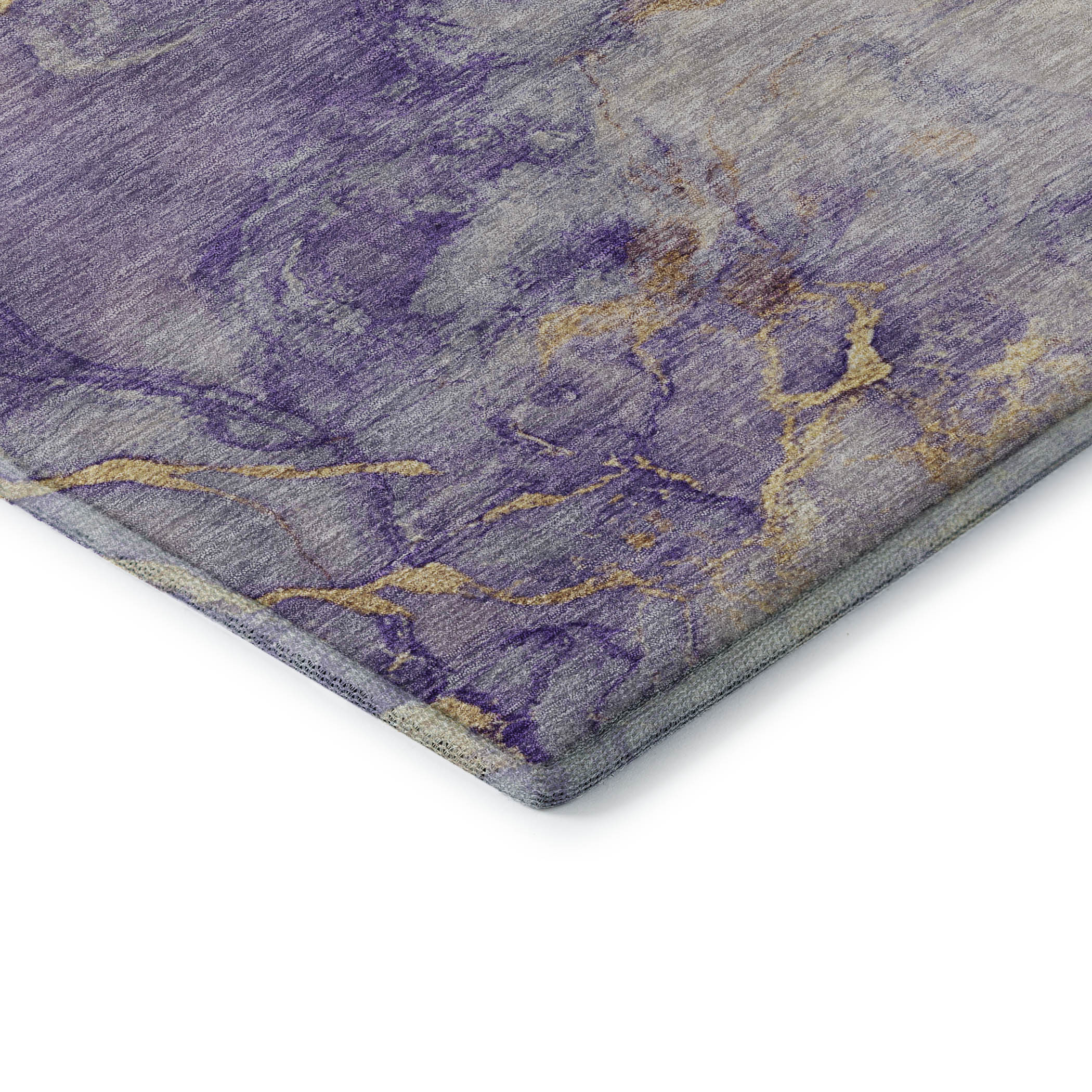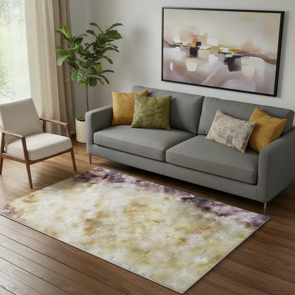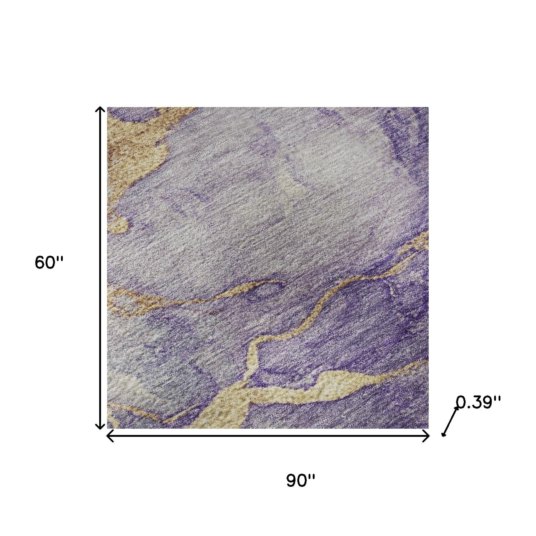 Add great coloration and comfortable texture to your space with this 5-foot x 8-foot purple and gold abstract washable area rug with uv protection. Ideal for spaces with kids and pets, this rug is stain resistant to help repel dirt and spilled liquids. Built to last, this rug crafted from polyester fibers is known for its durability and long lasting appeal. Rugs are a great way to showcase your style, hide imperfections, warm your home and reduce noise. This larger sized, transitional styled rug is ready to create a focal point or statement piece in your room. 60.00-inch h x 90.00-inch w x 0.39-inch d.