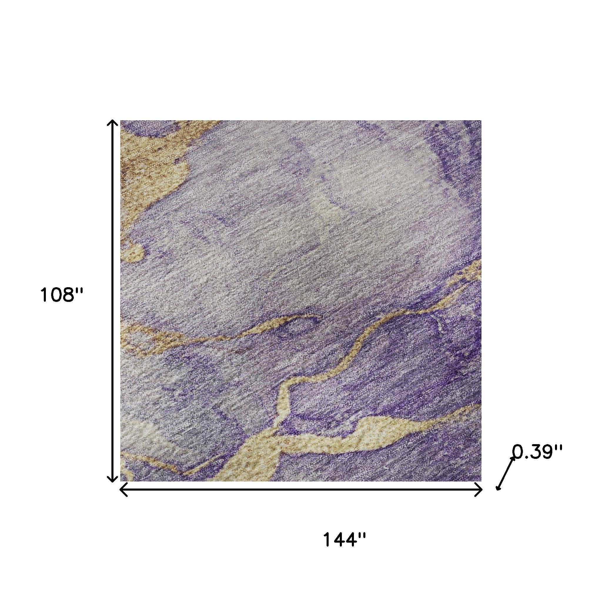 Add great coloration and comfortable texture to your space with this 9-foot x 12-foot purple and gold abstract washable area rug with uv protection. Ideal for spaces with kids and pets, this rug is stain resistant to help repel dirt and spilled liquids. Built to last, this rug crafted from polyester fibers is known for its durability and long lasting appeal. Rugs are a great way to showcase your style, hide imperfections, warm your home and reduce noise. This larger sized, transitional styled rug is ready to create a focal point or statement piece in your room. 108.00-inch h x 144.00-inch w x 0.39-inch d.