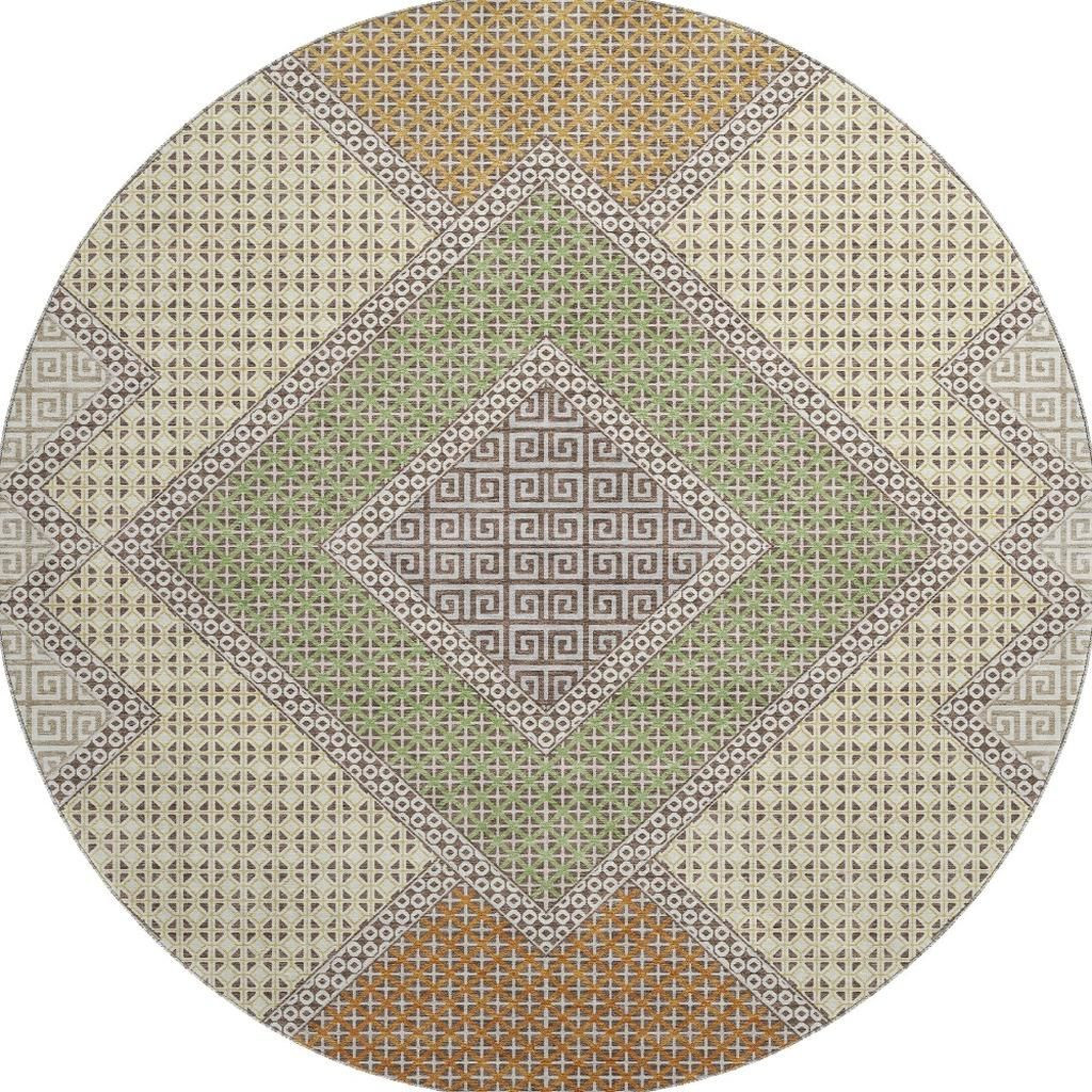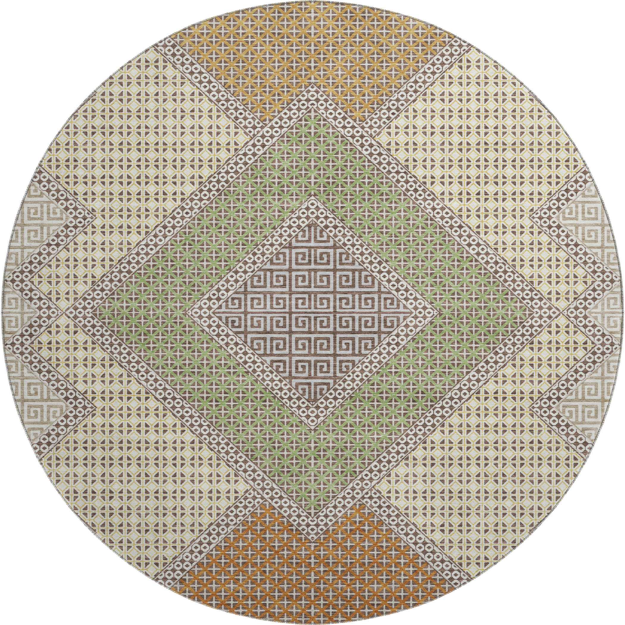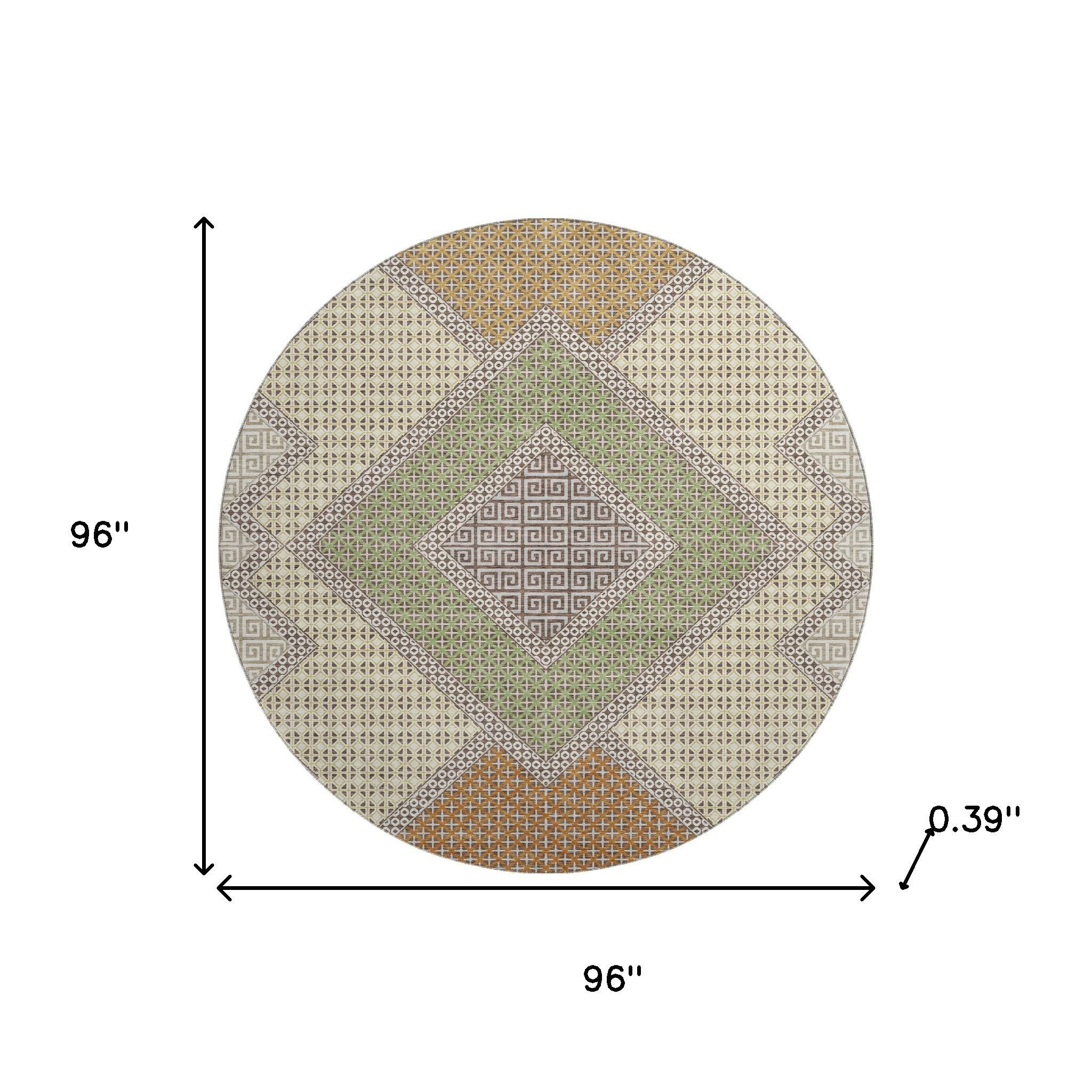 Set an inviting tone in your space with this 8-foot brown and copper geometric washable round rug with uv protection. Ideal for spaces with kids and pets, this rug is stain resistant to help repel dirt and spilled liquids. Built to last, this rug crafted from polyester fibers is known for its durability and long lasting appeal. Rugs are a great way to showcase your style, hide imperfections, warm your home and reduce noise. This larger sized, transitional styled rug is ready to create a focal point or statement piece in your room. 96.00-inch h x 96.00-inch w x 0.39-inch d.