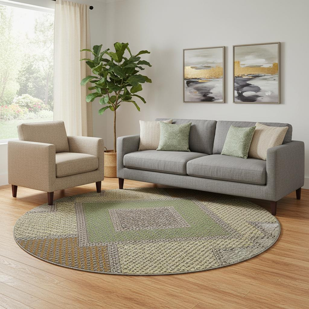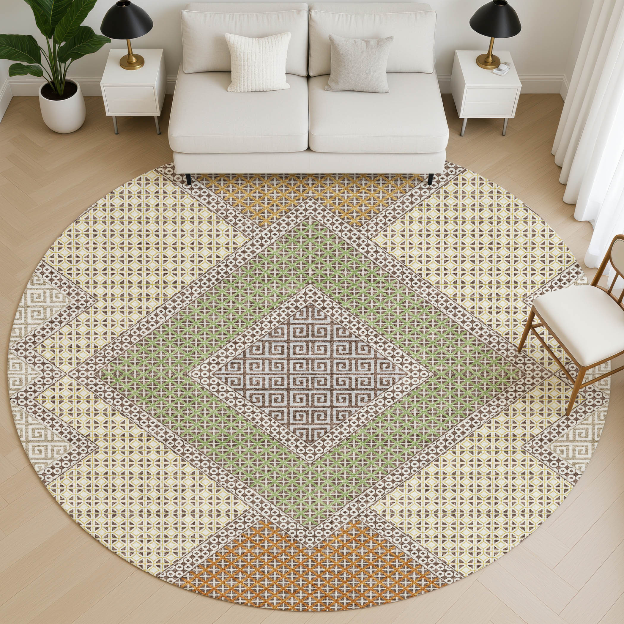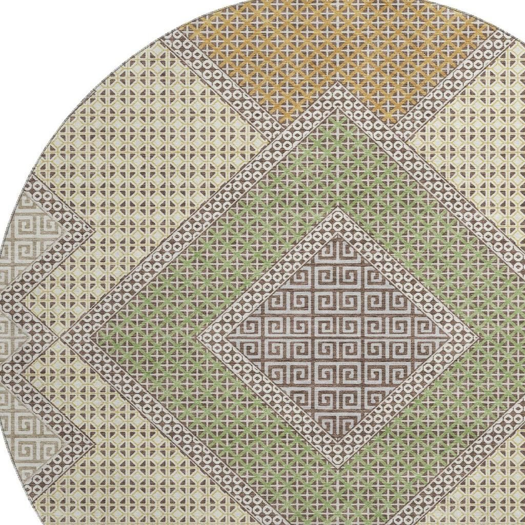 Set an inviting tone in your space with this 8-foot brown and copper geometric washable round rug with uv protection. Ideal for spaces with kids and pets, this rug is stain resistant to help repel dirt and spilled liquids. Built to last, this rug crafted from polyester fibers is known for its durability and long lasting appeal. Rugs are a great way to showcase your style, hide imperfections, warm your home and reduce noise. This larger sized, transitional styled rug is ready to create a focal point or statement piece in your room. 96.00-inch h x 96.00-inch w x 0.39-inch d.