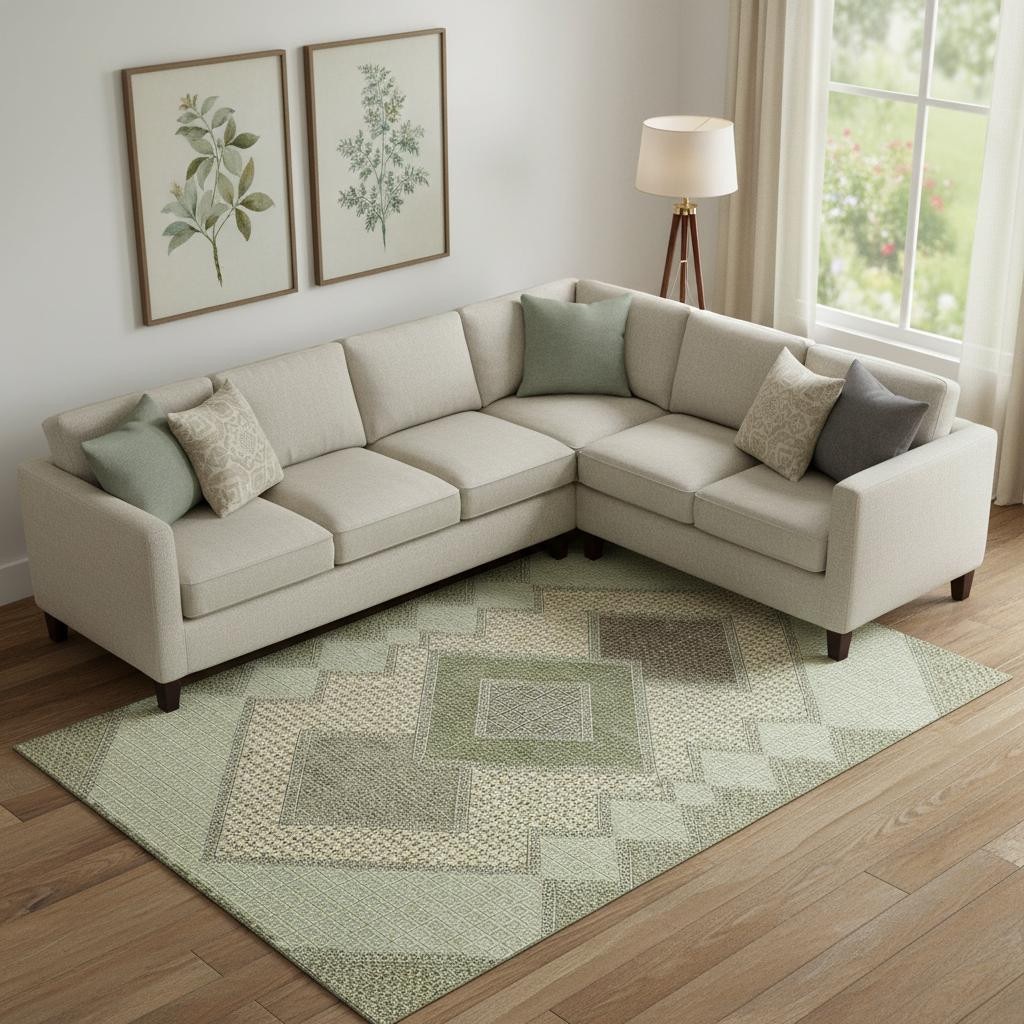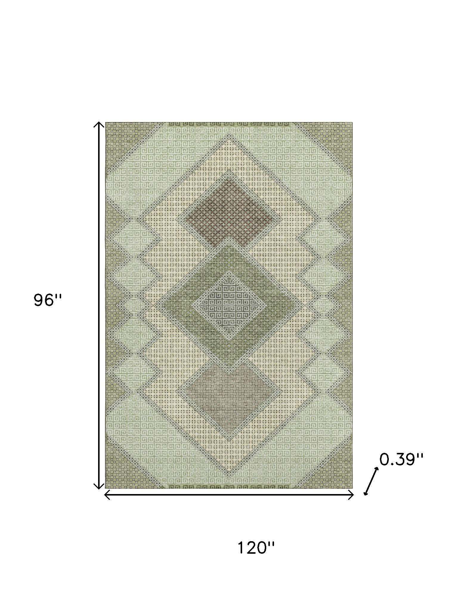 Set an inviting tone in your space with this 8-foot x 10-foot green and gray geometric washable area rug with uv protection. Ideal for spaces with kids and pets, this rug is stain resistant to help repel dirt and spilled liquids. Built to last, this rug crafted from polyester fibers is known for its durability and long lasting appeal. Rugs are a great way to showcase your style, hide imperfections, warm your home and reduce noise. This larger sized, transitional styled rug is ready to create a focal point or statement piece in your room. 96.00-inch h x 120.00-inch w x 0.39-inch d.