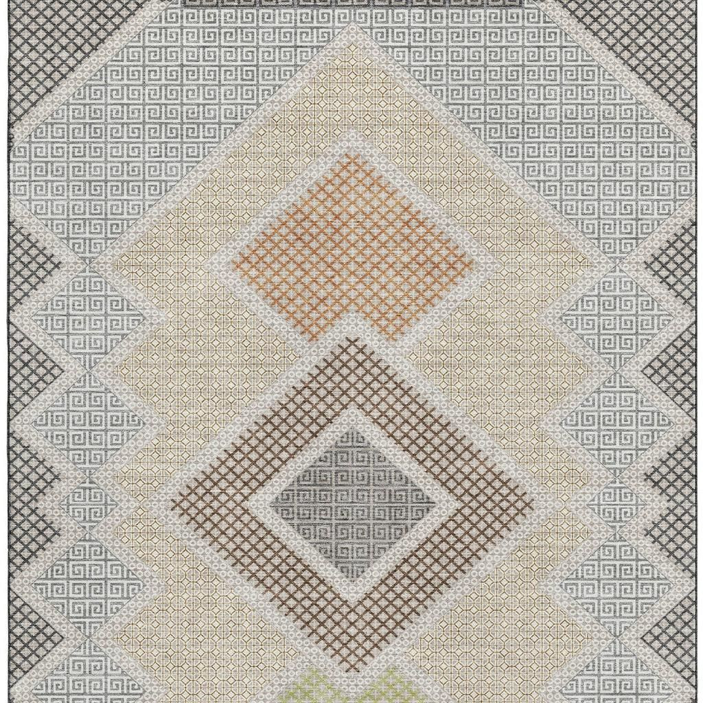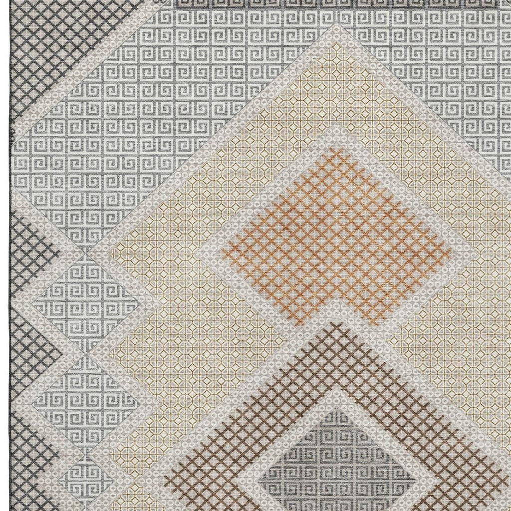 Add some artistry to your room with this 5-foot x 8-foot pewter and copper geometric washable area rug with uv protection. Ideal for spaces with kids and pets, this rug is stain resistant to help repel dirt and spilled liquids. Built to last, this rug crafted from polyester fibers is known for its durability and long lasting appeal. Rugs are a great way to showcase your style, hide imperfections, warm your home and reduce noise. This larger sized, transitional styled rug is ready to create a focal point or statement piece in your room. 60.00-inch h x 90.00-inch w x 0.39-inch d.