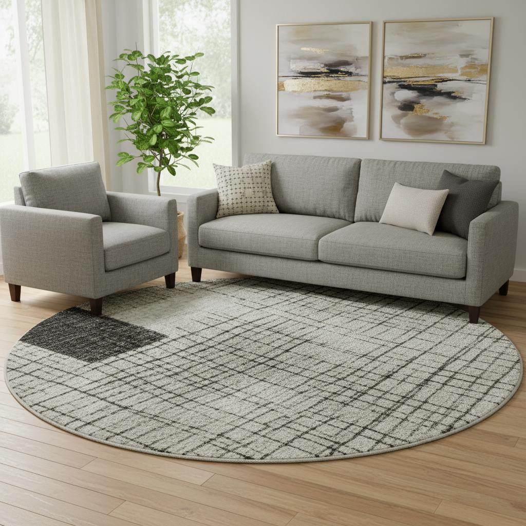 Set an inviting tone in your space with this 8-foot ivory and gray geometric washable round rug with uv protection. Ideal for spaces with kids and pets, this rug is stain resistant to help repel dirt and spilled liquids. Built to last, this rug crafted from polyester fibers is known for its durability and long lasting appeal. Rugs are a great way to showcase your style, hide imperfections, warm your home and reduce noise. This larger sized, transitional styled rug is ready to create a focal point or statement piece in your room. 96.00-inch h x 96.00-inch w x 0.39-inch d.