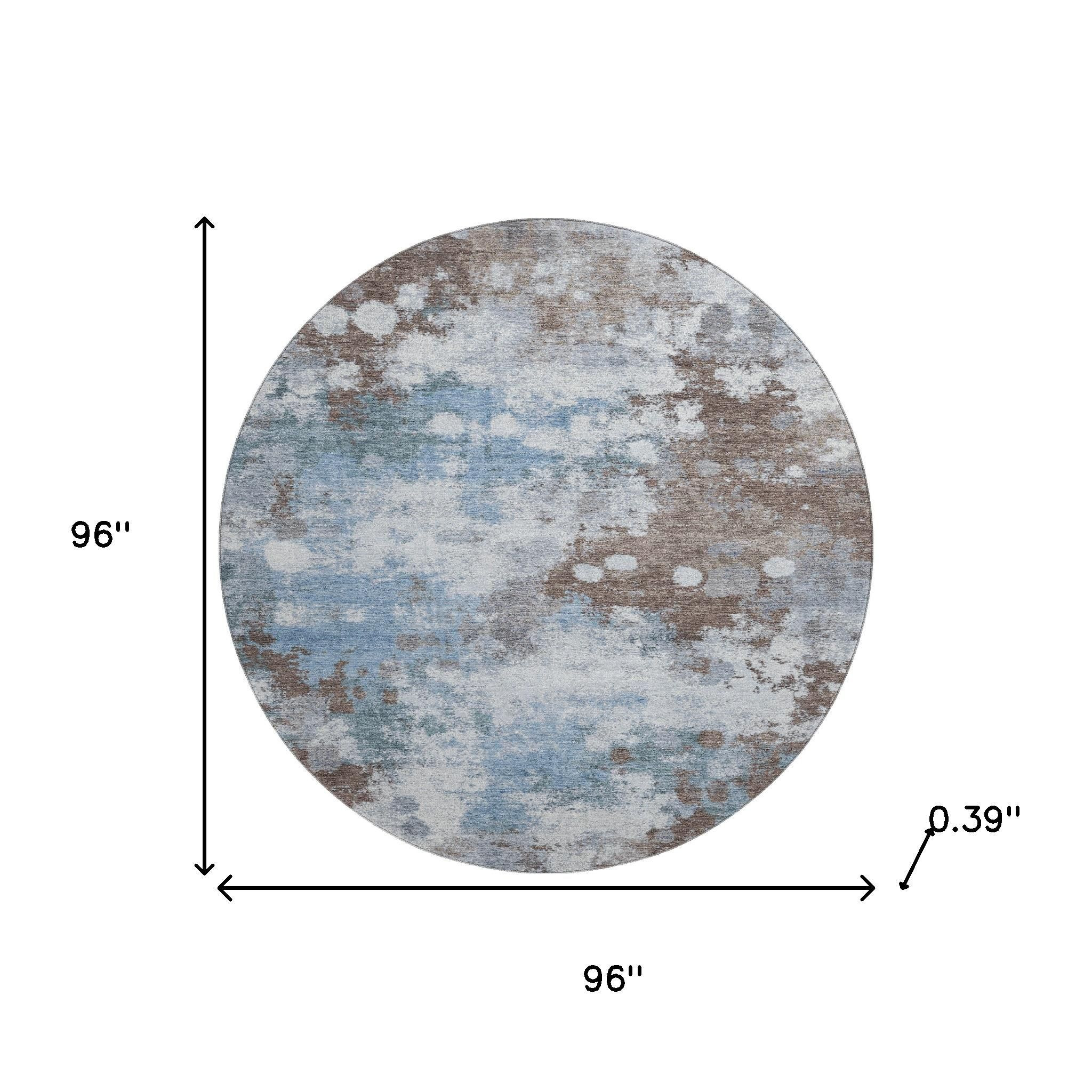 This 8-foot brown and blue abstract washable round rug with uv protection, is a great way to add warmth to a room. Ideal for spaces with kids and pets, this rug is stain resistant to help repel dirt and spilled liquids. Built to last, this rug crafted from polyester fibers is known for its durability and long lasting appeal. Rugs are a great way to showcase your style, hide imperfections, warm your home and reduce noise. This larger sized, transitional styled rug is ready to create a focal point or statement piece in your room. 96.00-inch h x 96.00-inch w x 0.39-inch d.