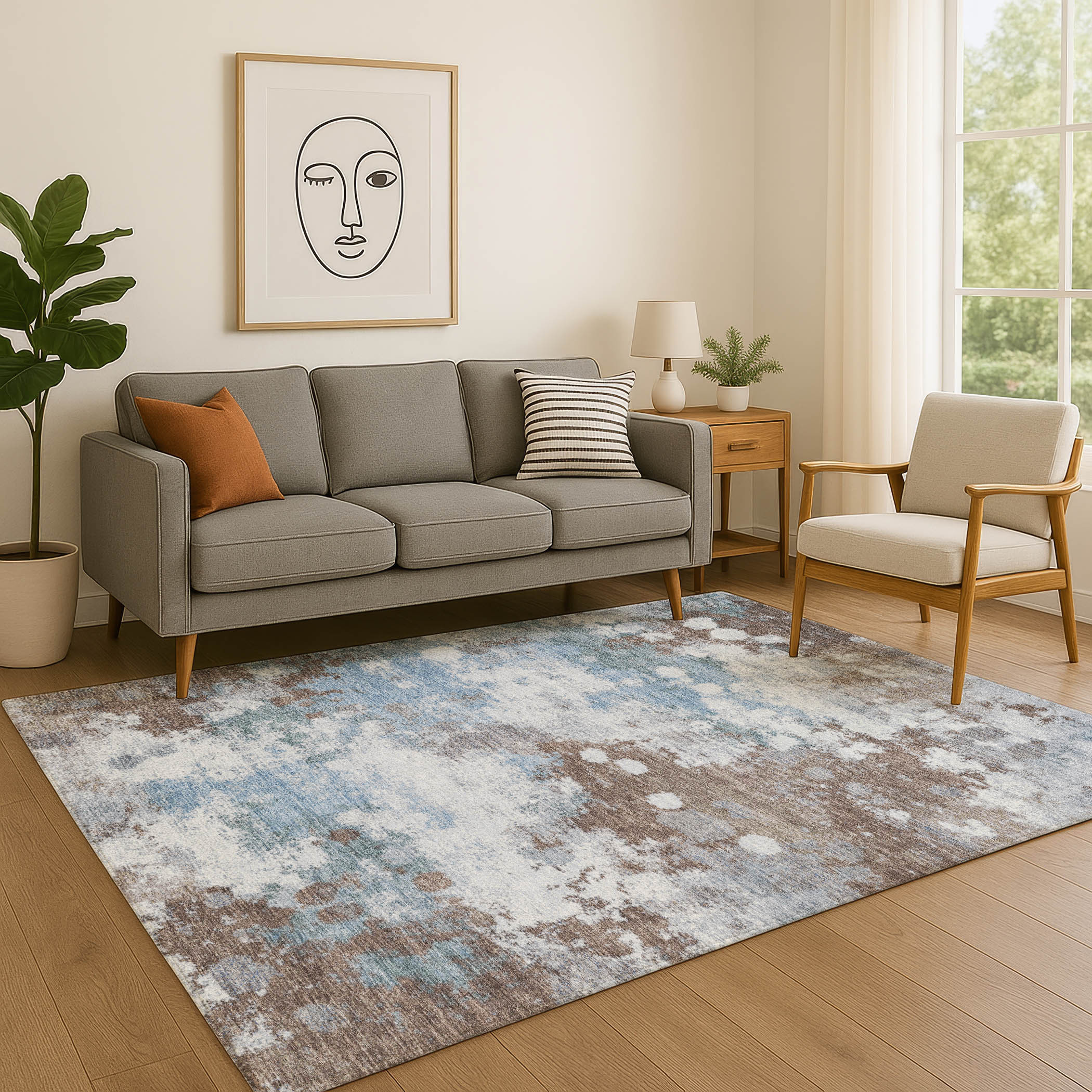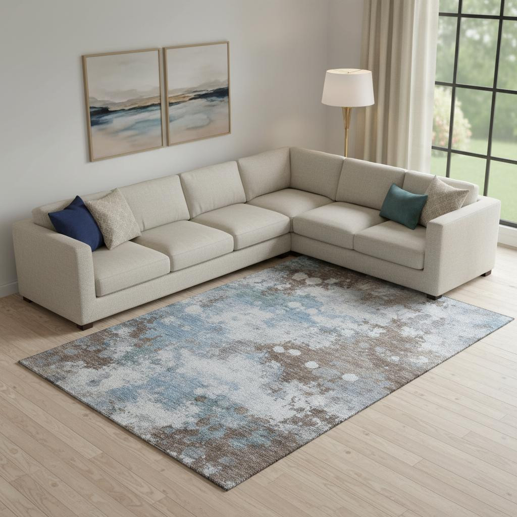 This 10-foot x 14-foot brown and blue abstract washable area rug with uv protection, is a great way to add warmth to a room. Ideal for spaces with kids and pets, this rug is stain resistant to help repel dirt and spilled liquids. Built to last, this rug crafted from polyester fibers is known for its durability and long lasting appeal. Rugs are a great way to showcase your style, hide imperfections, warm your home and reduce noise. This larger sized, transitional styled rug is ready to create a focal point or statement piece in your room. 120.00-inch h x 168.00-inch w x 0.39-inch d.