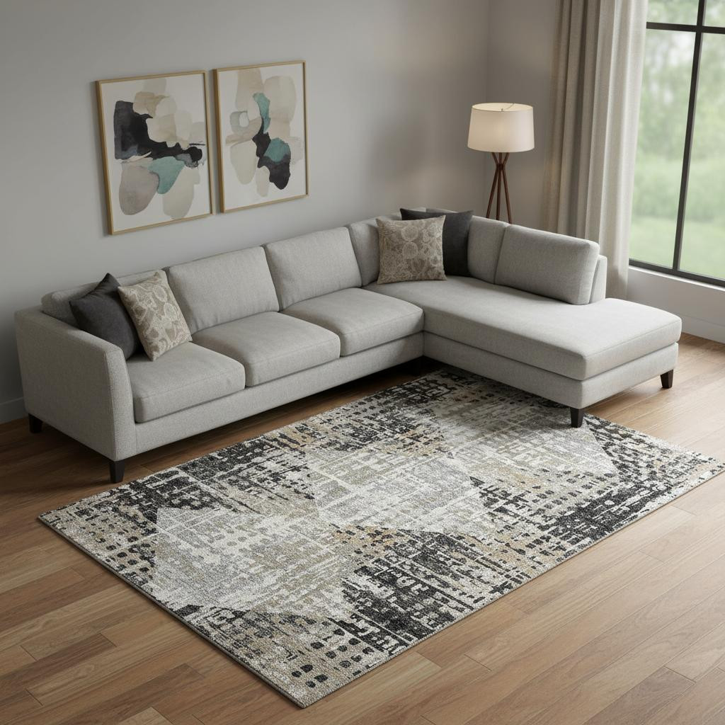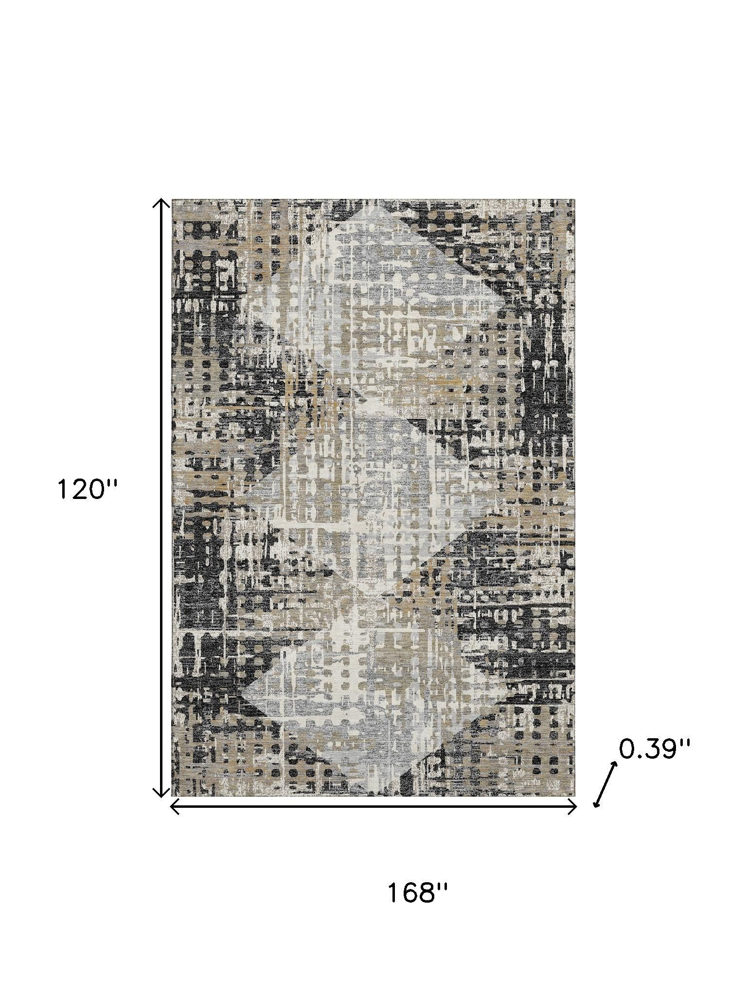 Add some artistry to your room with this 10-foot x 14-foot black and gray geometric washable area rug with uv protection. Ideal for spaces with kids and pets, this rug is stain resistant to help repel dirt and spilled liquids. Built to last, this rug crafted from polyester fibers is known for its durability and long lasting appeal. Rugs are a great way to showcase your style, hide imperfections, warm your home and reduce noise. This larger sized, transitional styled rug is ready to create a focal point or statement piece in your room. 120.00-inch h x 168.00-inch w x 0.39-inch d.