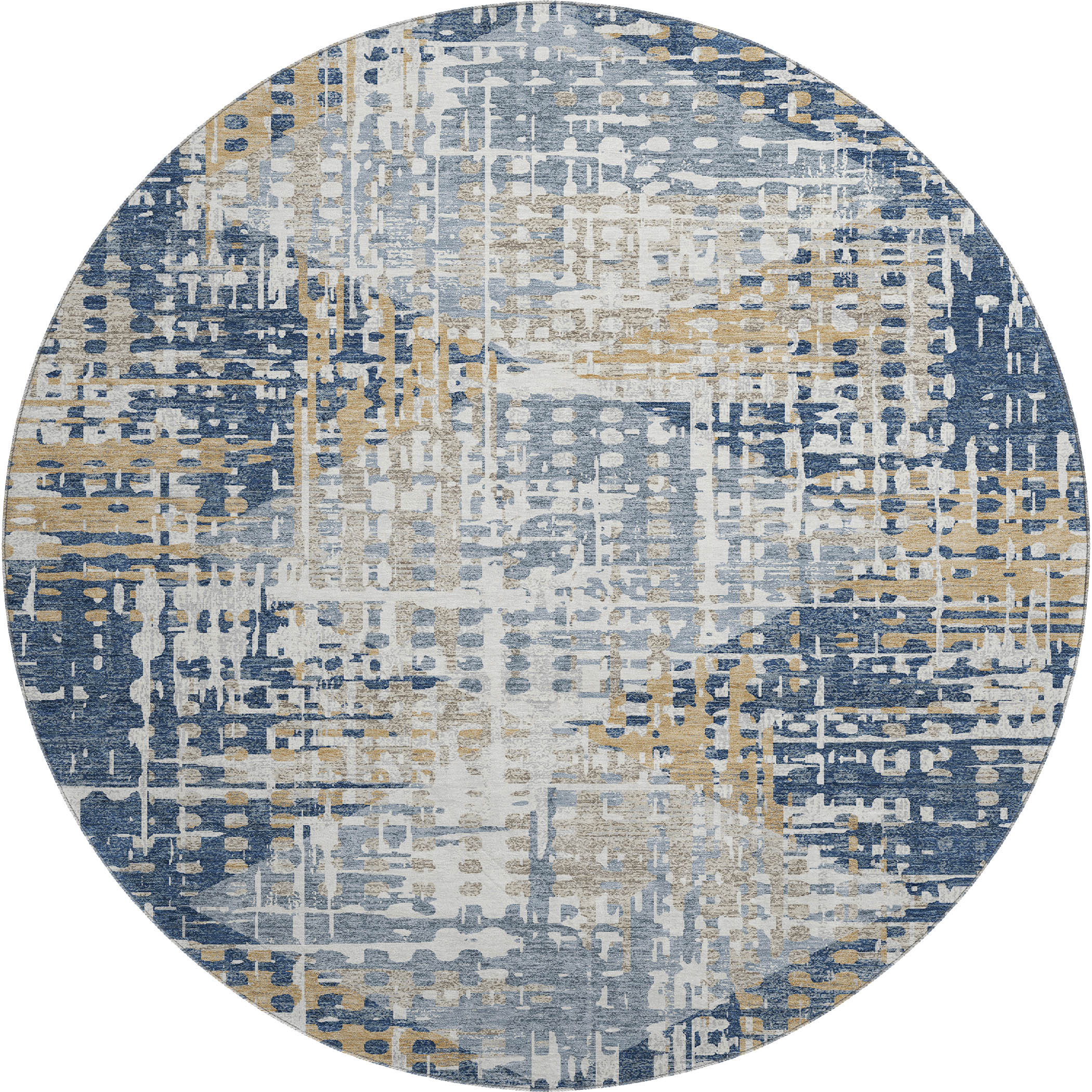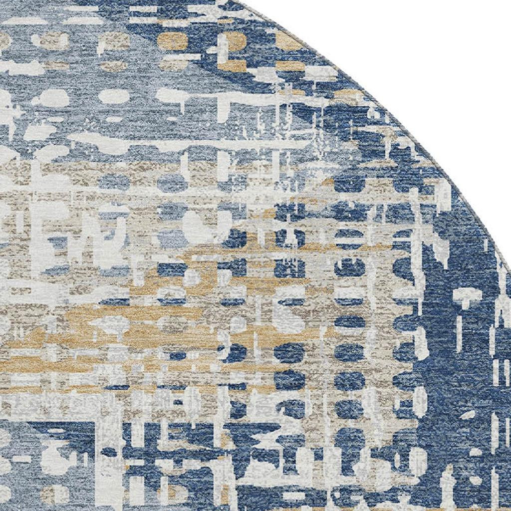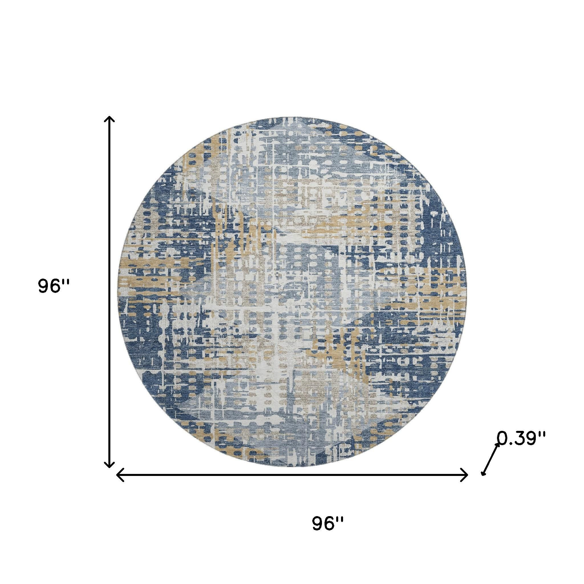 Set an inviting tone in your space with this 8-foot navy blue and beige geometric washable round rug with uv protection. Ideal for spaces with kids and pets, this rug is stain resistant to help repel dirt and spilled liquids. Built to last, this rug crafted from polyester fibers is known for its durability and long lasting appeal. Rugs are a great way to showcase your style, hide imperfections, warm your home and reduce noise. This larger sized, transitional styled rug is ready to create a focal point or statement piece in your room. 96.00-inch h x 96.00-inch w x 0.39-inch d.