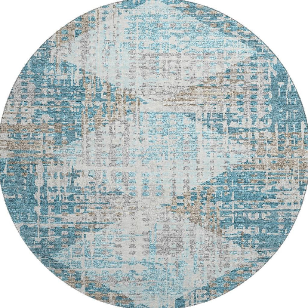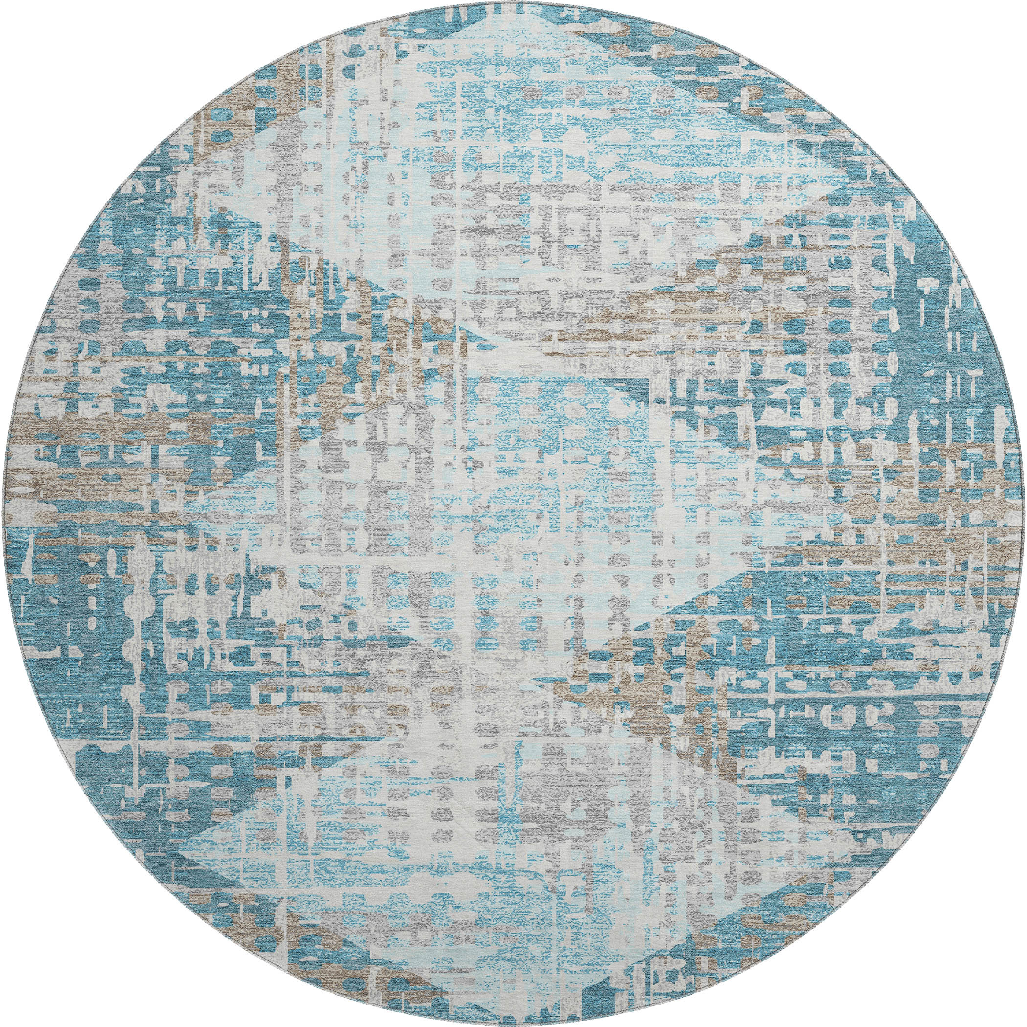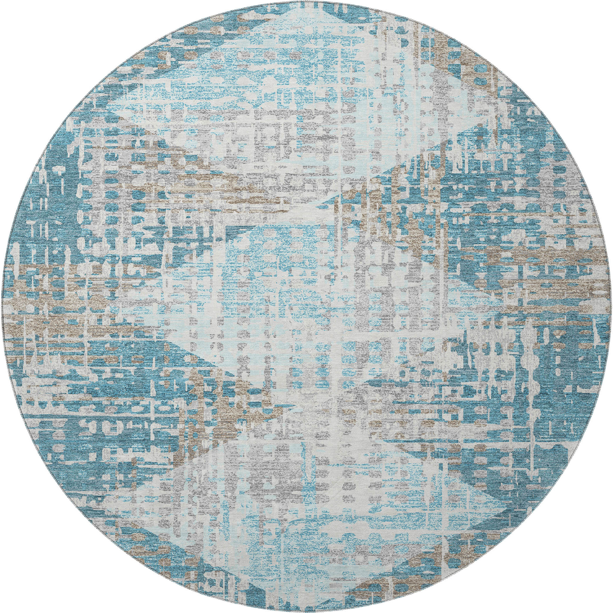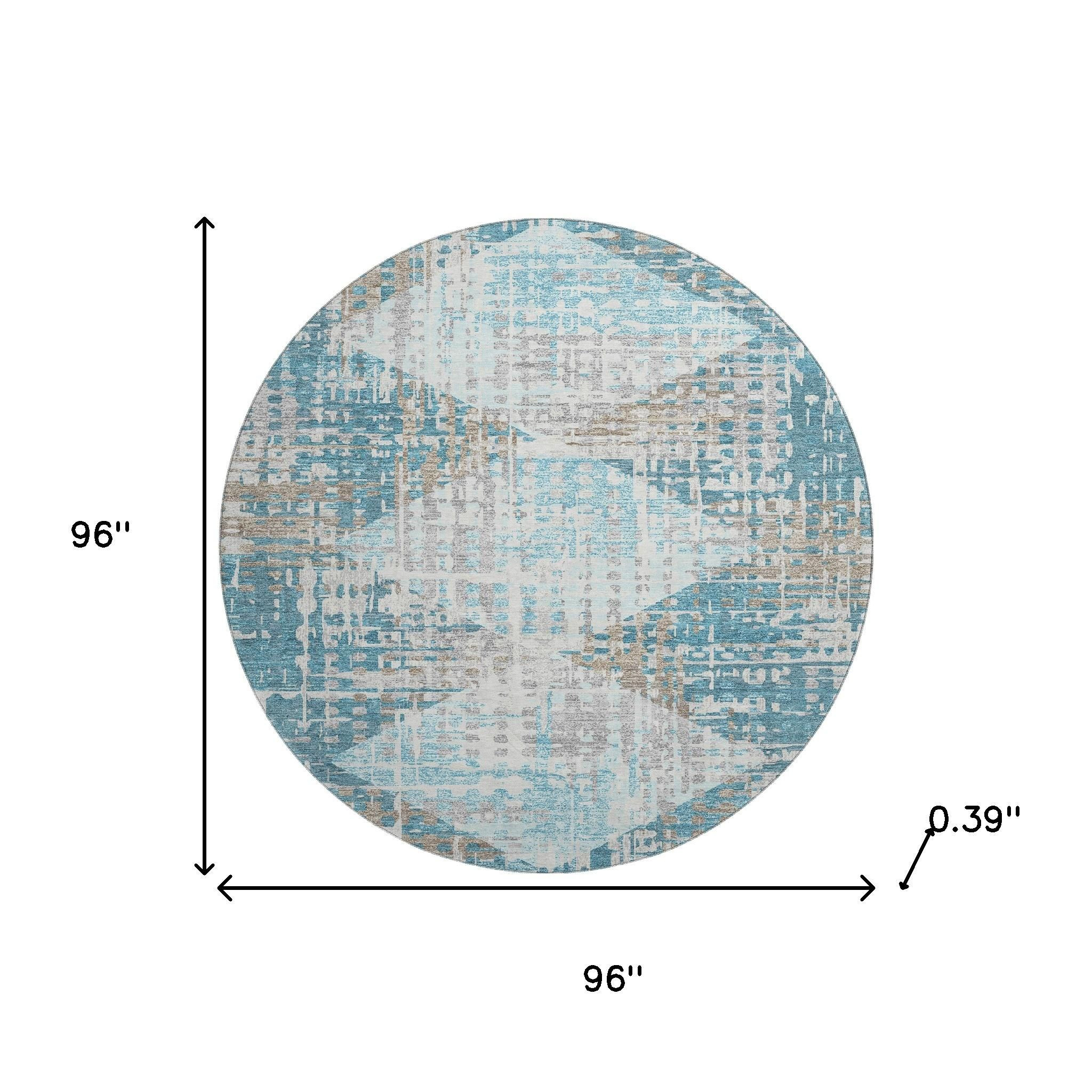 Add some artistry to your room with this 8-foot teal and beige geometric washable round rug with uv protection. Ideal for spaces with kids and pets, this rug is stain resistant to help repel dirt and spilled liquids. Built to last, this rug crafted from polyester fibers is known for its durability and long lasting appeal. Rugs are a great way to showcase your style, hide imperfections, warm your home and reduce noise. This larger sized, transitional styled rug is ready to create a focal point or statement piece in your room. 96.00-inch h x 96.00-inch w x 0.39-inch d.