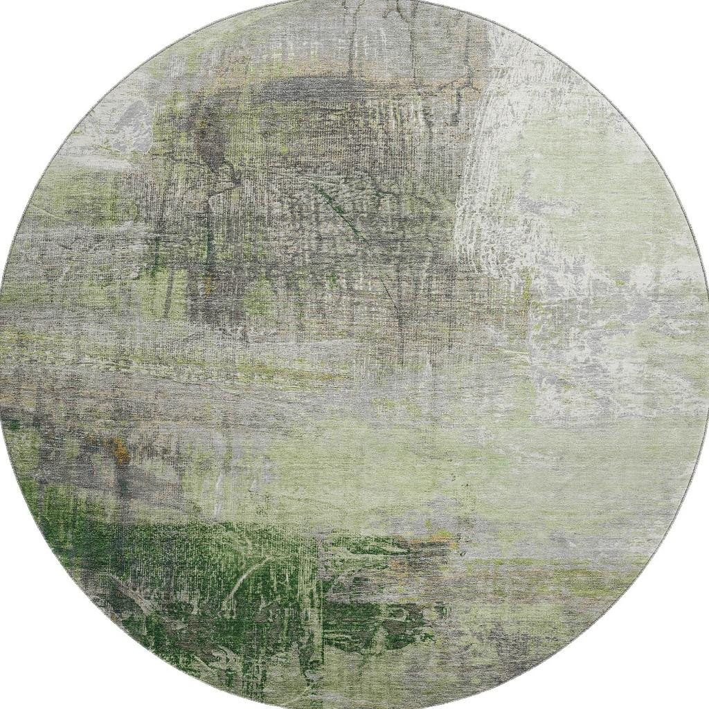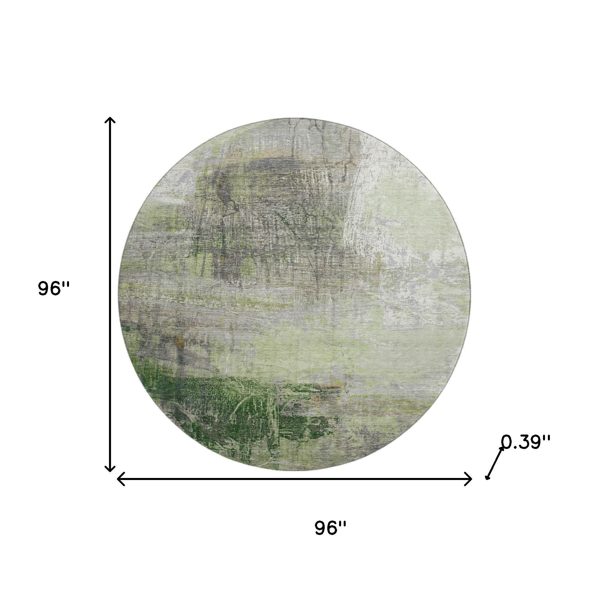 This 8-foot sage and ivory abstract washable round rug with uv protection, is a great way to add warmth to a room. Ideal for spaces with kids and pets, this rug is stain resistant to help repel dirt and spilled liquids. Built to last, this rug crafted from polyester fibers is known for its durability and long lasting appeal. Rugs are a great way to showcase your style, hide imperfections, warm your home and reduce noise. This larger sized, transitional styled rug is ready to create a focal point or statement piece in your room. 96.00-inch h x 96.00-inch w x 0.39-inch d.