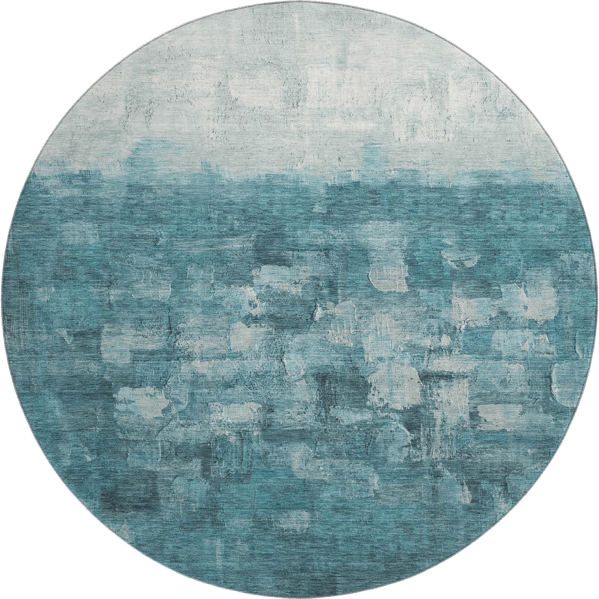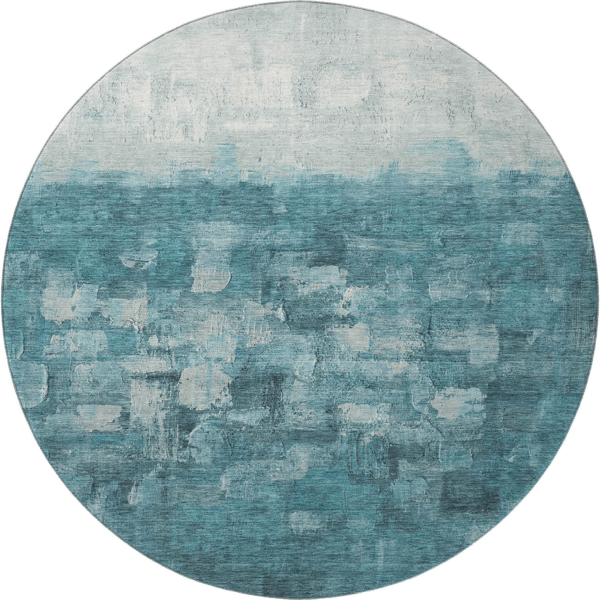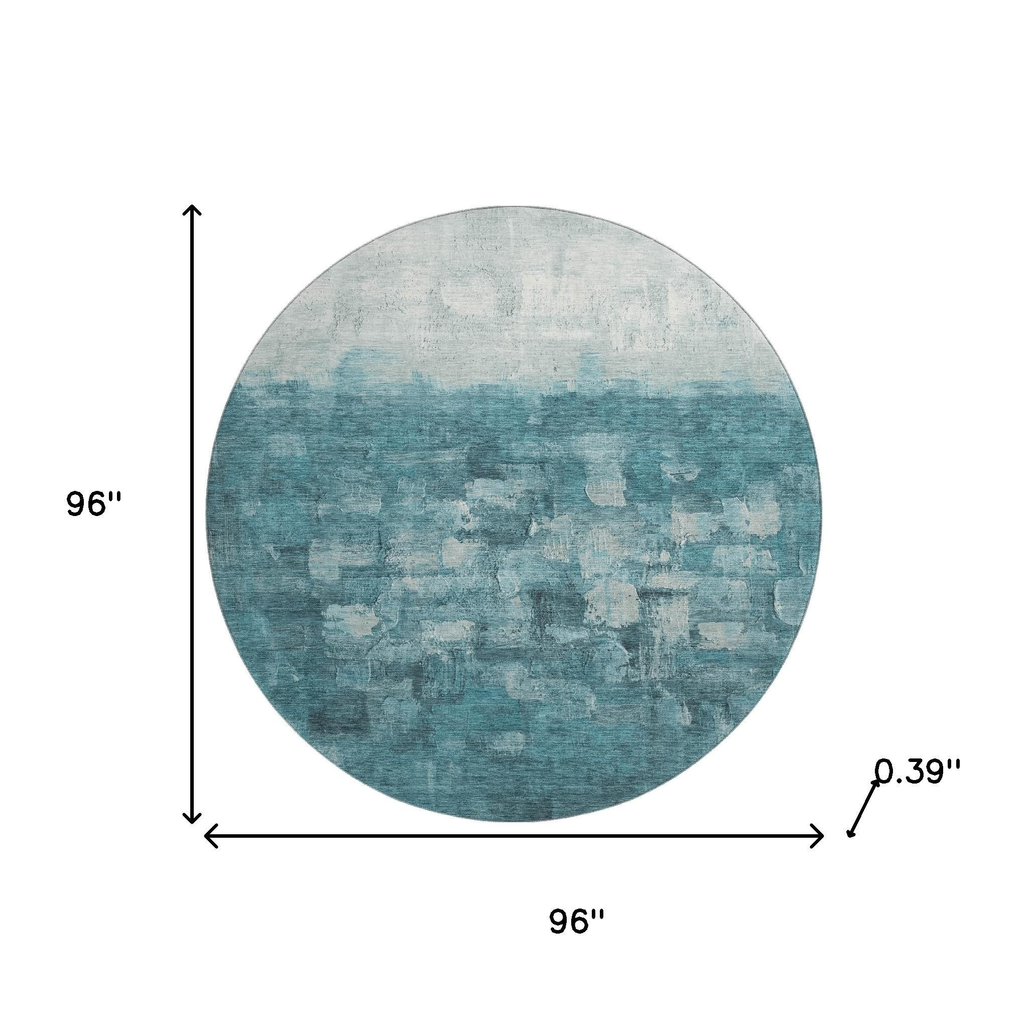 Add some artistry to your room with this 8-foot teal and ivory abstract washable round rug with uv protection. Ideal for spaces with kids and pets, this rug is stain resistant to help repel dirt and spilled liquids. Built to last, this rug crafted from polyester fibers is known for its durability and long lasting appeal. Rugs are a great way to showcase your style, hide imperfections, warm your home and reduce noise. This larger sized, transitional styled rug is ready to create a focal point or statement piece in your room. 96.00-inch h x 96.00-inch w x 0.39-inch d.