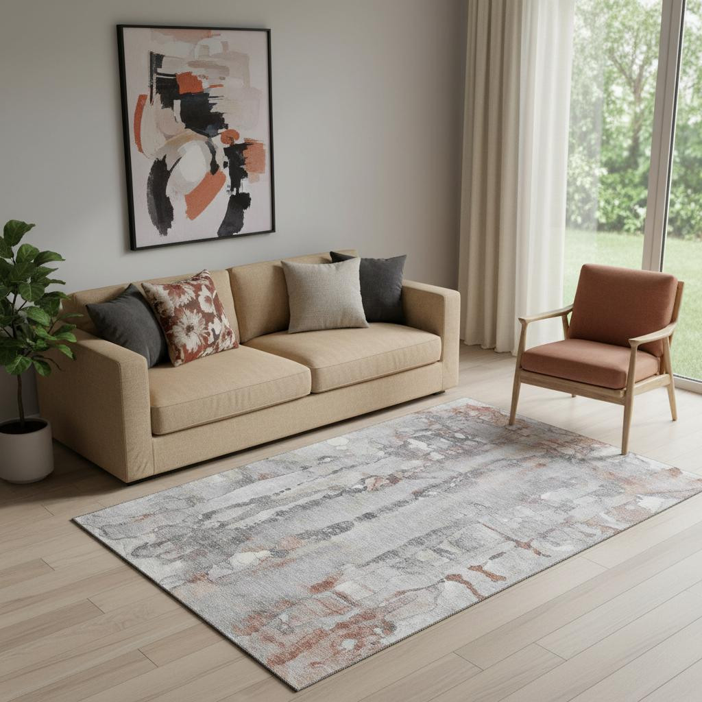Set an inviting tone in your space with this 5-foot x 8-foot copper and gray abstract washable area rug with uv protection. Ideal for spaces with kids and pets, this rug is stain resistant to help repel dirt and spilled liquids. Built to last, this rug crafted from polyester fibers is known for its durability and long lasting appeal. Rugs are a great way to showcase your style, hide imperfections, warm your home and reduce noise. This larger sized, transitional styled rug is ready to create a focal point or statement piece in your room. 60.00-inch h x 90.00-inch w x 0.39-inch d.