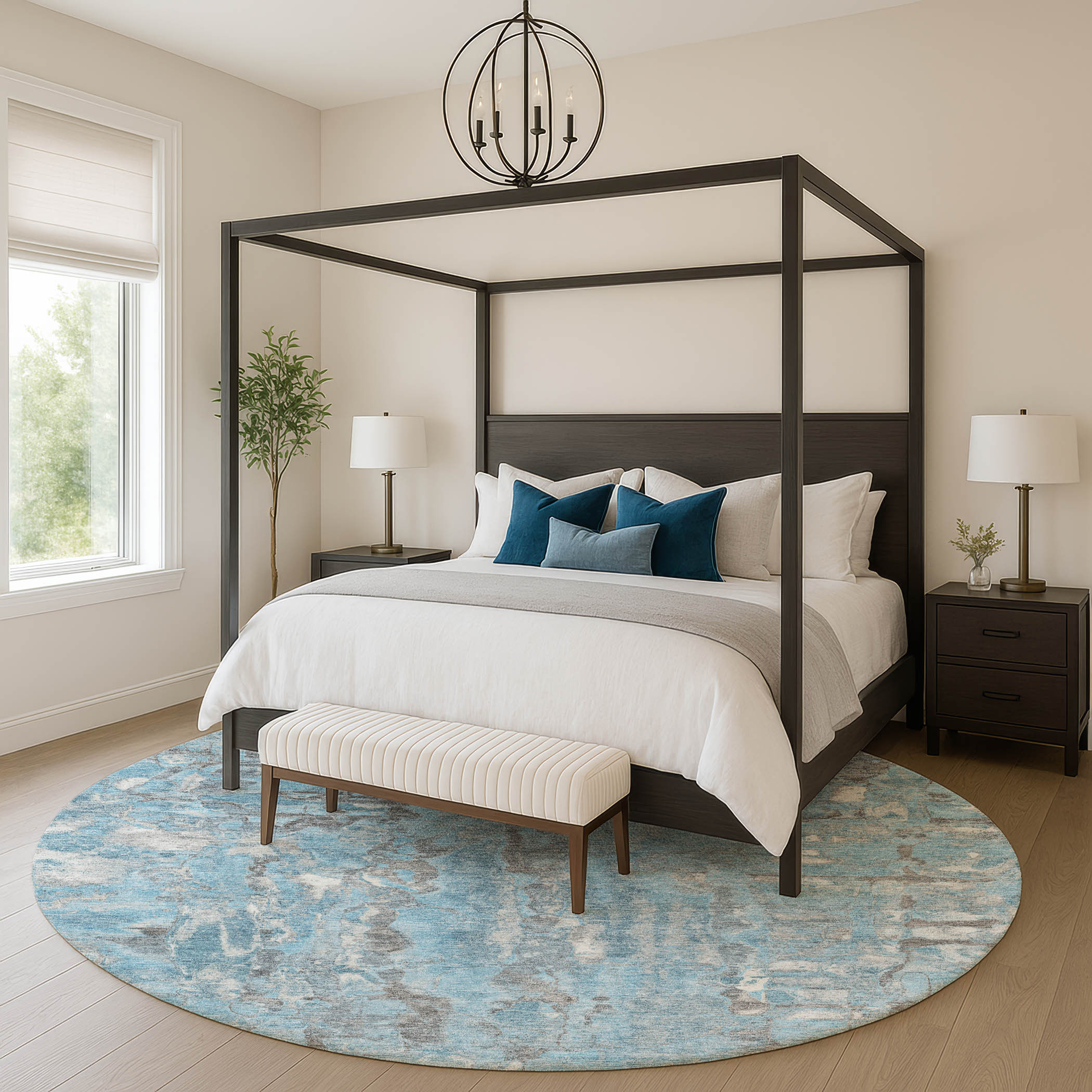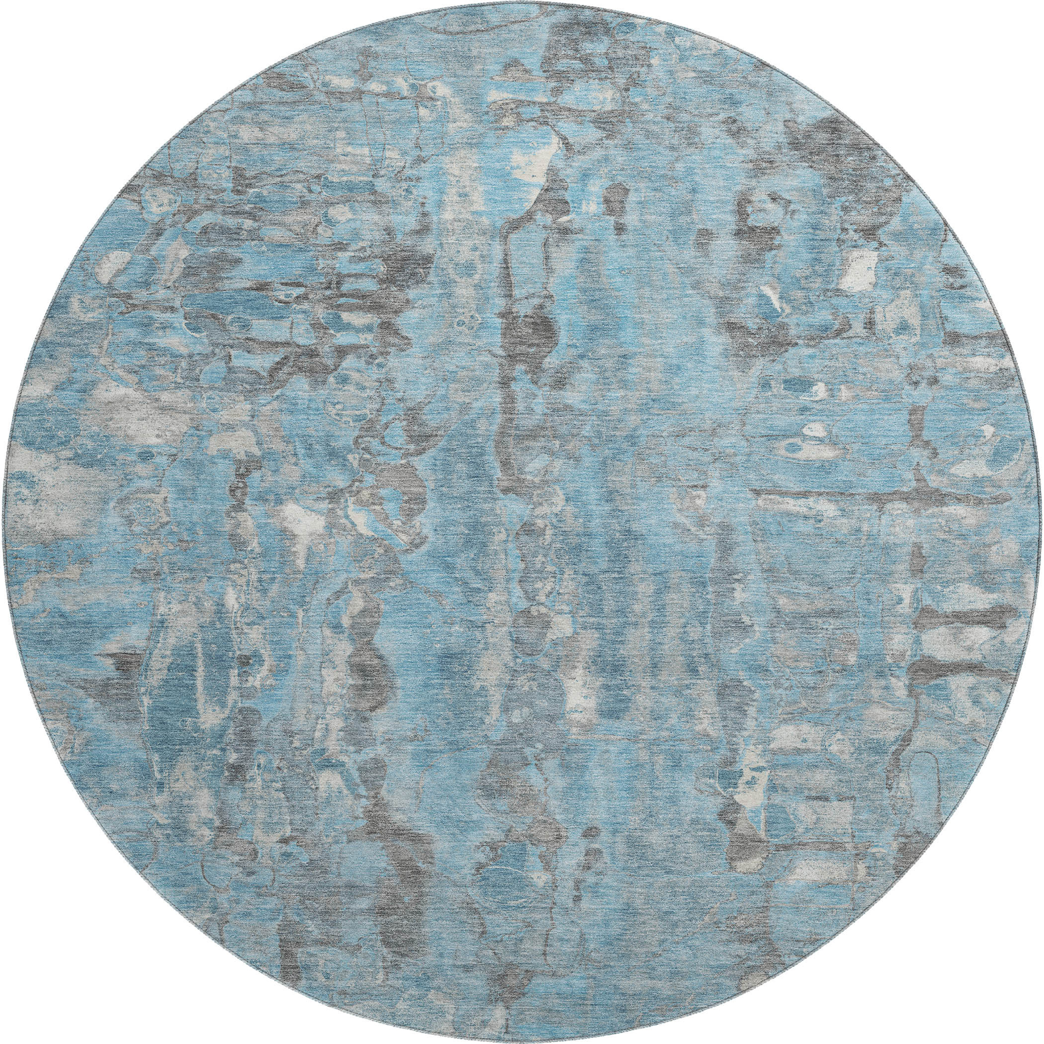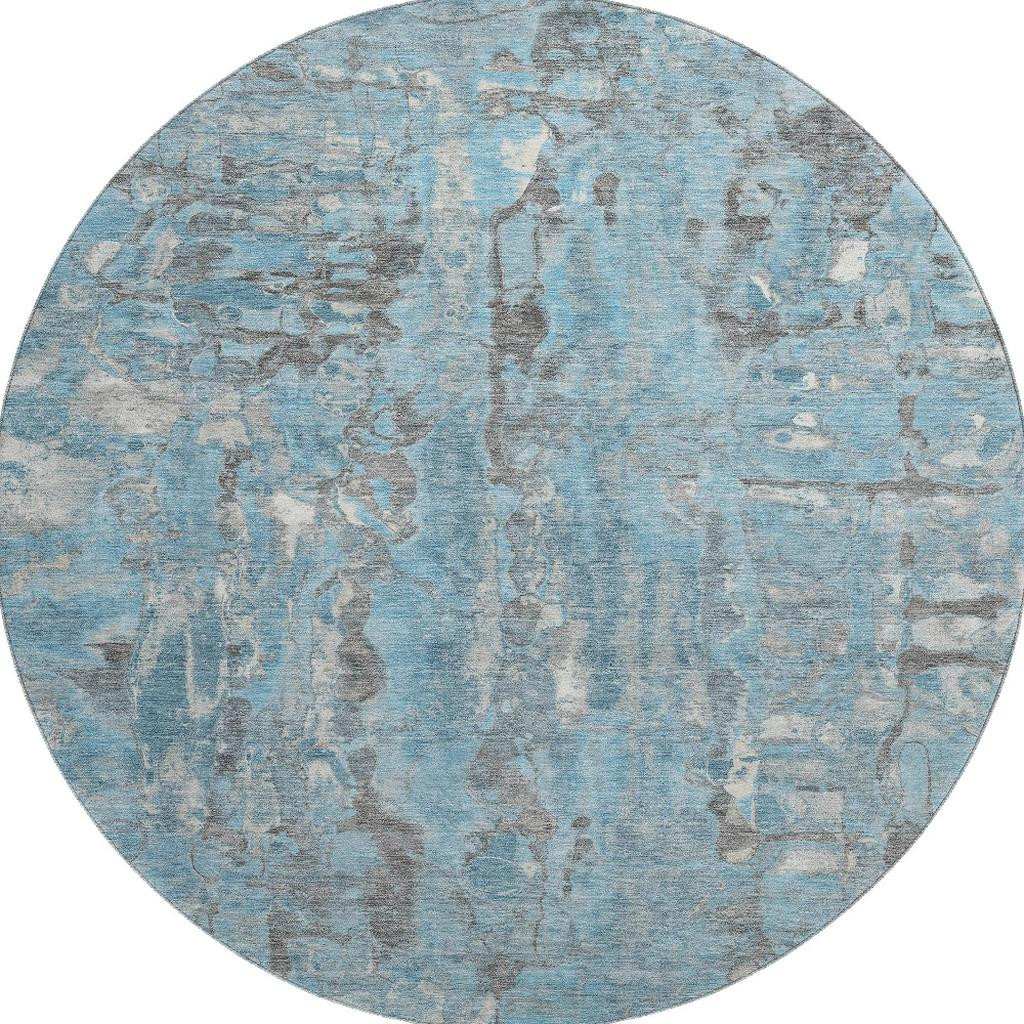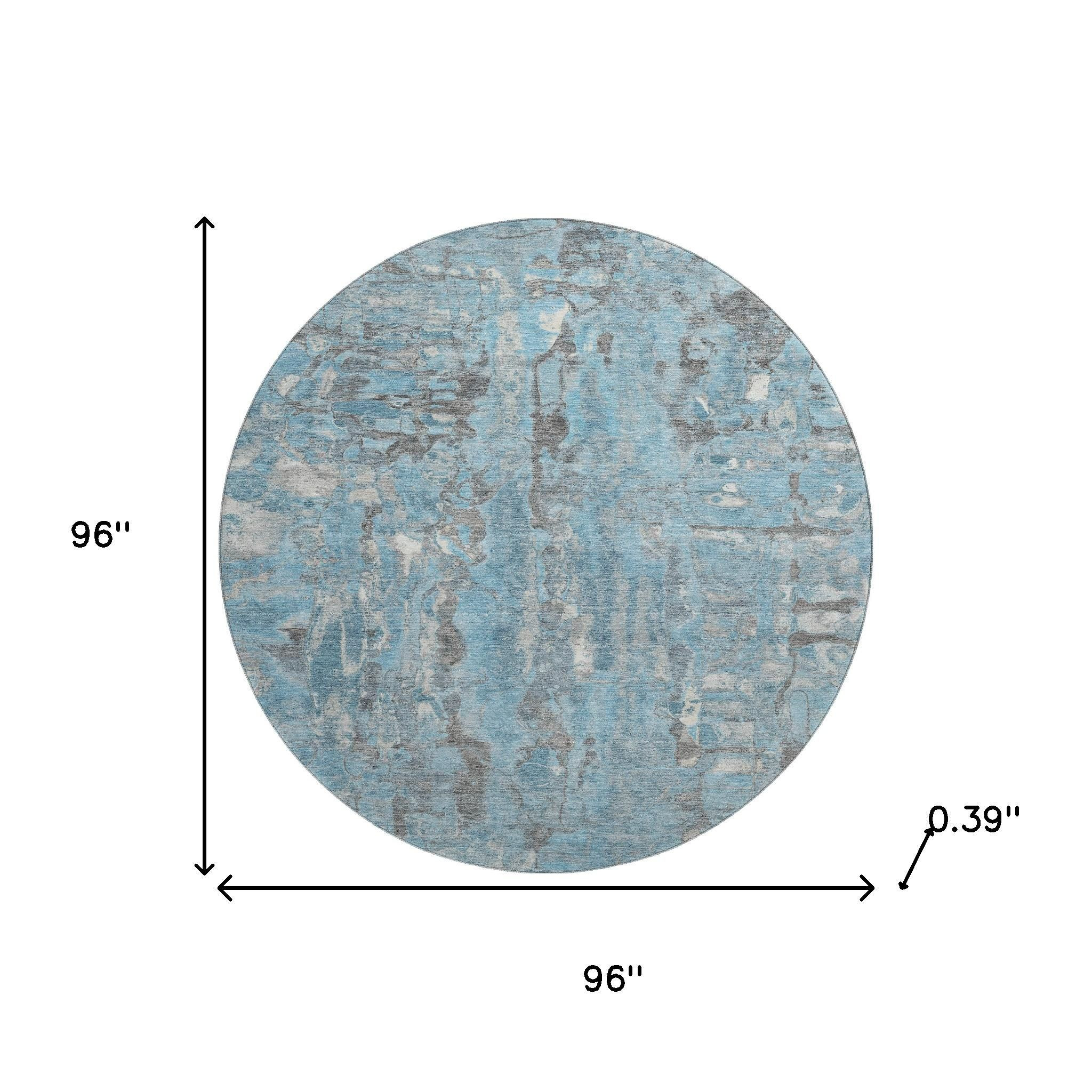Add great coloration and comfortable texture to your space with this 8-foot denim blue and gray abstract washable round rug with uv protection. Ideal for spaces with kids and pets, this rug is stain resistant to help repel dirt and spilled liquids. Built to last, this rug crafted from polyester fibers is known for its durability and long lasting appeal. Rugs are a great way to showcase your style, hide imperfections, warm your home and reduce noise. This larger sized, transitional styled rug is ready to create a focal point or statement piece in your room. 96.00-inch h x 96.00-inch w x 0.39-inch d.