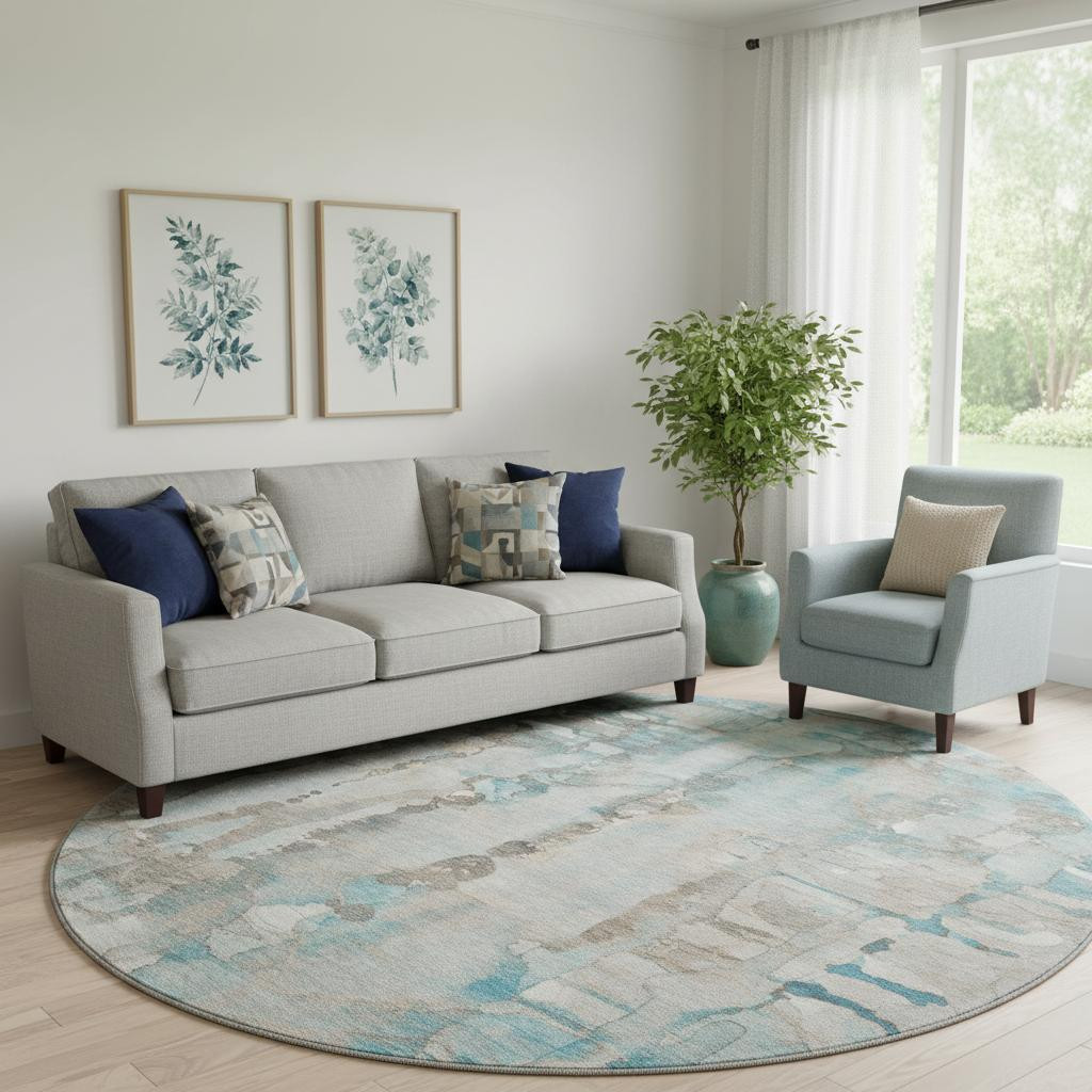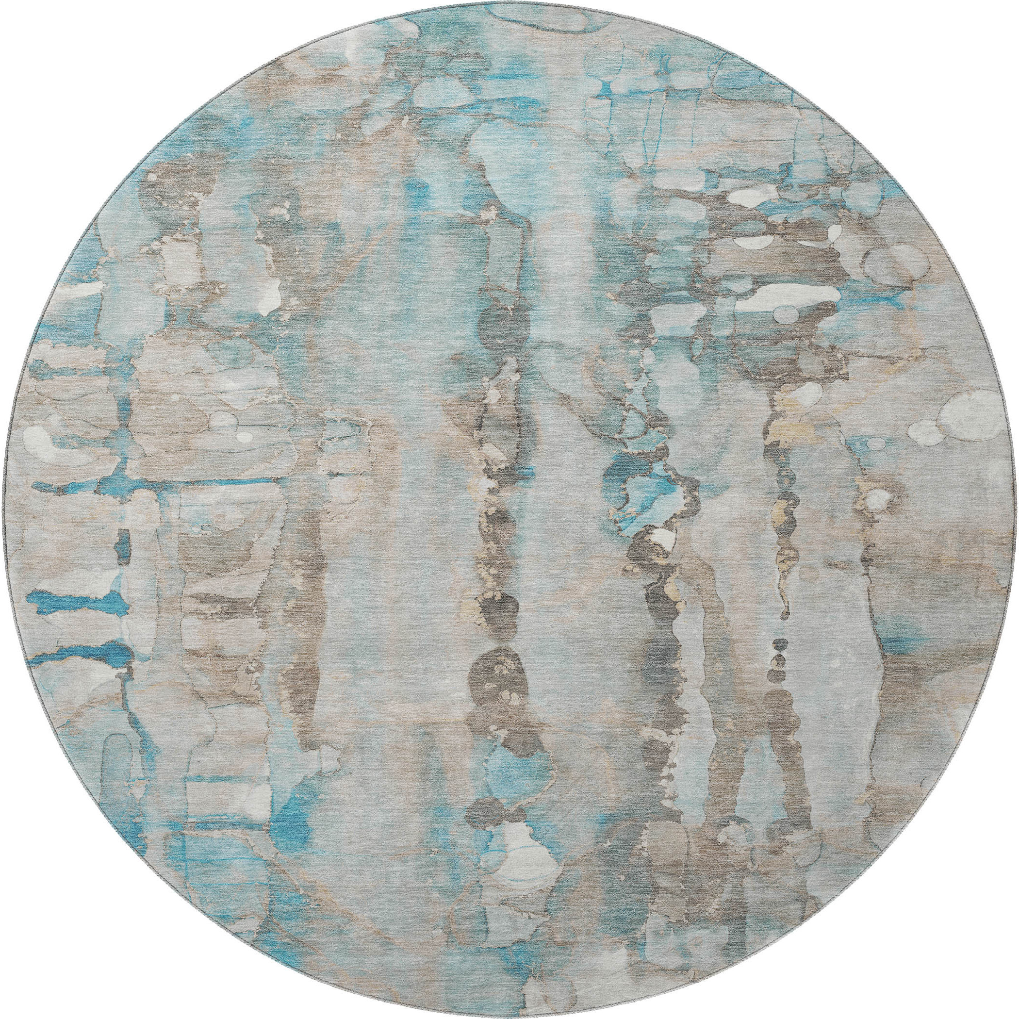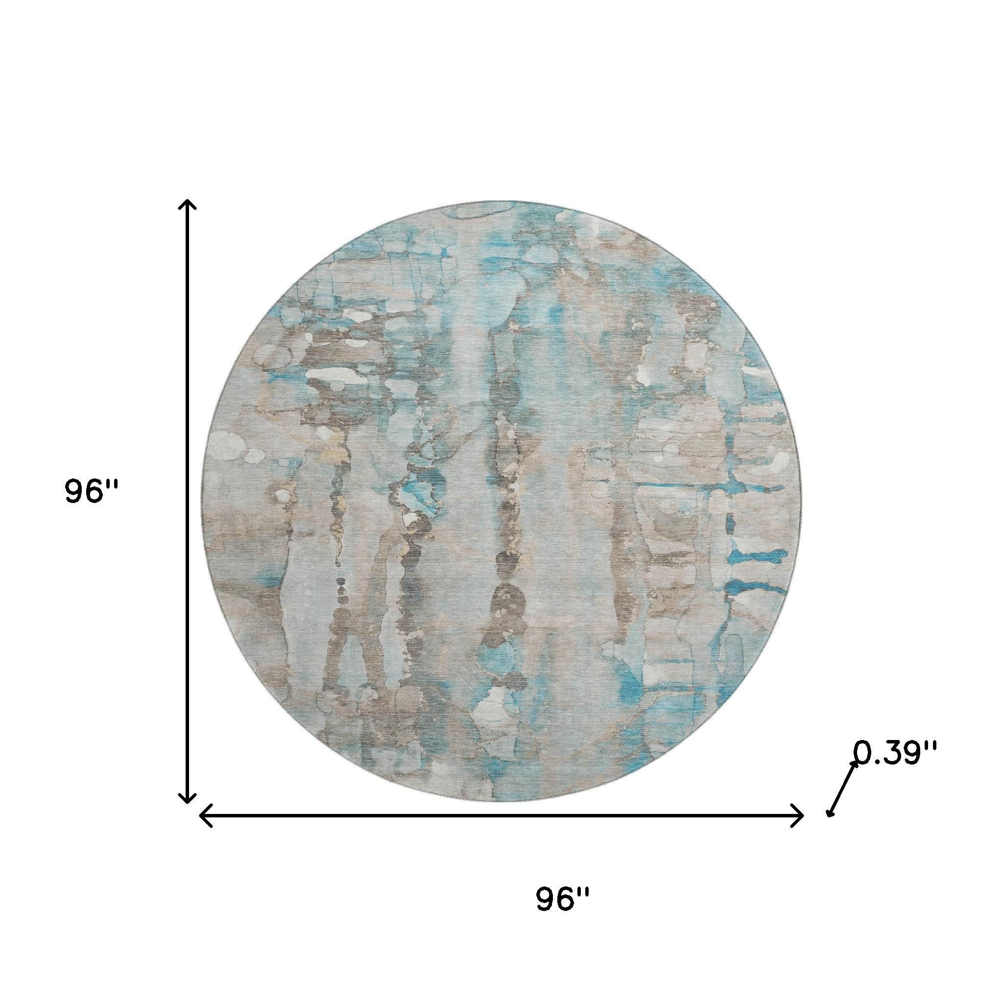 This 8-foot teal and ivory abstract washable round rug with uv protection, is a great way to add warmth to a room. Ideal for spaces with kids and pets, this rug is stain resistant to help repel dirt and spilled liquids. Built to last, this rug crafted from polyester fibers is known for its durability and long lasting appeal. Rugs are a great way to showcase your style, hide imperfections, warm your home and reduce noise. This larger sized, transitional styled rug is ready to create a focal point or statement piece in your room. 96.00-inch h x 96.00-inch w x 0.39-inch d.