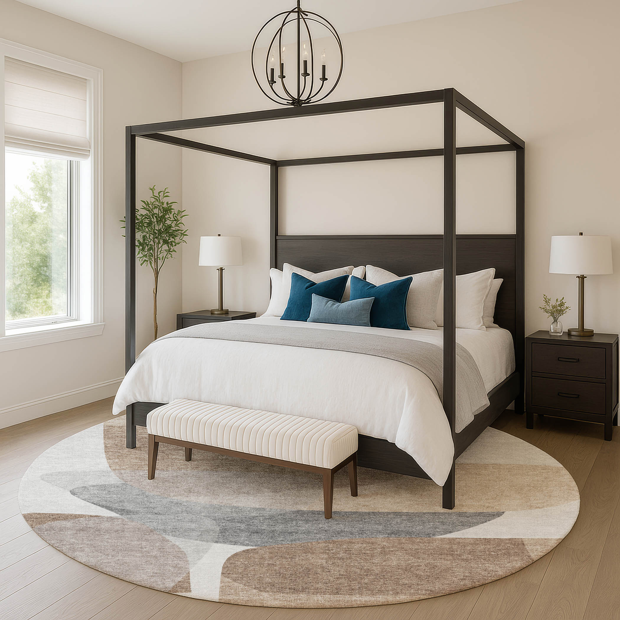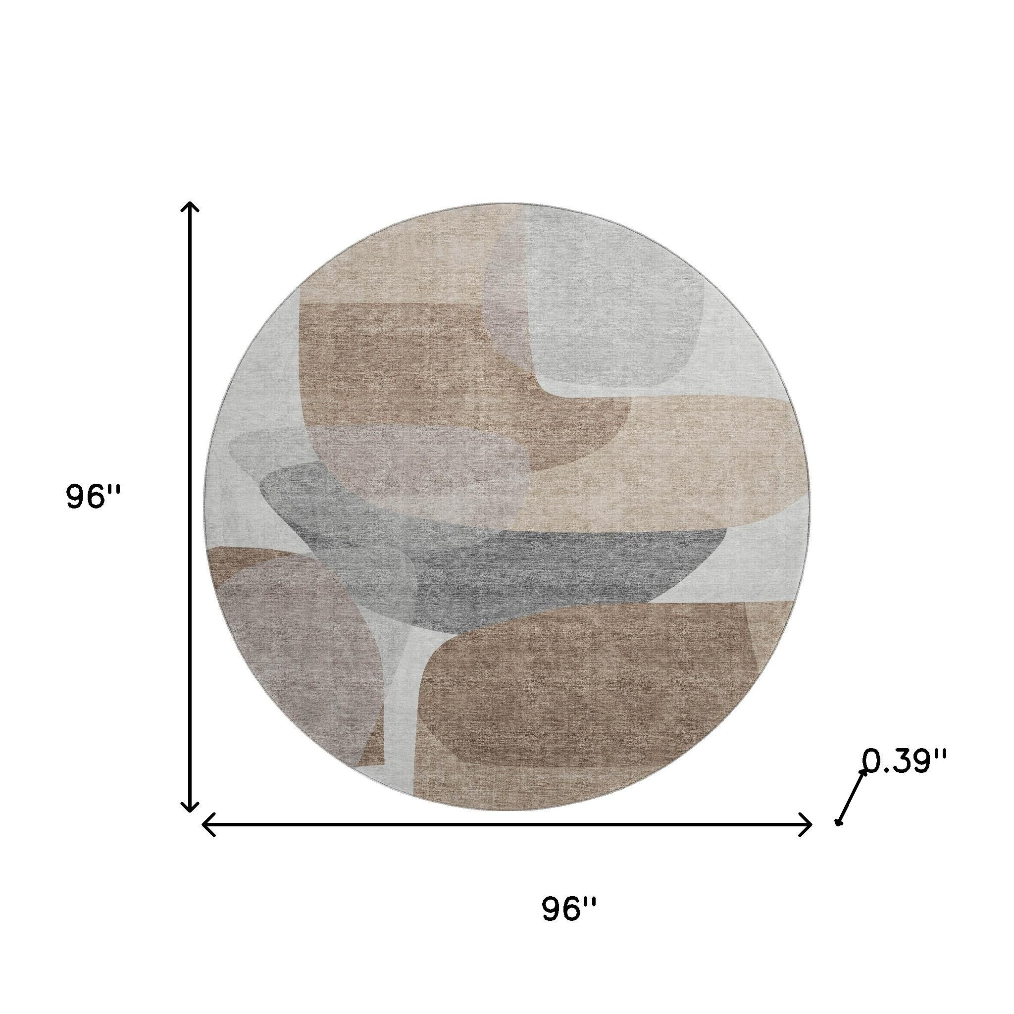 Add some artistry to your room with this 8-foot coffee and gray abstract washable round rug with uv protection. Ideal for spaces with kids and pets, this rug is stain resistant to help repel dirt and spilled liquids. Built to last, this rug crafted from polyester fibers is known for its durability and long lasting appeal. Rugs are a great way to showcase your style, hide imperfections, warm your home and reduce noise. This larger sized, transitional styled rug is ready to create a focal point or statement piece in your room. 96.00-inch h x 96.00-inch w x 0.39-inch d.