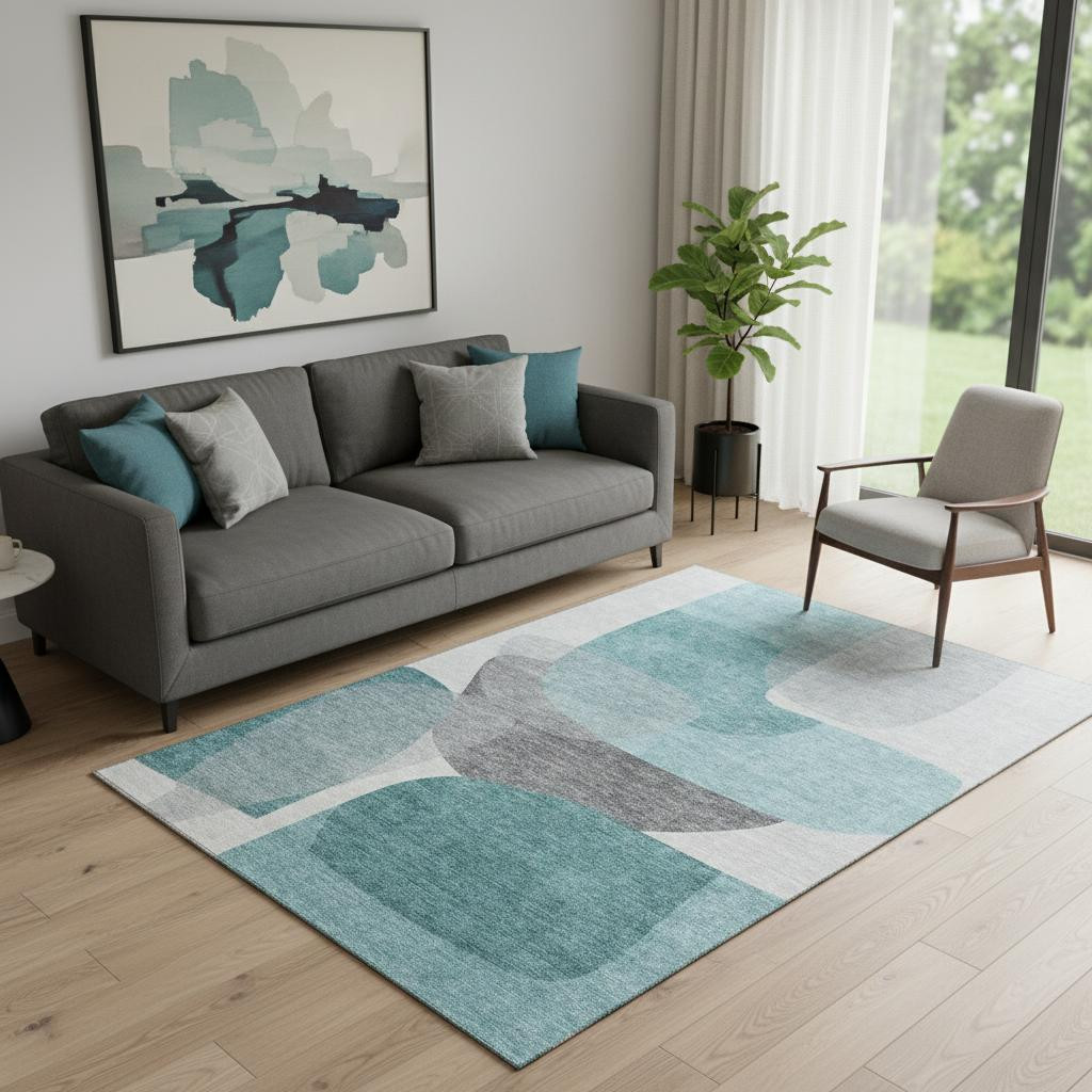Set an inviting tone in your space with this 5-foot x 8-foot teal and gray abstract washable area rug with uv protection. Ideal for spaces with kids and pets, this rug is stain resistant to help repel dirt and spilled liquids. Built to last, this rug crafted from polyester fibers is known for its durability and long lasting appeal. Rugs are a great way to showcase your style, hide imperfections, warm your home and reduce noise. This larger sized, transitional styled rug is ready to create a focal point or statement piece in your room. 60.00-inch h x 90.00-inch w x 0.39-inch d.