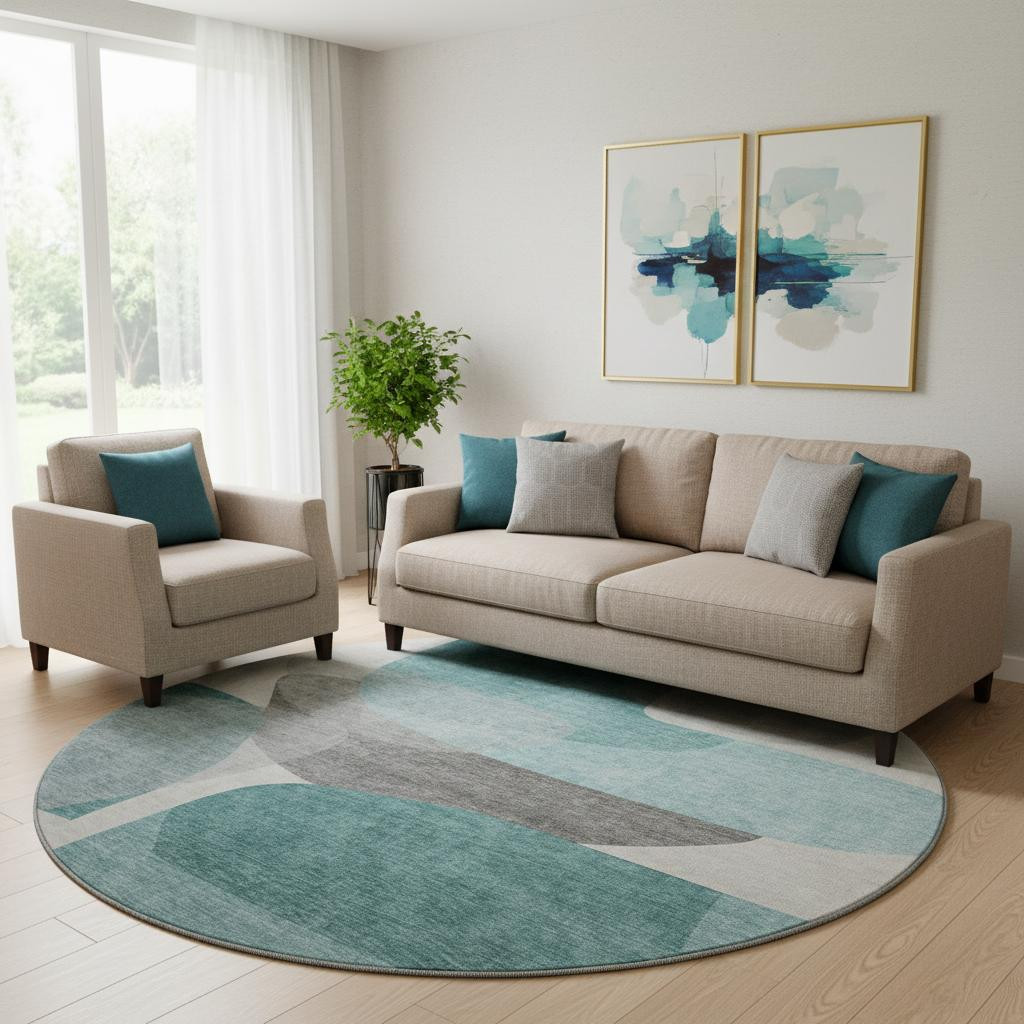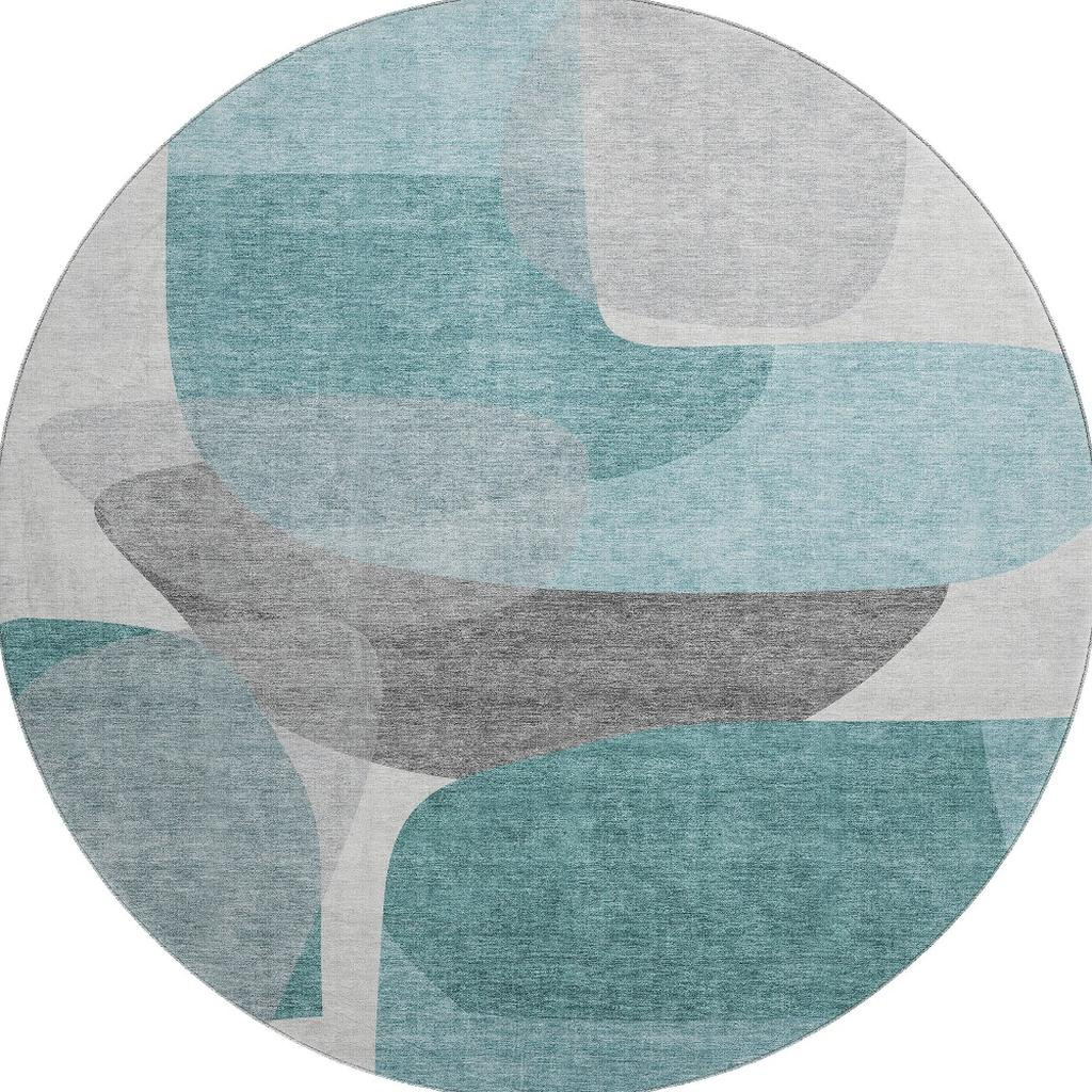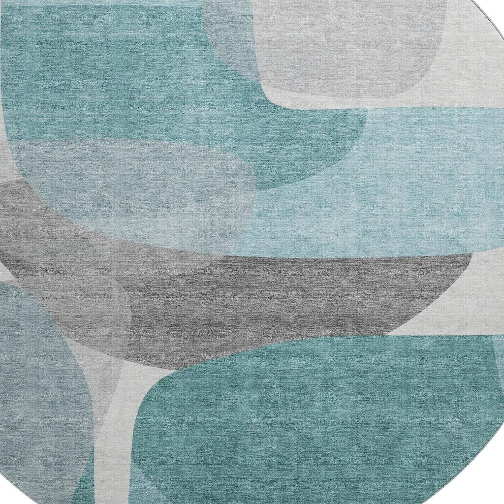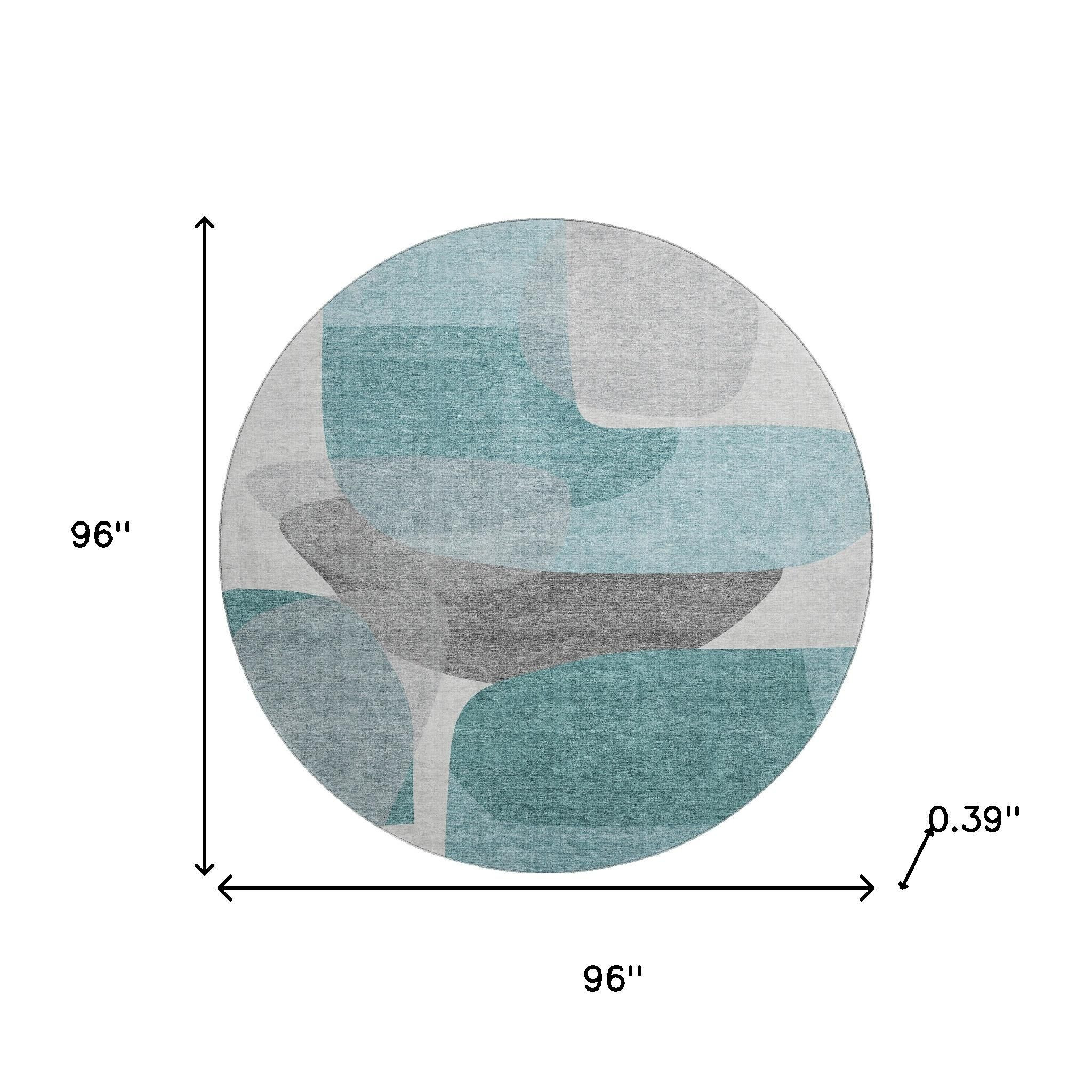 Add great coloration and comfortable texture to your space with this 8-foot teal and gray abstract washable round rug with uv protection. Ideal for spaces with kids and pets, this rug is stain resistant to help repel dirt and spilled liquids. Built to last, this rug crafted from polyester fibers is known for its durability and long lasting appeal. Rugs are a great way to showcase your style, hide imperfections, warm your home and reduce noise. This larger sized, transitional styled rug is ready to create a focal point or statement piece in your room. 96.00-inch h x 96.00-inch w x 0.39-inch d.