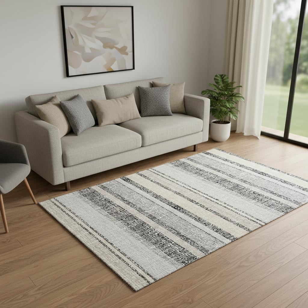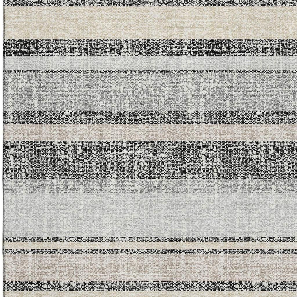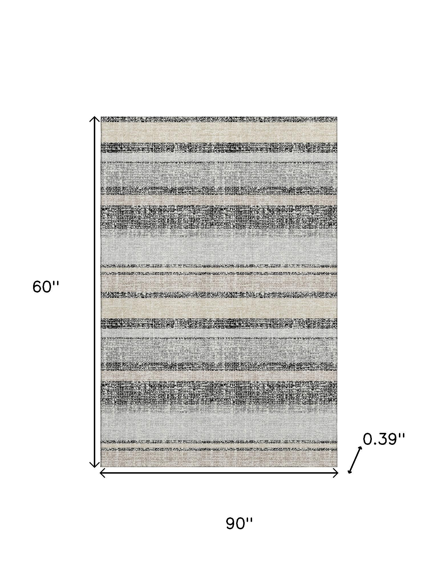 Add great coloration and comfortable texture to your space with this 5-foot x 8-foot black and beige striped washable area rug with uv protection. Ideal for spaces with kids and pets, this rug is stain resistant to help repel dirt and spilled liquids. Built to last, this rug crafted from polyester fibers is known for its durability and long lasting appeal. Rugs are a great way to showcase your style, hide imperfections, warm your home and reduce noise. This larger sized, transitional styled rug is ready to create a focal point or statement piece in your room. 60.00-inch h x 90.00-inch w x 0.39-inch d.
