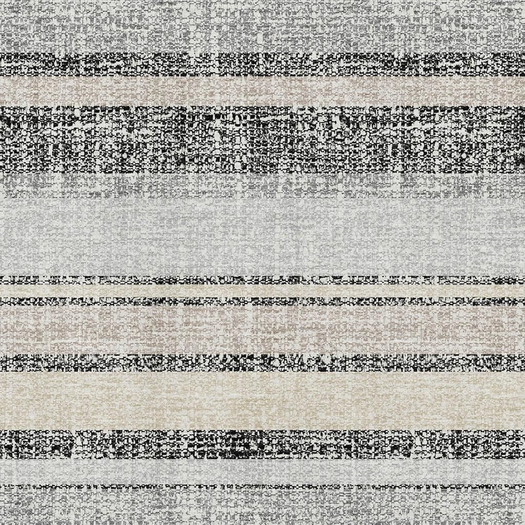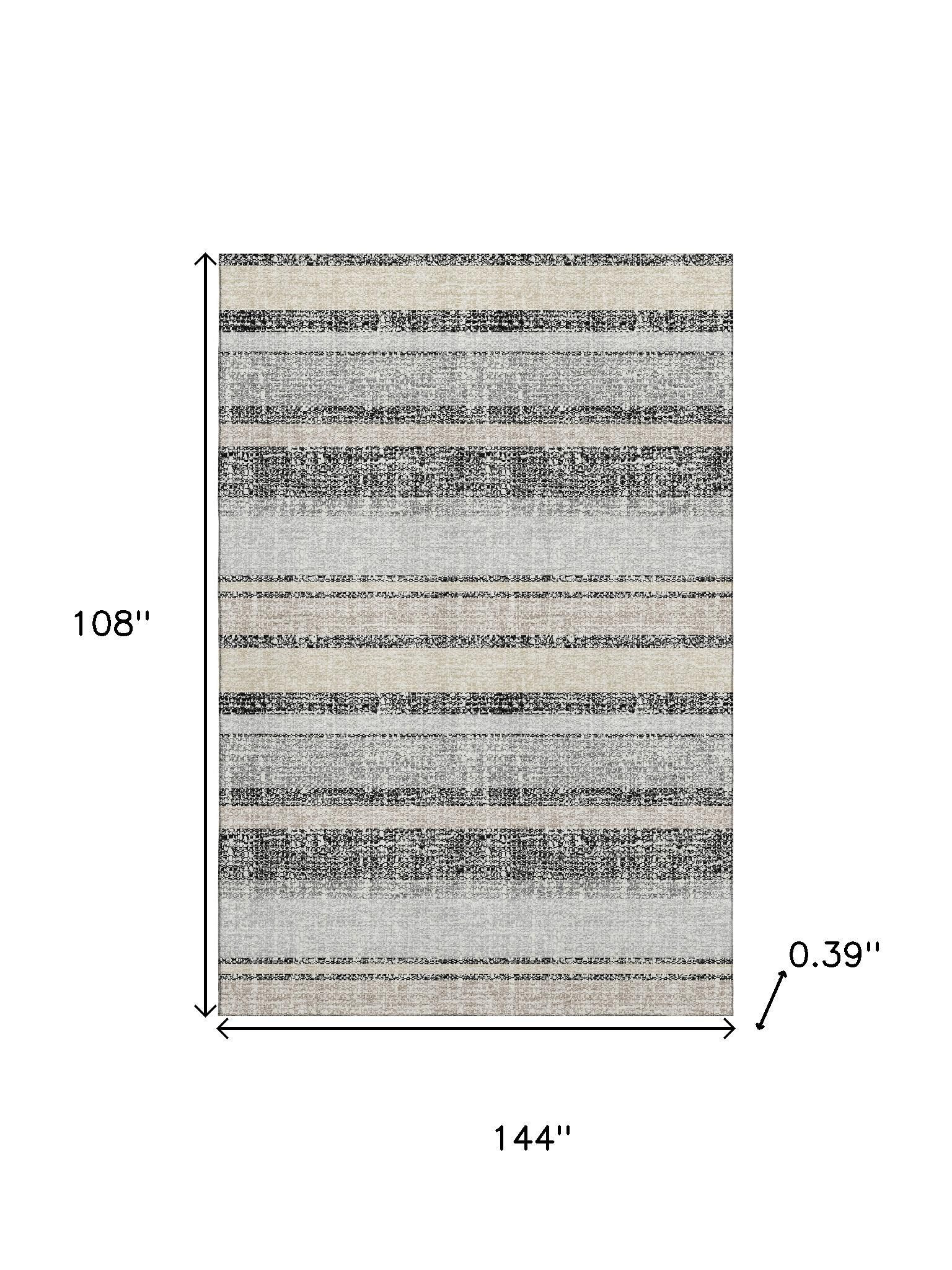 Add some artistry to your room with this 9-foot x 12-foot black and beige striped washable area rug with uv protection. Ideal for spaces with kids and pets, this rug is stain resistant to help repel dirt and spilled liquids. Built to last, this rug crafted from polyester fibers is known for its durability and long lasting appeal. Rugs are a great way to showcase your style, hide imperfections, warm your home and reduce noise. This larger sized, transitional styled rug is ready to create a focal point or statement piece in your room. 108.00-inch h x 144.00-inch w x 0.39-inch d.