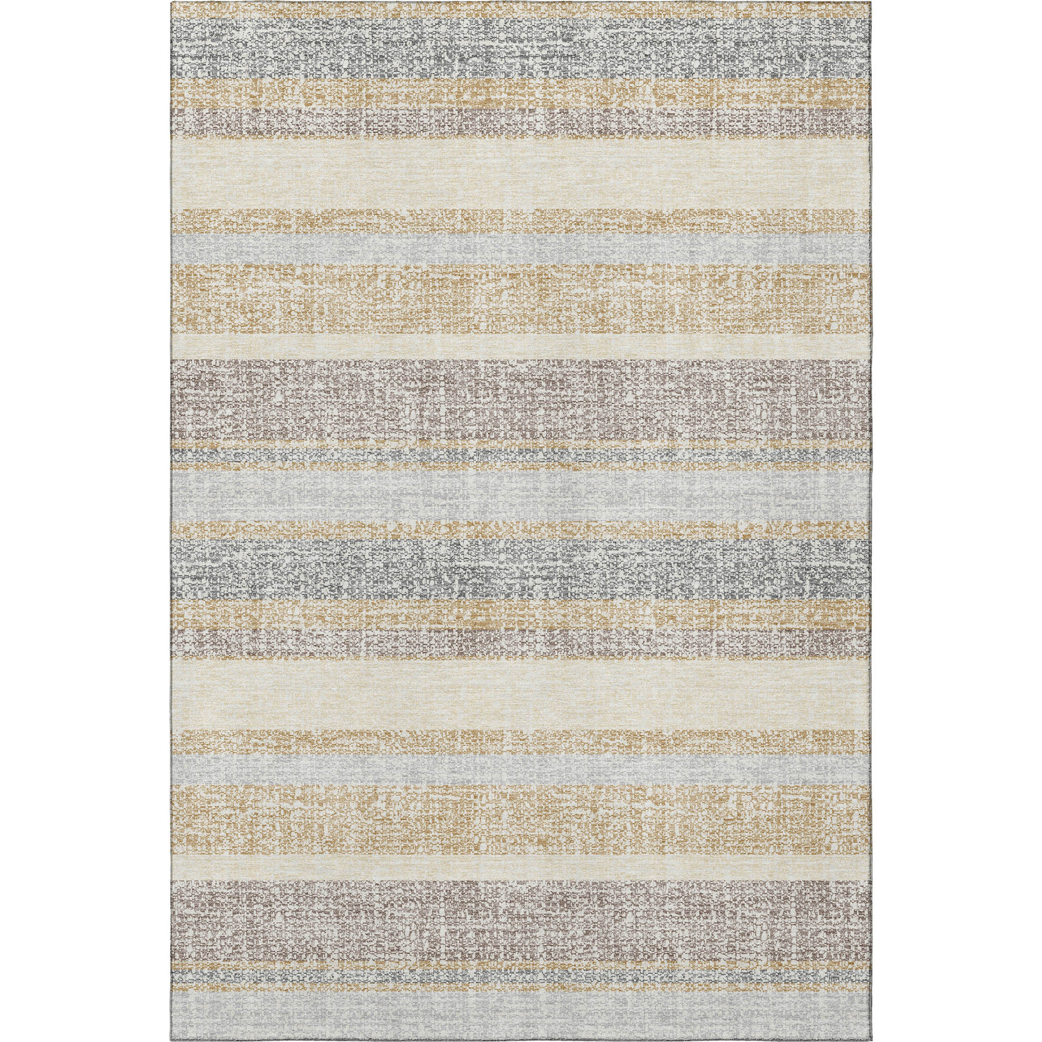 This 5-foot x 8-foot gold and beige striped washable area rug with uv protection, is a great way to add warmth to a room. Ideal for spaces with kids and pets, this rug is stain resistant to help repel dirt and spilled liquids. Built to last, this rug crafted from polyester fibers is known for its durability and long lasting appeal. Rugs are a great way to showcase your style, hide imperfections, warm your home and reduce noise. This larger sized, transitional styled rug is ready to create a focal point or statement piece in your room. 60.00-inch h x 90.00-inch w x 0.39-inch d.