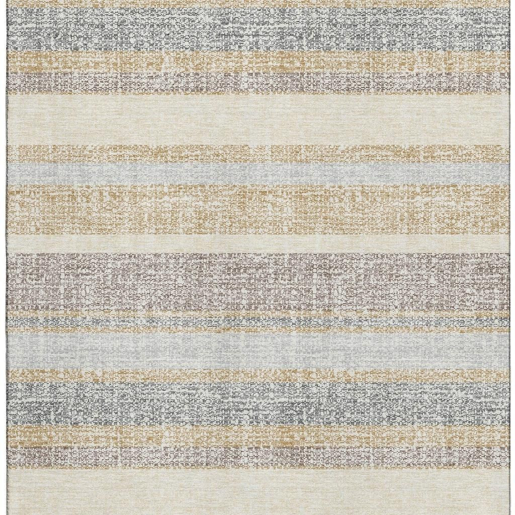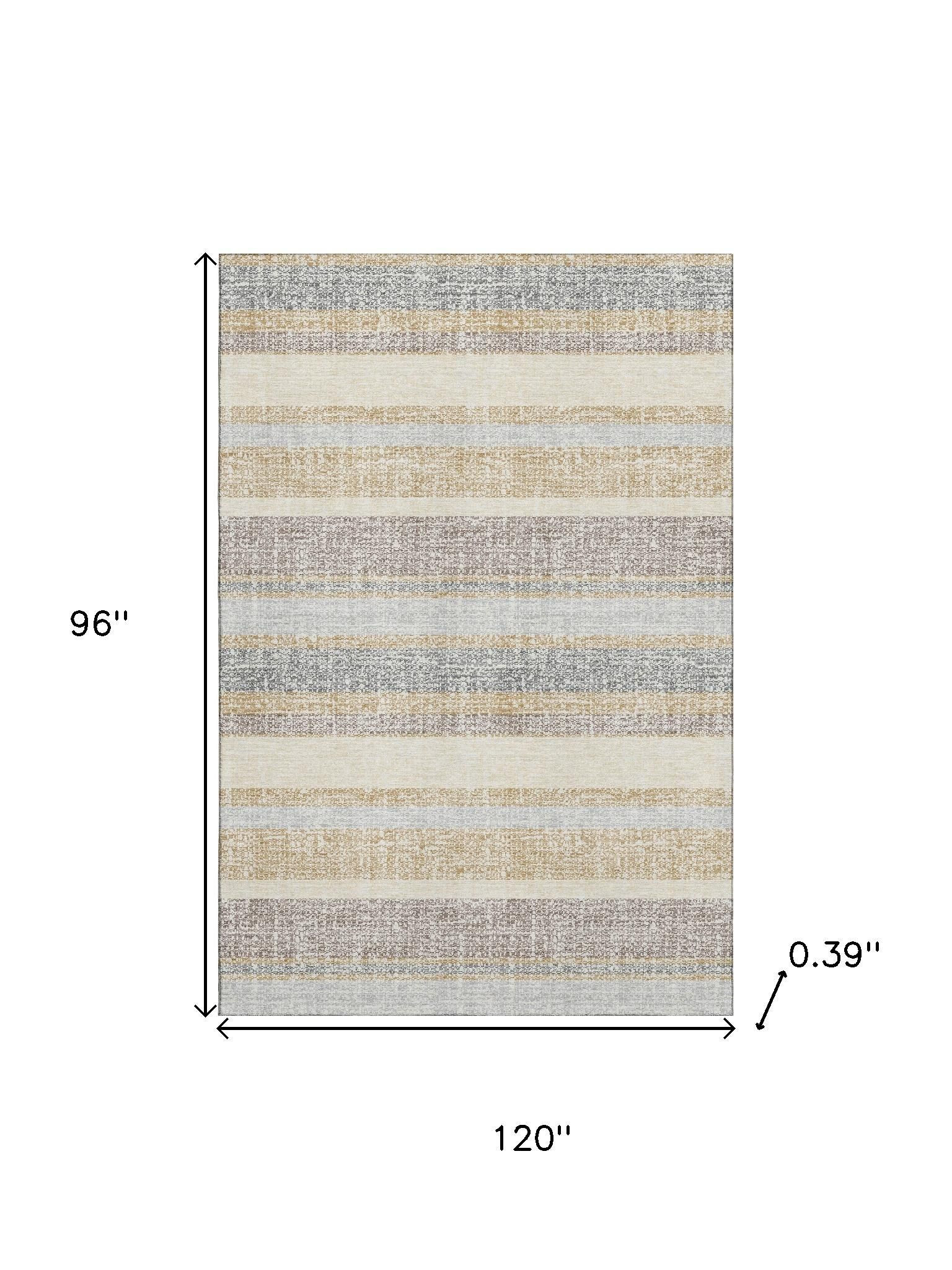 Add great coloration and comfortable texture to your space with this 8-foot x 10-foot gold and beige striped washable area rug with uv protection. Ideal for spaces with kids and pets, this rug is stain resistant to help repel dirt and spilled liquids. Built to last, this rug crafted from polyester fibers is known for its durability and long lasting appeal. Rugs are a great way to showcase your style, hide imperfections, warm your home and reduce noise. This larger sized, transitional styled rug is ready to create a focal point or statement piece in your room. 96.00-inch h x 120.00-inch w x 0.39-inch d.