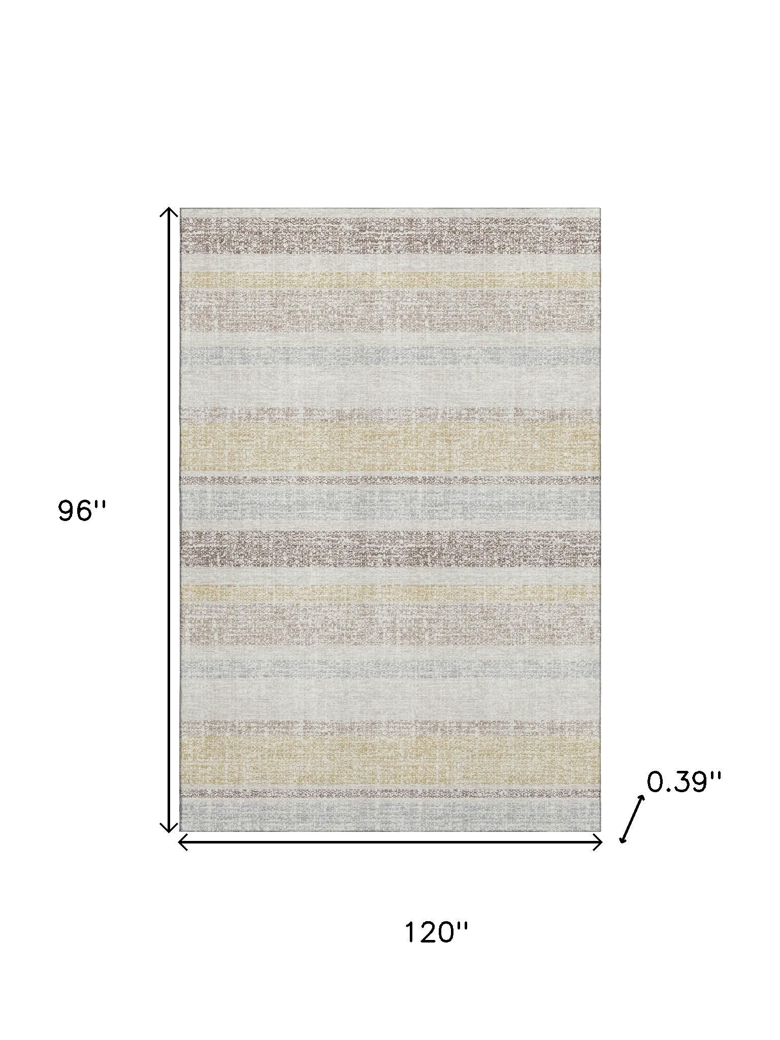 Set an inviting tone in your space with this 8-foot x 10-foot ivory and beige striped washable area rug with uv protection. Ideal for spaces with kids and pets, this rug is stain resistant to help repel dirt and spilled liquids. Built to last, this rug crafted from polyester fibers is known for its durability and long lasting appeal. Rugs are a great way to showcase your style, hide imperfections, warm your home and reduce noise. This larger sized, transitional styled rug is ready to create a focal point or statement piece in your room. 96.00-inch h x 120.00-inch w x 0.39-inch d.