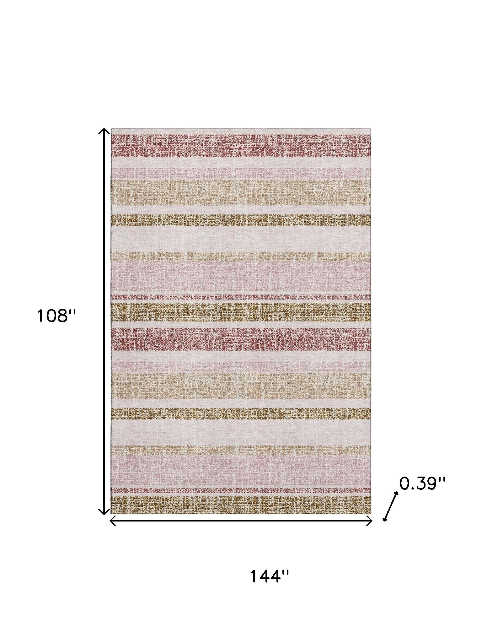 Add great coloration and comfortable texture to your space with this 9-foot x 12-foot pink and beige striped washable area rug with uv protection. Ideal for spaces with kids and pets, this rug is stain resistant to help repel dirt and spilled liquids. Built to last, this rug crafted from polyester fibers is known for its durability and long lasting appeal. Rugs are a great way to showcase your style, hide imperfections, warm your home and reduce noise. This larger sized, transitional styled rug is ready to create a focal point or statement piece in your room. 108.00-inch h x 144.00-inch w x 0.39-inch d.