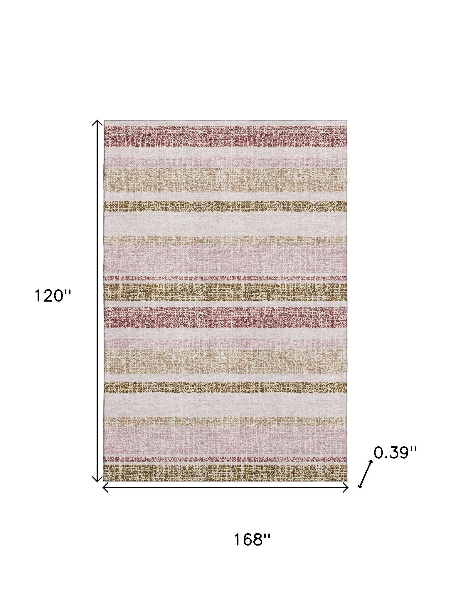 This 10-foot x 14-foot pink and beige striped washable area rug with uv protection, is a great way to add warmth to a room. Ideal for spaces with kids and pets, this rug is stain resistant to help repel dirt and spilled liquids. Built to last, this rug crafted from polyester fibers is known for its durability and long lasting appeal. Rugs are a great way to showcase your style, hide imperfections, warm your home and reduce noise. This larger sized, transitional styled rug is ready to create a focal point or statement piece in your room. 120.00-inch h x 168.00-inch w x 0.39-inch d.