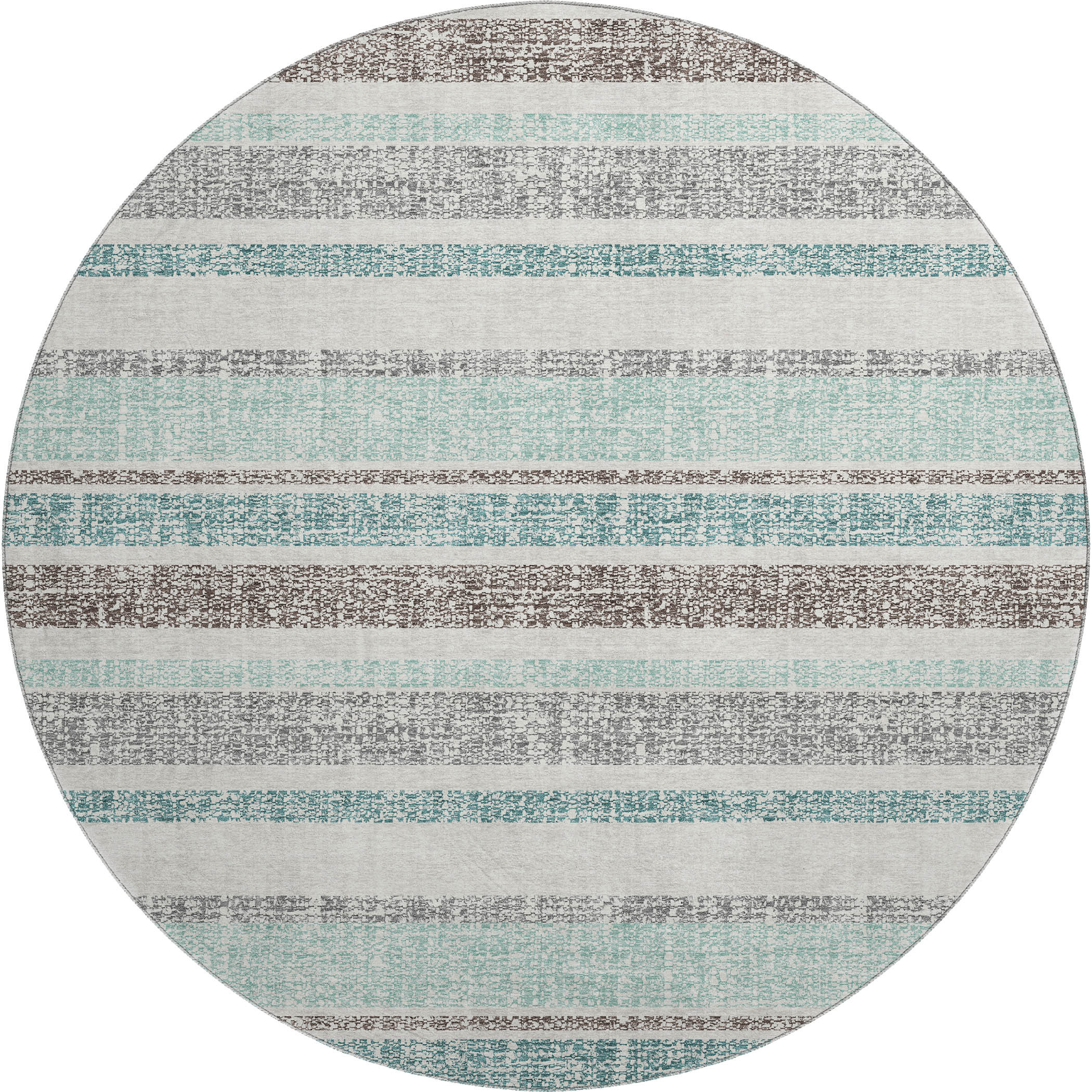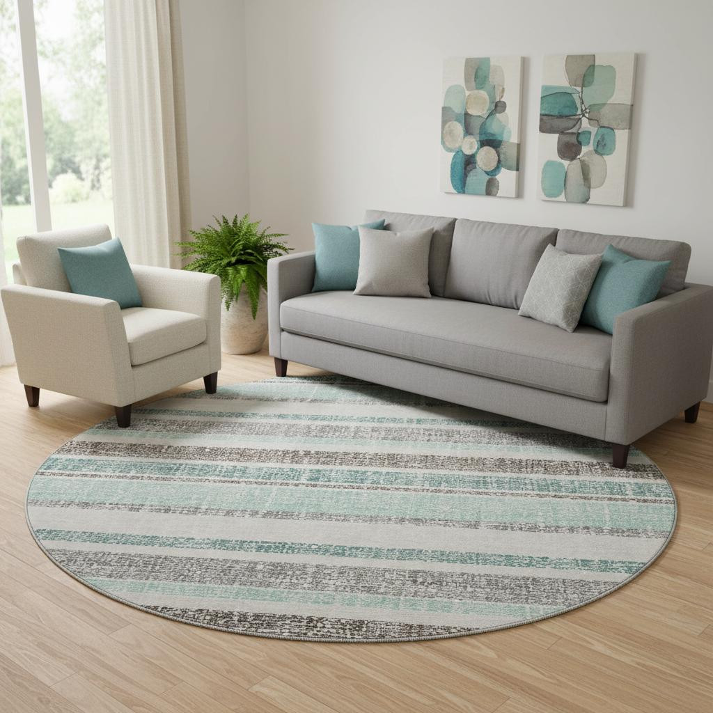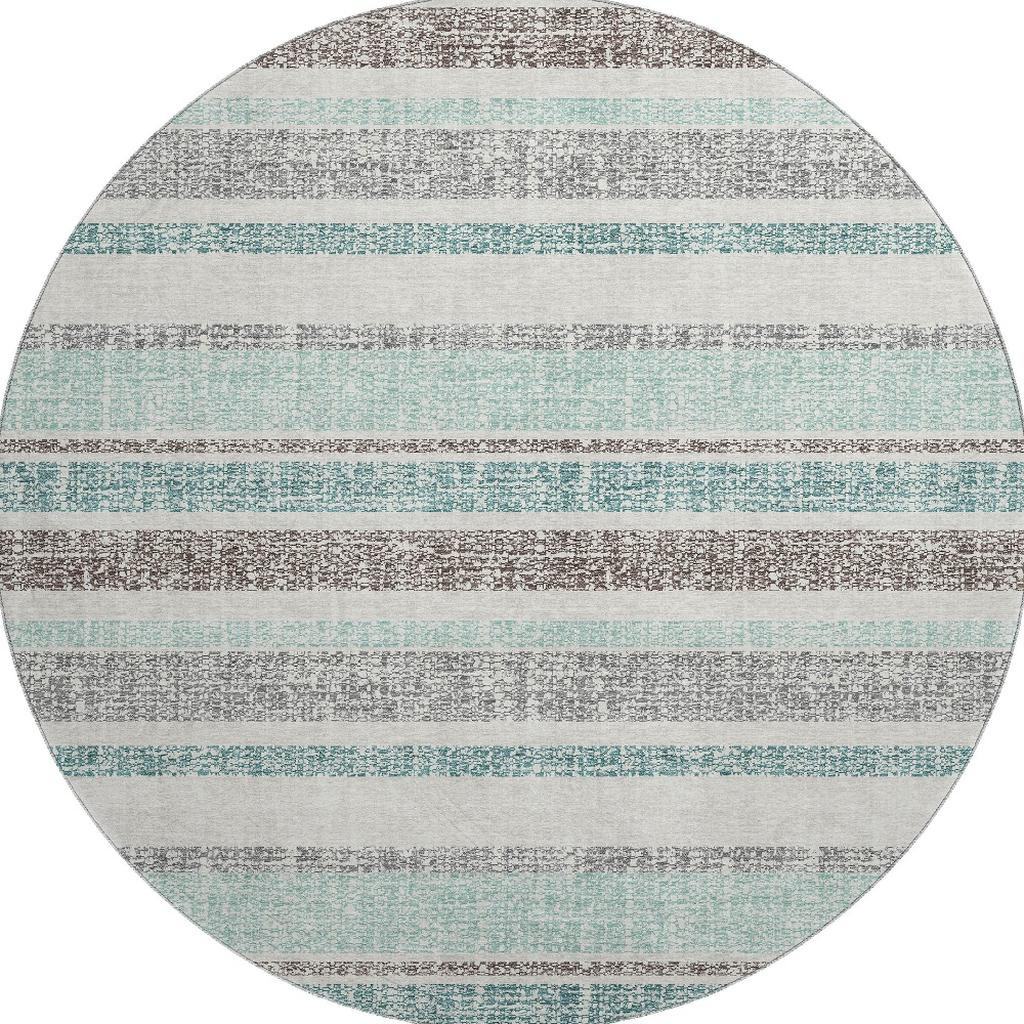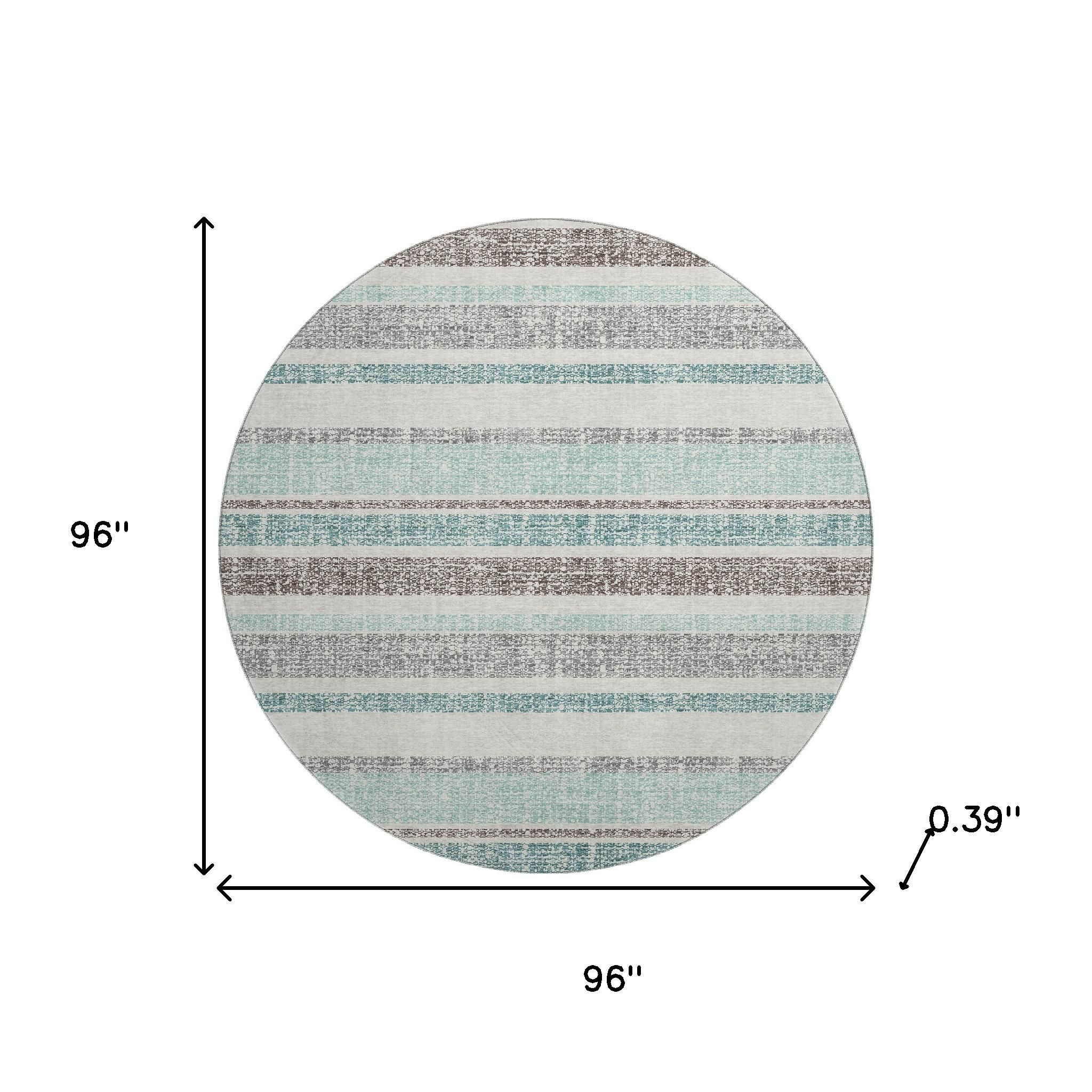 Set an inviting tone in your space with this 8-foot teal and gray striped washable round rug with uv protection. Ideal for spaces with kids and pets, this rug is stain resistant to help repel dirt and spilled liquids. Built to last, this rug crafted from polyester fibers is known for its durability and long lasting appeal. Rugs are a great way to showcase your style, hide imperfections, warm your home and reduce noise. This larger sized, transitional styled rug is ready to create a focal point or statement piece in your room. 96.00-inch h x 96.00-inch w x 0.39-inch d.
