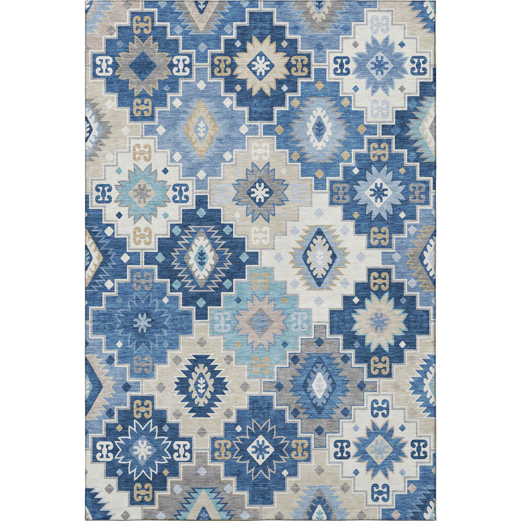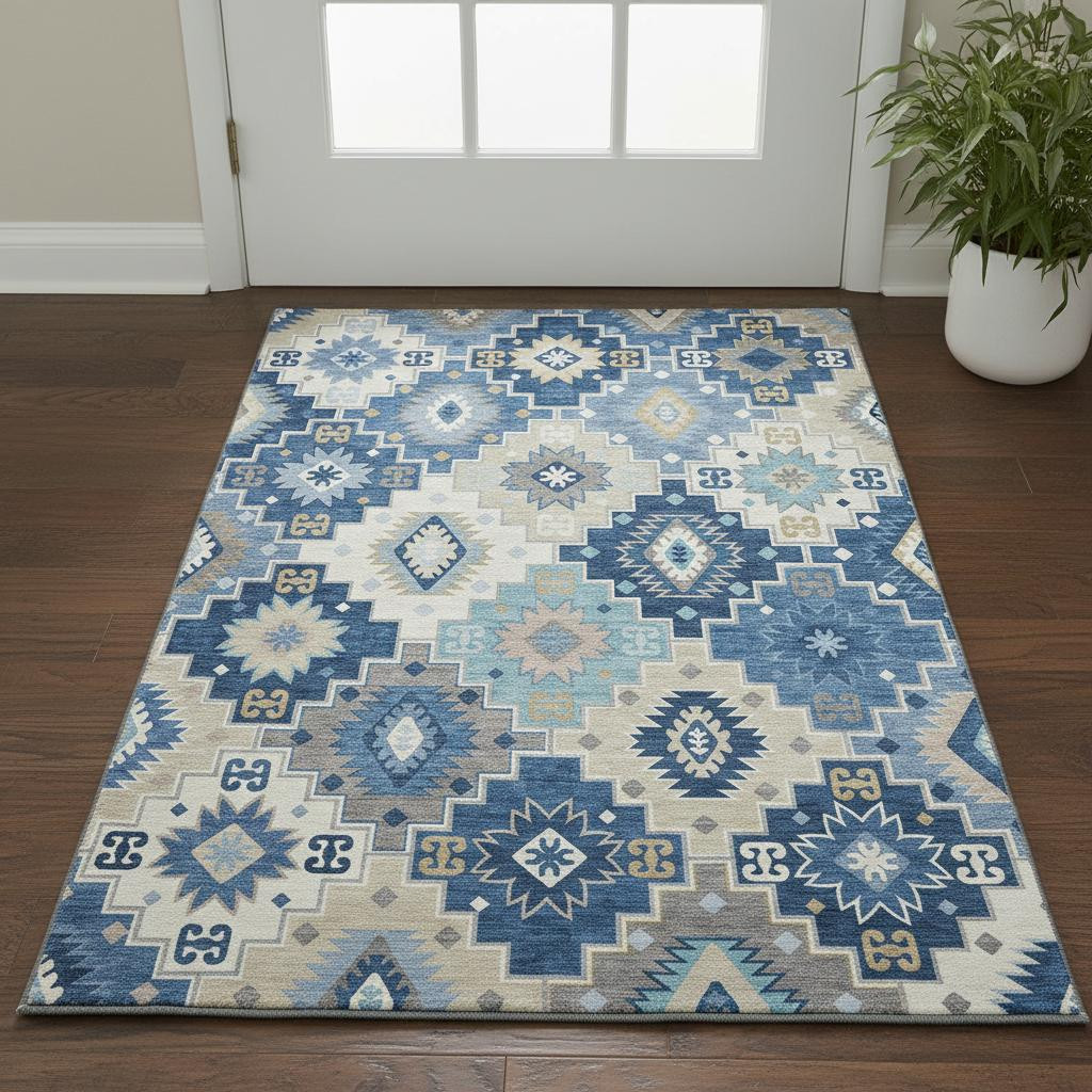 This 3-foot x 5-foot blue and beige geometric washable area rug with uv protection, is a great way to add warmth to a room. Ideal for spaces with kids and pets, this rug is stain resistant to help repel dirt and spilled liquids. Built to last, this rug crafted from polyester fibers is known for its durability and long lasting appeal. Rugs are a great way to showcase your style, hide imperfections, warm your home and reduce noise. This smaller sized, transitional styled rug is just what you need for your walkway, bedside, in front of door, cabinet, refrigerator, or chair. 36.00-inch h x 60.00-inch w x 0.39-inch d.