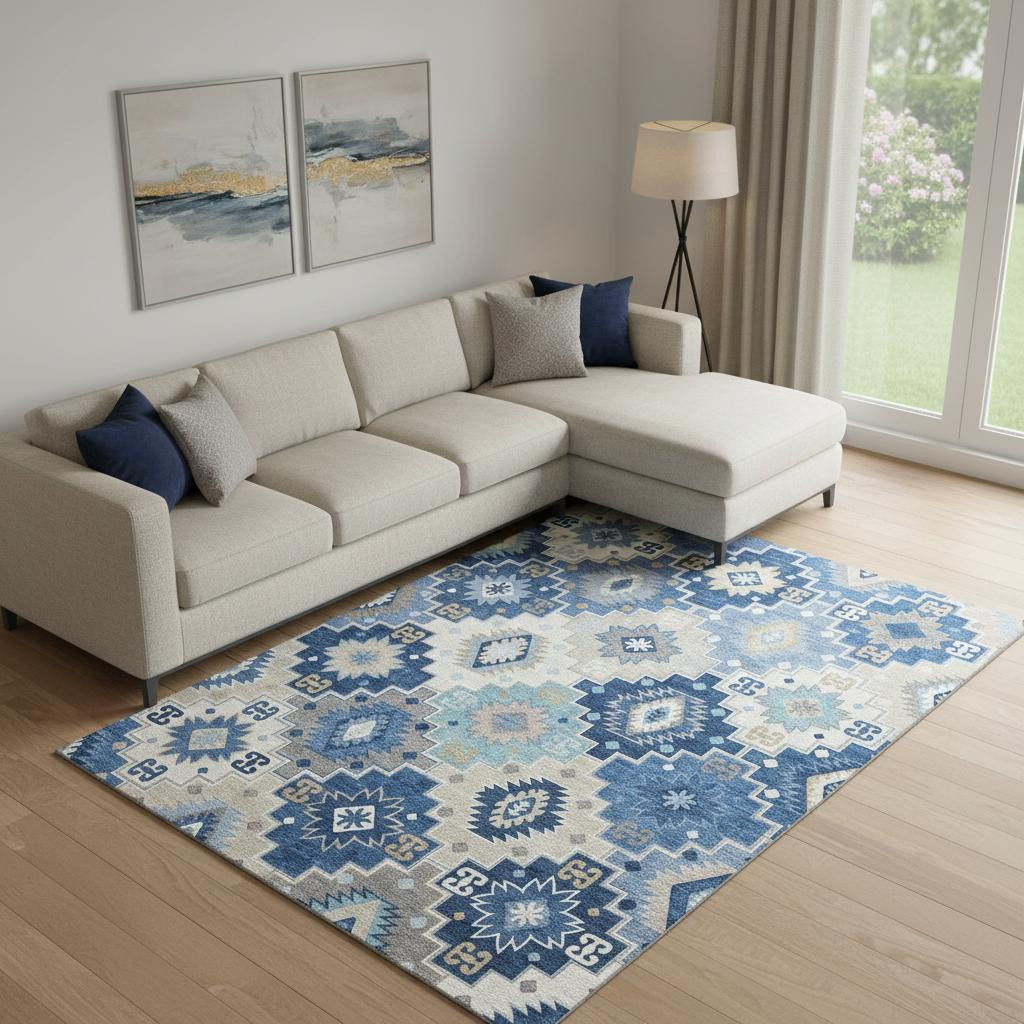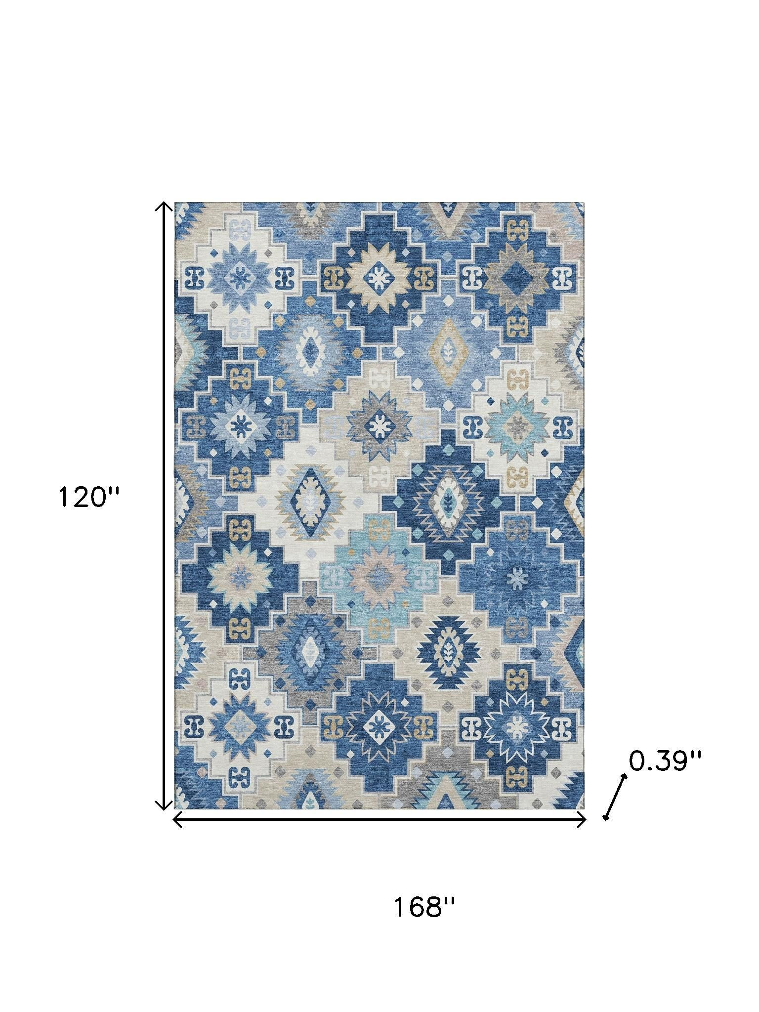 Add great coloration and comfortable texture to your space with this 10-foot x 14-foot blue and beige geometric washable area rug with uv protection. Ideal for spaces with kids and pets, this rug is stain resistant to help repel dirt and spilled liquids. Built to last, this rug crafted from polyester fibers is known for its durability and long lasting appeal. Rugs are a great way to showcase your style, hide imperfections, warm your home and reduce noise. This larger sized, transitional styled rug is ready to create a focal point or statement piece in your room. 120.00-inch h x 168.00-inch w x 0.39-inch d.