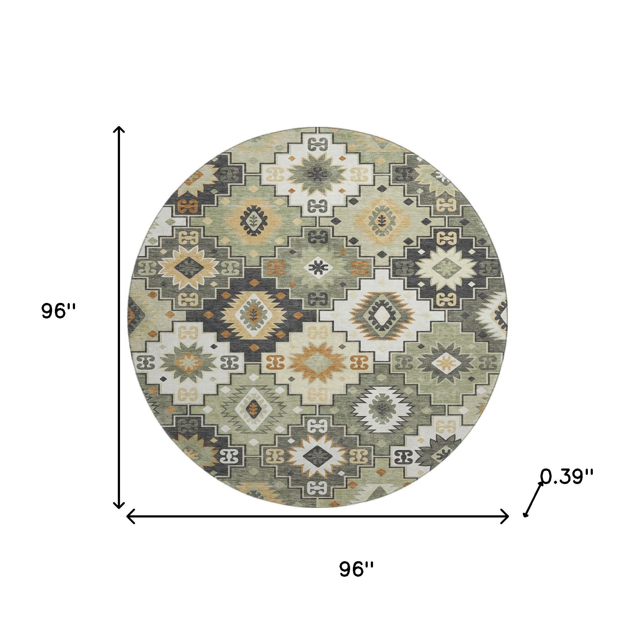 Add some artistry to your room with this 8-foot fern green and gold geometric washable round rug with uv protection. Ideal for spaces with kids and pets, this rug is stain resistant to help repel dirt and spilled liquids. Built to last, this rug crafted from polyester fibers is known for its durability and long lasting appeal. Rugs are a great way to showcase your style, hide imperfections, warm your home and reduce noise. This larger sized, transitional styled rug is ready to create a focal point or statement piece in your room. 96.00-inch h x 96.00-inch w x 0.39-inch d.