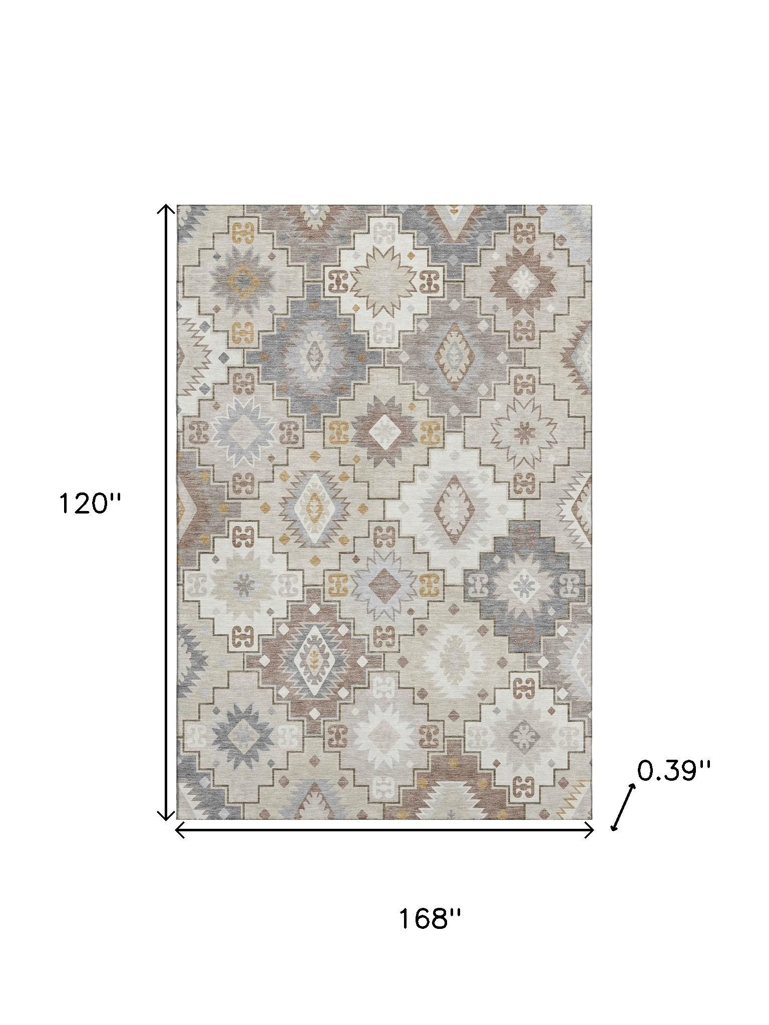 Add some artistry to your room with this 10-foot x 14-foot ivory and gray geometric washable area rug with uv protection. Ideal for spaces with kids and pets, this rug is stain resistant to help repel dirt and spilled liquids. Built to last, this rug crafted from polyester fibers is known for its durability and long lasting appeal. Rugs are a great way to showcase your style, hide imperfections, warm your home and reduce noise. This larger sized, transitional styled rug is ready to create a focal point or statement piece in your room. 120.00-inch h x 168.00-inch w x 0.39-inch d.