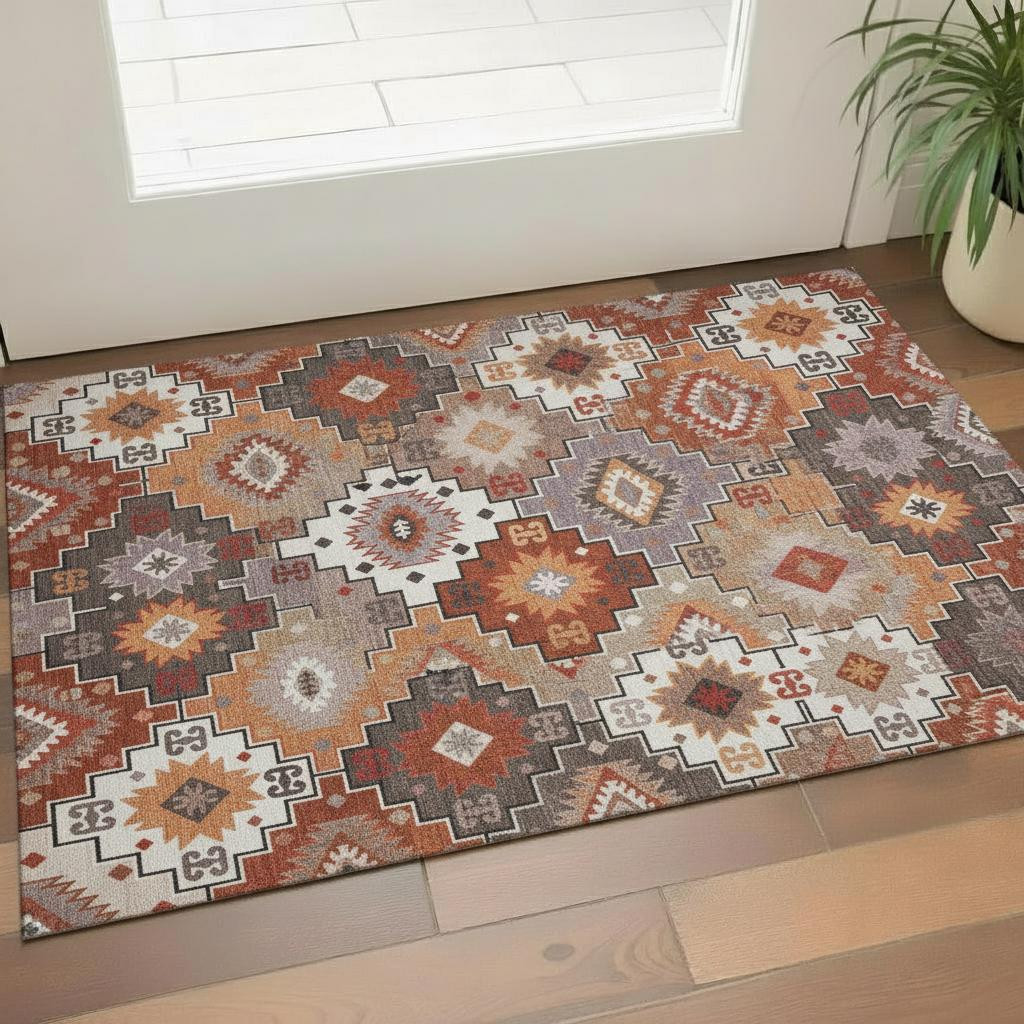 Set an inviting tone in your space with this 3-foot x 5-foot rust and lavender geometric washable area rug with uv protection. Ideal for spaces with kids and pets, this rug is stain resistant to help repel dirt and spilled liquids. Built to last, this rug crafted from polyester fibers is known for its durability and long lasting appeal. Rugs are a great way to showcase your style, hide imperfections, warm your home and reduce noise. This smaller sized, transitional styled rug is just what you need for your walkway, bedside, in front of door, cabinet, refrigerator, or chair. 36.00-inch h x 60.00-inch w x 0.39-inch d.