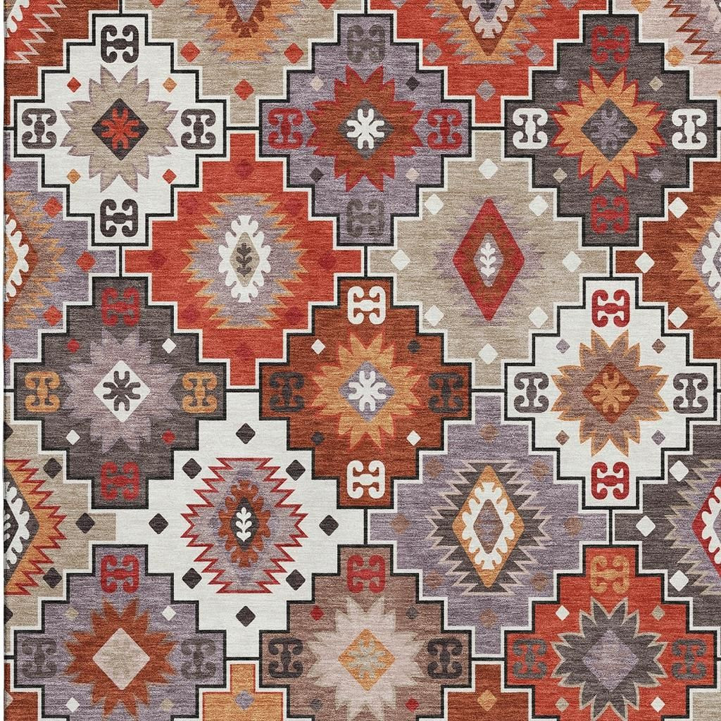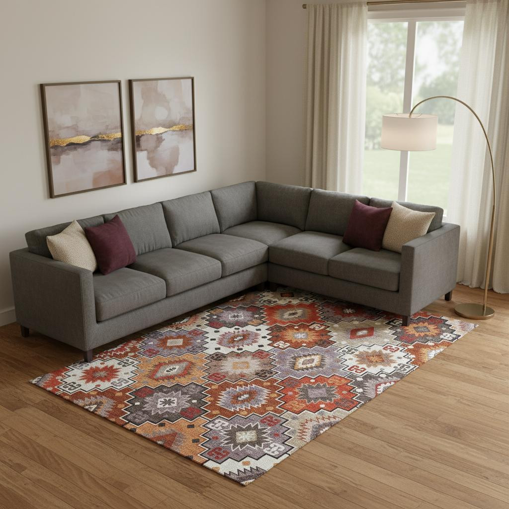 This 8-foot x 10-foot rust and lavender geometric washable area rug with uv protection, is a great way to add warmth to a room. Ideal for spaces with kids and pets, this rug is stain resistant to help repel dirt and spilled liquids. Built to last, this rug crafted from polyester fibers is known for its durability and long lasting appeal. Rugs are a great way to showcase your style, hide imperfections, warm your home and reduce noise. This larger sized, transitional styled rug is ready to create a focal point or statement piece in your room. 96.00-inch h x 120.00-inch w x 0.39-inch d.