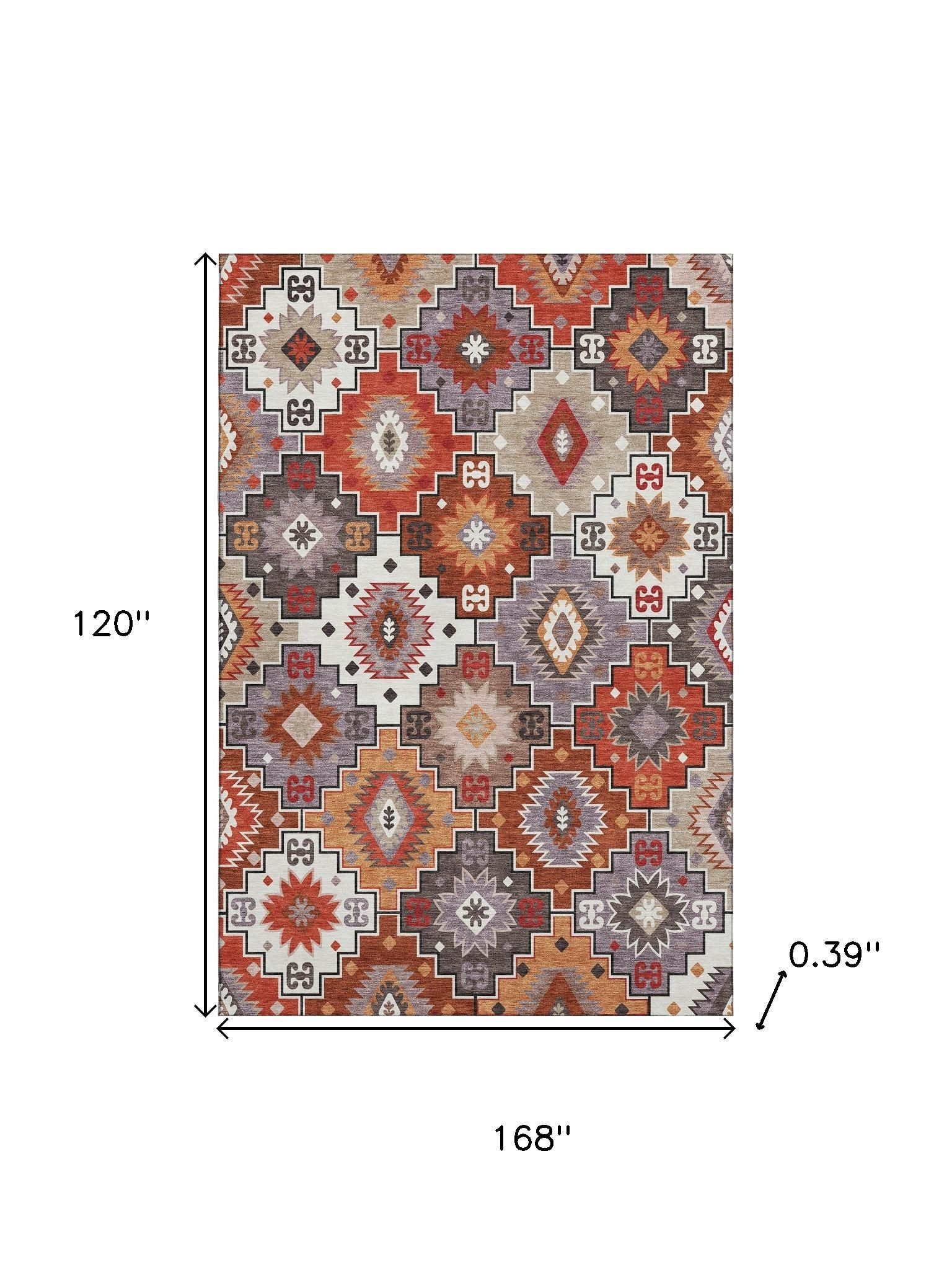 Add some artistry to your room with this 10-foot x 14-foot rust and lavender geometric washable area rug with uv protection. Ideal for spaces with kids and pets, this rug is stain resistant to help repel dirt and spilled liquids. Built to last, this rug crafted from polyester fibers is known for its durability and long lasting appeal. Rugs are a great way to showcase your style, hide imperfections, warm your home and reduce noise. This larger sized, transitional styled rug is ready to create a focal point or statement piece in your room. 120.00-inch h x 168.00-inch w x 0.39-inch d.