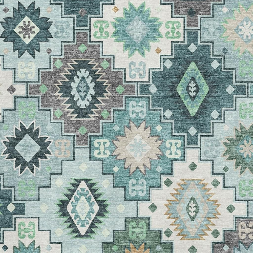 Add great coloration and comfortable texture to your space with this 3-foot x 5-foot teal and ivory geometric washable area rug with uv protection. Ideal for spaces with kids and pets, this rug is stain resistant to help repel dirt and spilled liquids. Built to last, this rug crafted from polyester fibers is known for its durability and long lasting appeal. Rugs are a great way to showcase your style, hide imperfections, warm your home and reduce noise. This smaller sized, transitional styled rug is just what you need for your walkway, bedside, in front of door, cabinet, refrigerator, or chair. 36.00-inch h x 60.00-inch w x 0.39-inch d.