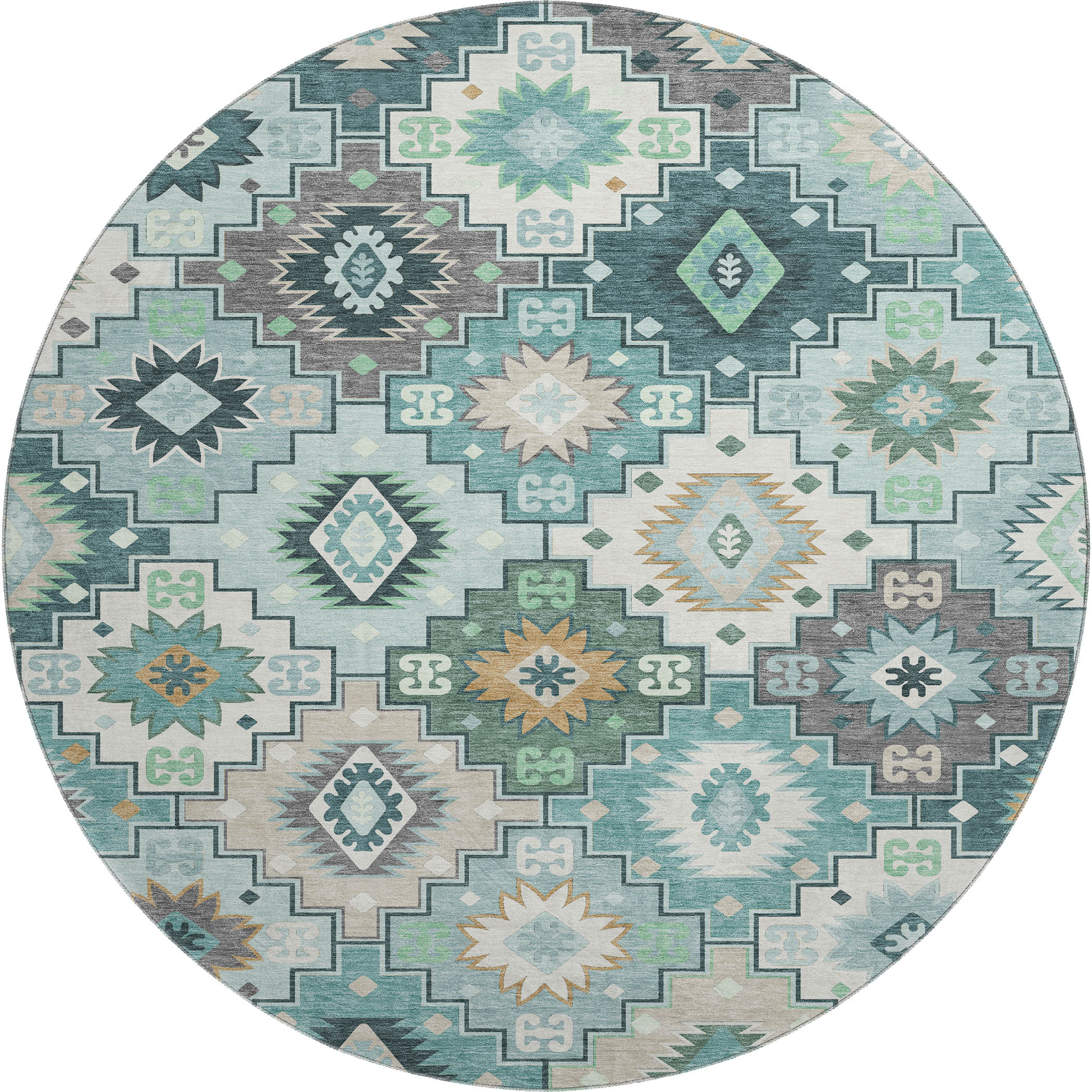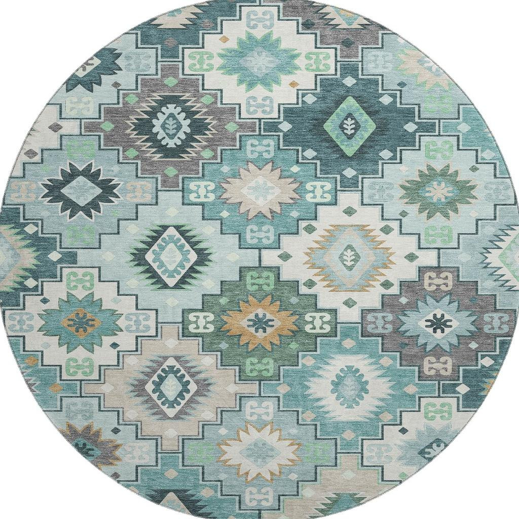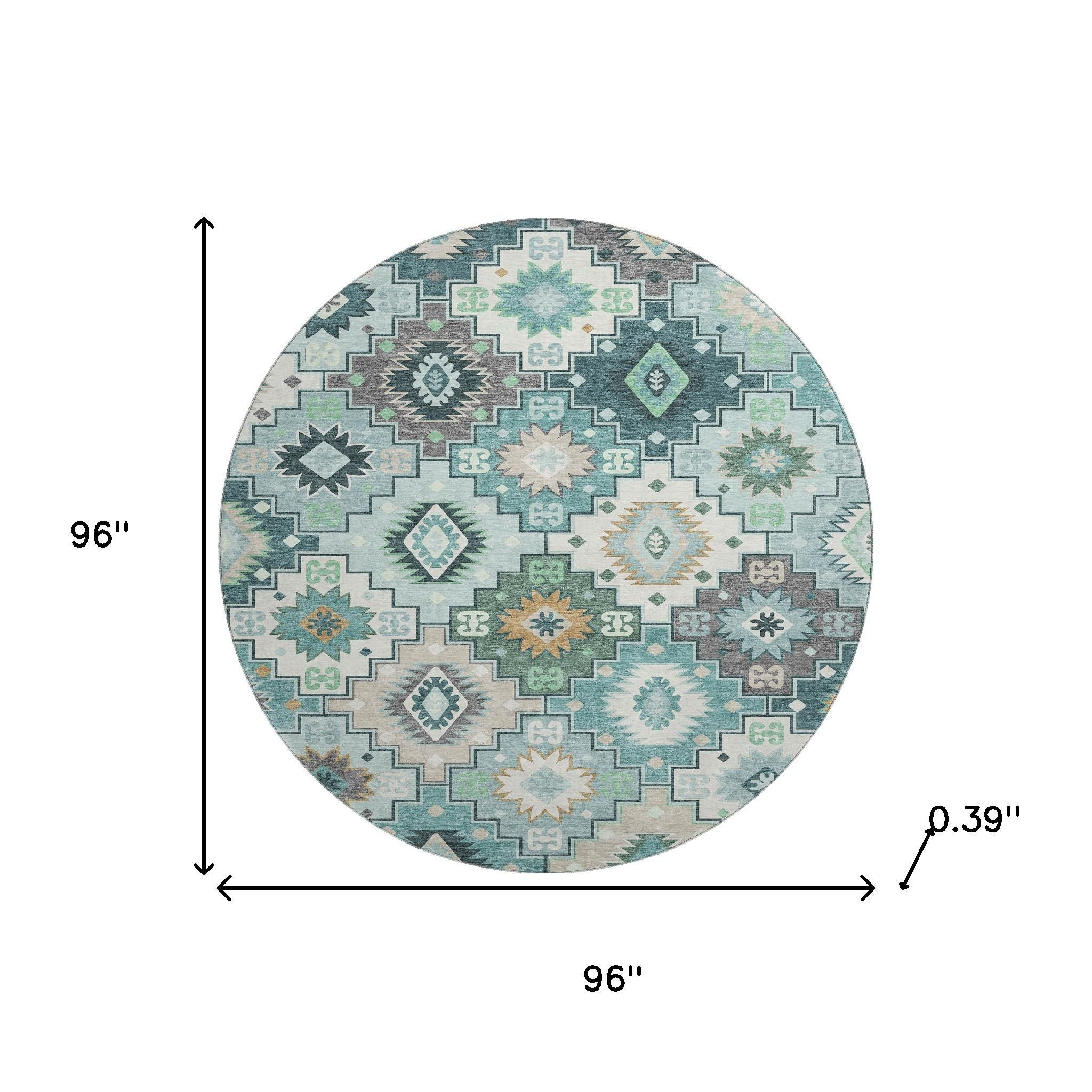 This 8-foot teal and ivory geometric washable round rug with uv protection, is a great way to add warmth to a room. Ideal for spaces with kids and pets, this rug is stain resistant to help repel dirt and spilled liquids. Built to last, this rug crafted from polyester fibers is known for its durability and long lasting appeal. Rugs are a great way to showcase your style, hide imperfections, warm your home and reduce noise. This larger sized, transitional styled rug is ready to create a focal point or statement piece in your room. 96.00-inch h x 96.00-inch w x 0.39-inch d.