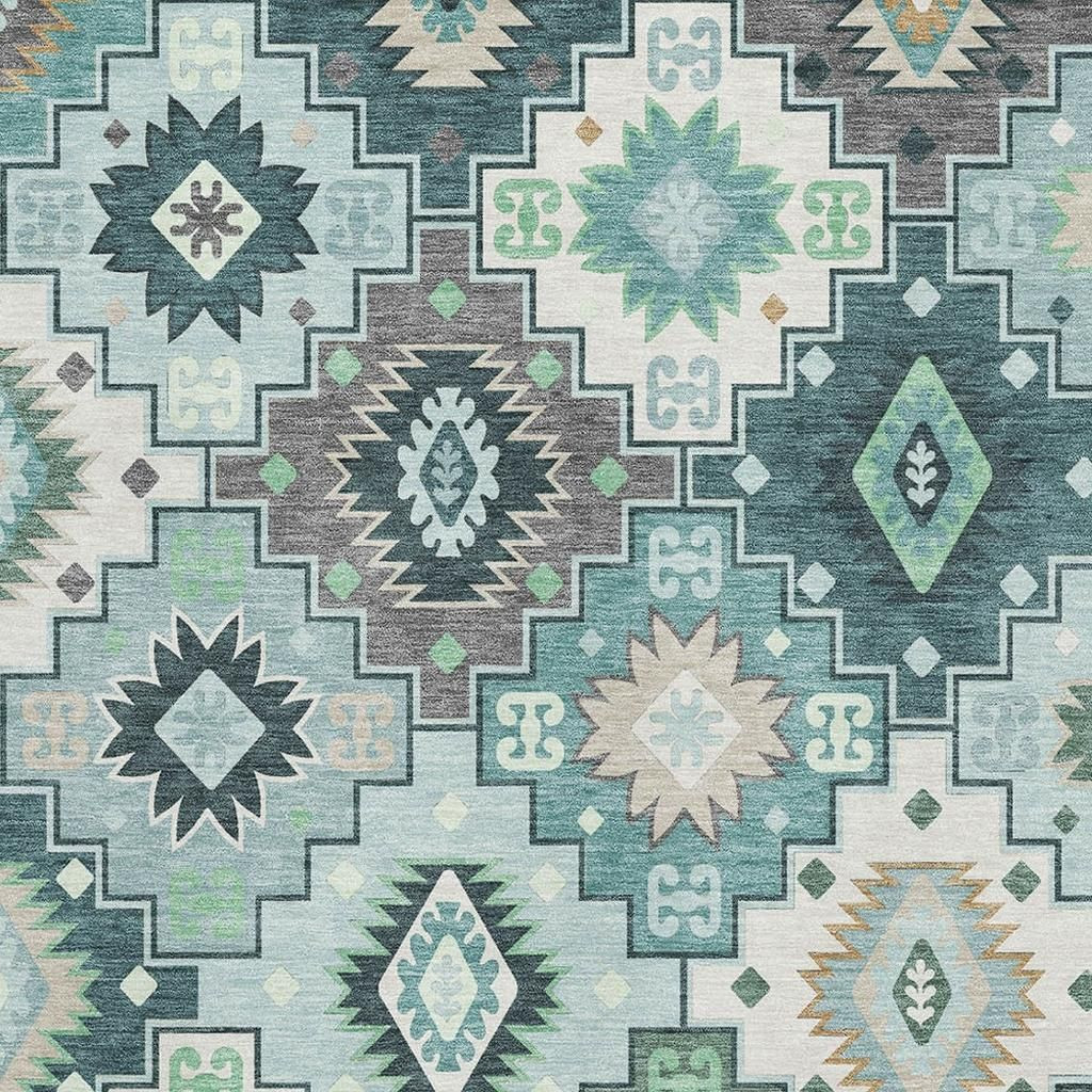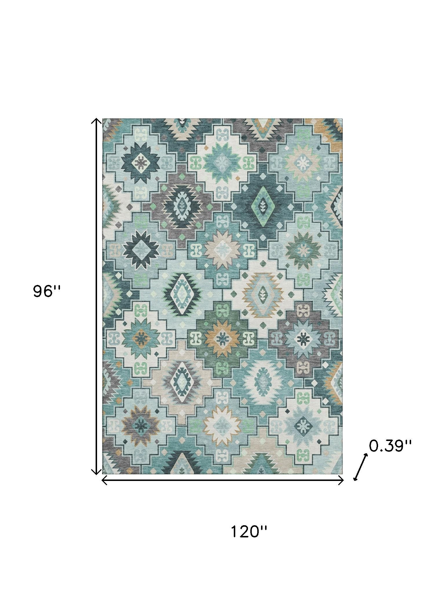 Set an inviting tone in your space with this 8-foot x 10-foot teal and ivory geometric washable area rug with uv protection. Ideal for spaces with kids and pets, this rug is stain resistant to help repel dirt and spilled liquids. Built to last, this rug crafted from polyester fibers is known for its durability and long lasting appeal. Rugs are a great way to showcase your style, hide imperfections, warm your home and reduce noise. This larger sized, transitional styled rug is ready to create a focal point or statement piece in your room. 96.00-inch h x 120.00-inch w x 0.39-inch d.